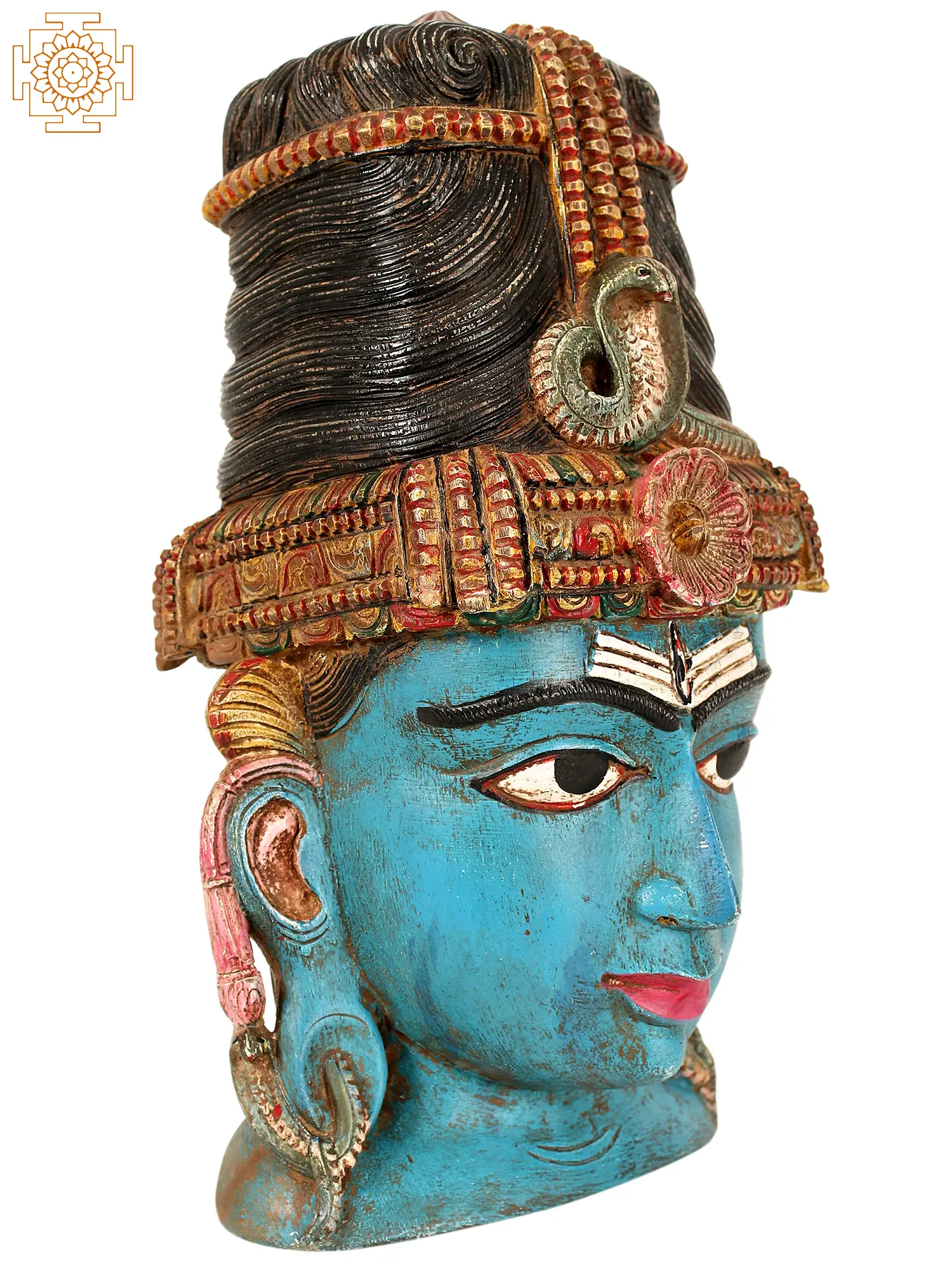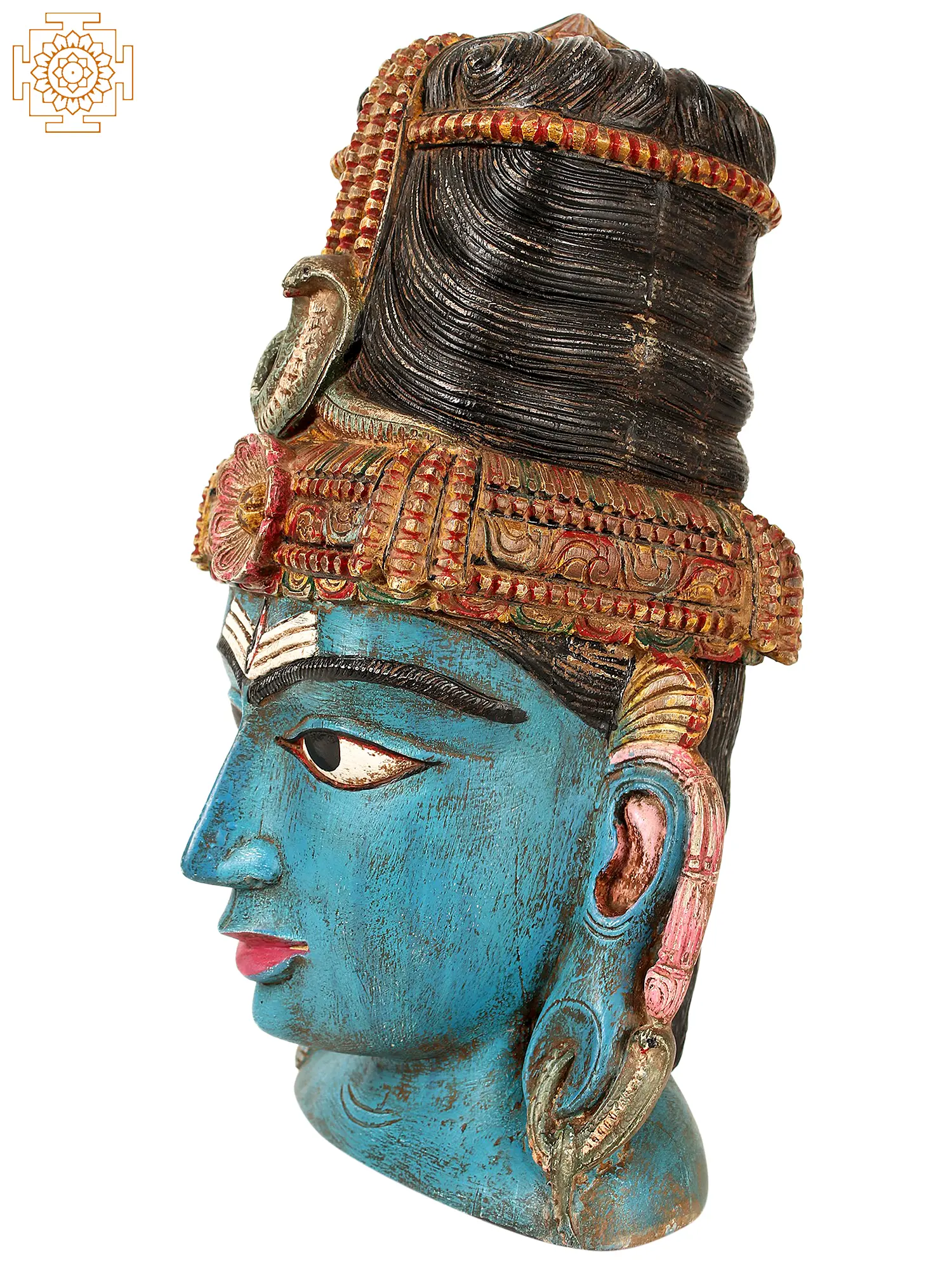 Invite the powerful presence of Mahadeva, the supreme deity in Hinduism, into your home with this exquisitely crafted wooden representation of his divine head. This striking piece captures the profound serenity and immense power associated with Lord Shiva, one of the principal deities of Hinduism. The vibrant blue hue of the face is traditionally symbolic of the cosmic ocean that Lord Shiva drank to save the world from destruction, turning his throat blue – hence his epithet, Neelkanth.