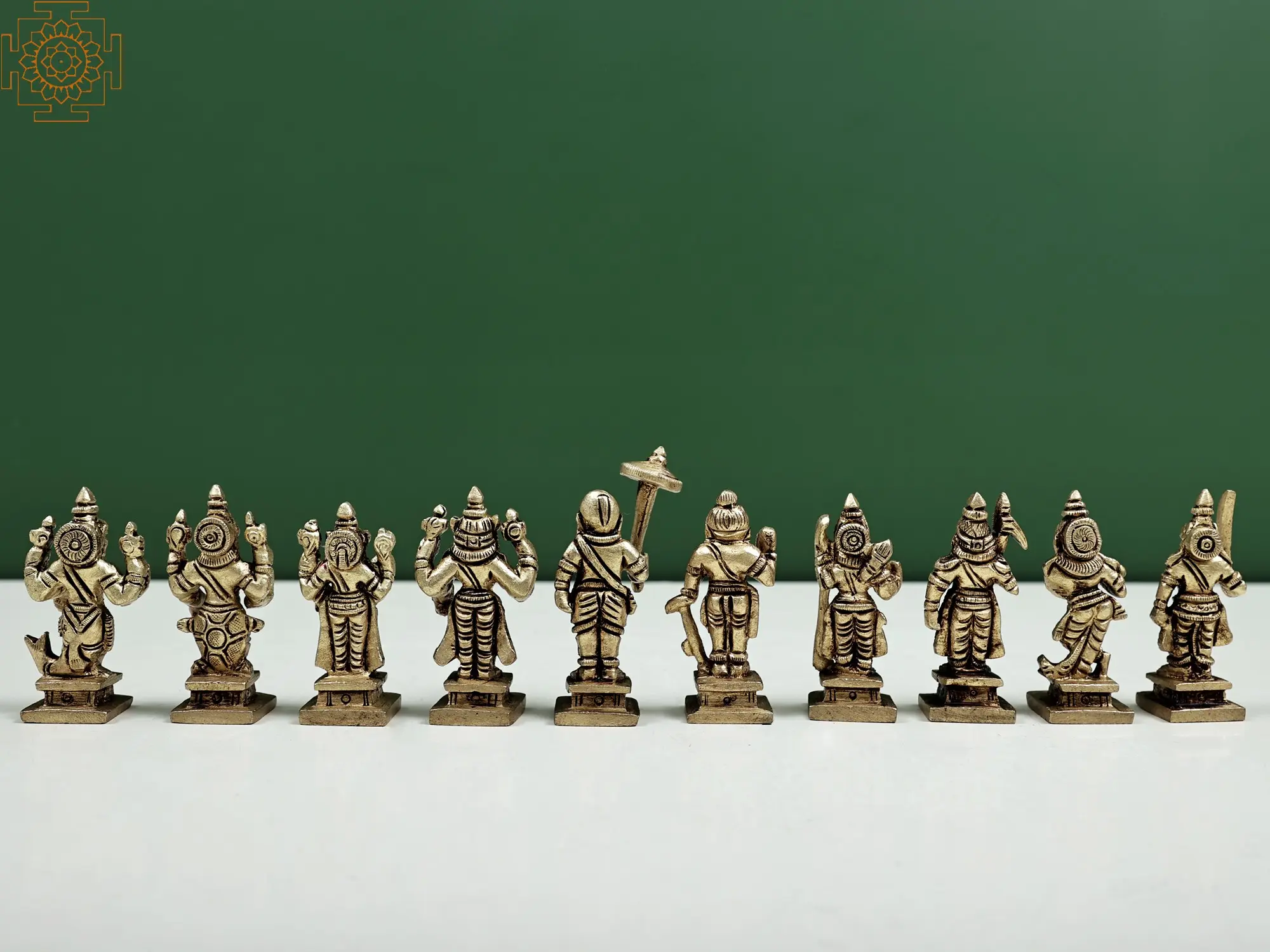 Crafted from durable and lustrous brass, each of these miniature figures is a testament to skilled artistry. The choice of brass not only lends an enduring quality to the statues but also imbues them with a traditional reverence, as brass is often associated with purity and auspiciousness in Hindu rituals. The intricate details, though small in scale, capture the essence of each avatar's form and symbolic attributes. These handmade pieces are not mere decorations but devotional objects, designed to inspire contemplation, devotion, and a deeper understanding of the divine play of the Dashavatar. Place them on your altar, bookshelf, or desk to invite spiritual energy and a sense of divine presence into your home or workspace. They make a meaningful gift for those who appreciate Hindu mythology, spiritual practices, or exquisite artisanal craftsmanship.