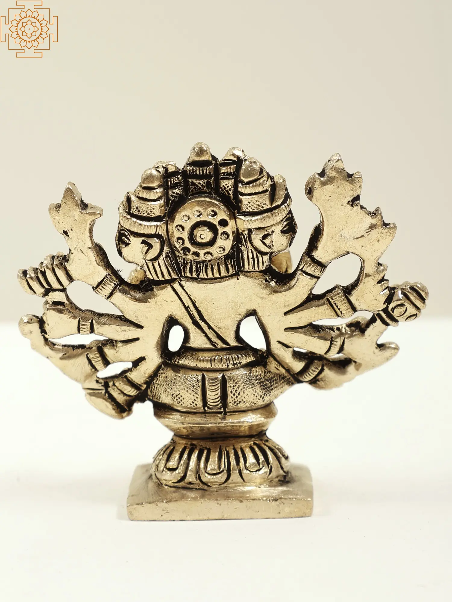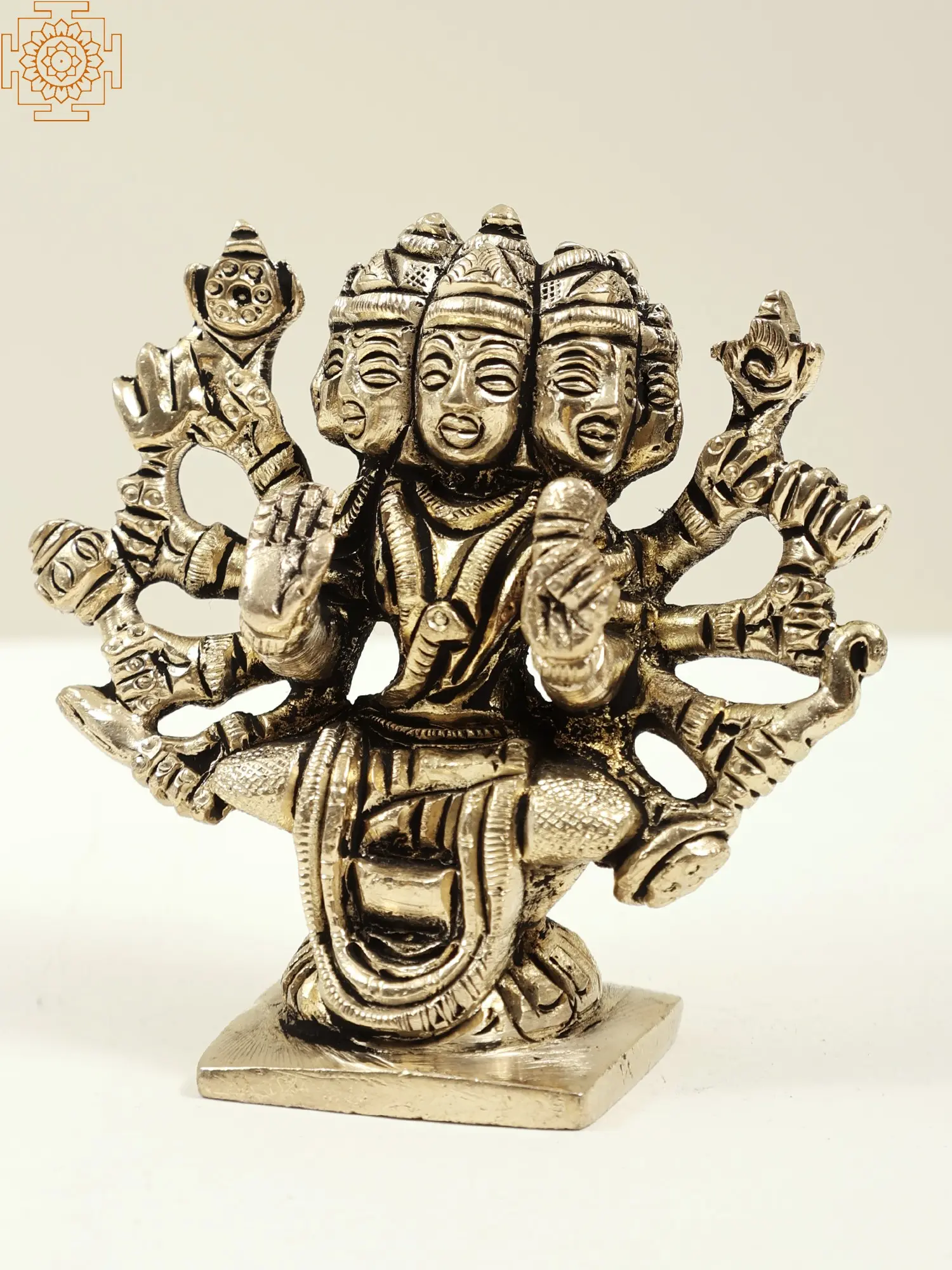 Vedamata Gayatri is represented in this small brass statue in her powerful Dashabhuja roopa, inspired by her illustrious presence in the Vedas- the ancient texts which are at the root of Indian culture. Panchamukhi (five-headed) and ten-armed, Devi Gayatri is enthroned on a miniature throne, blessing her devotees with her hand raised in Abhaya mudra.