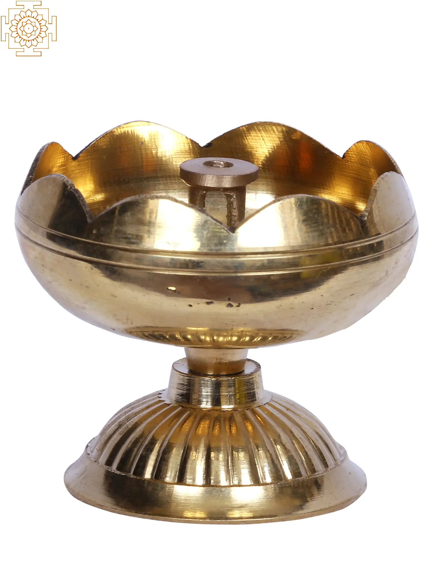 This unique brass lamp in the shape of a blooming flower on an elevated pedestal reflects the greatest degree of creativity. An Atma Diya with lovely petals across the body of the lamp looks like a flower. The oil basin is round and equipped with a nozzle wick. The lamp's body is highly polished and gleaming. Lighting this lamp will undoubtedly improve the appearance of the space due to its stunning appearance.