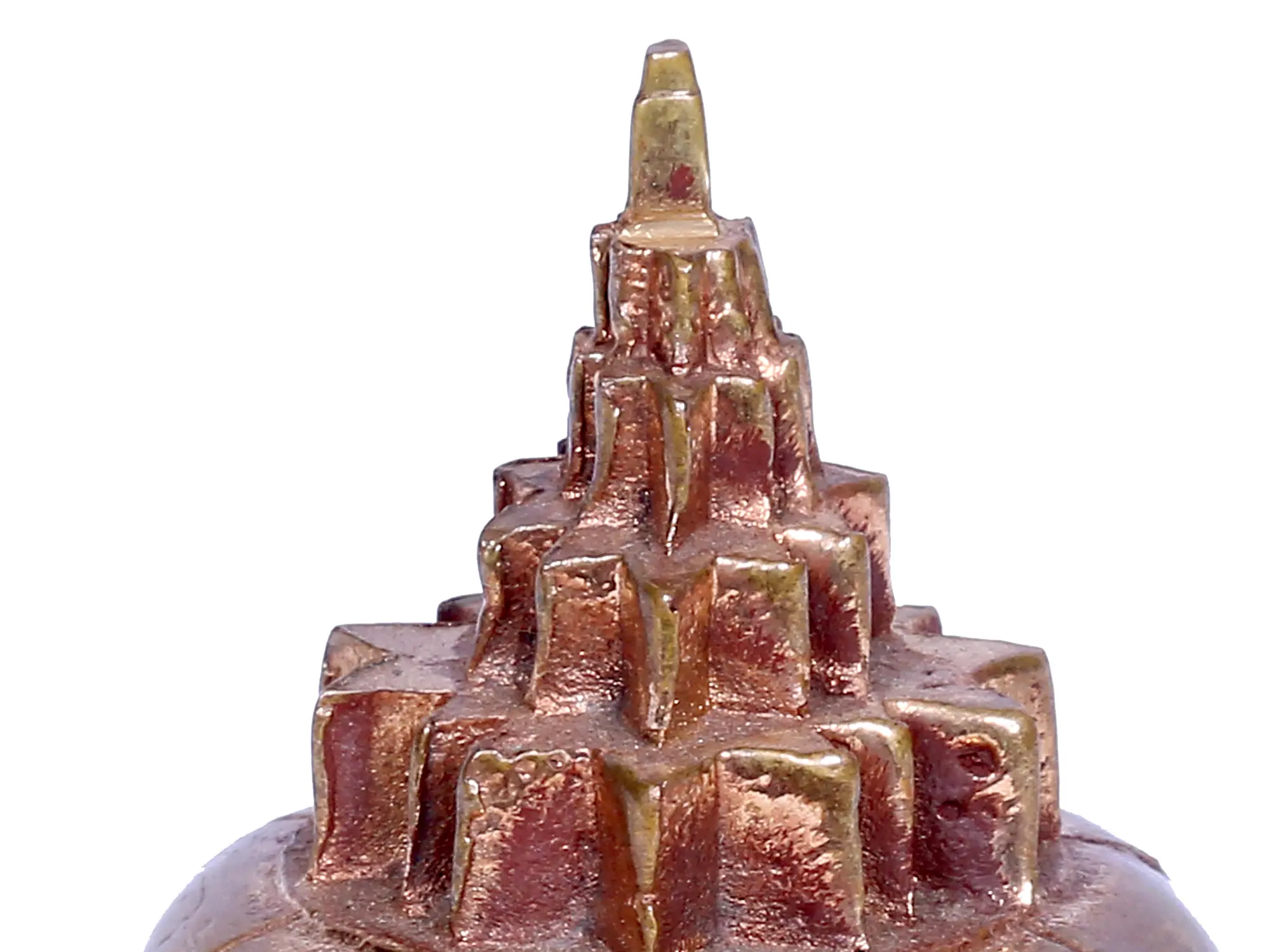 The Bronze Shri Yantra, known as the Maha Meru, is a mystical geometric diagram, revered in Hinduism. It symbolizes the universe's intricate web and the convergence of divine energies. The nine interlocking triangles, a union of Shiva and Shakti, represent creation and dissolution. The central point, the Bindu, signifies the absolute reality. Gazing upon this yantra is believed to unlock spiritual insights and awaken inner consciousness. It's a portal to the cosmos, where the seeker discovers the profound interconnectedness of all existence, transcending time and space.