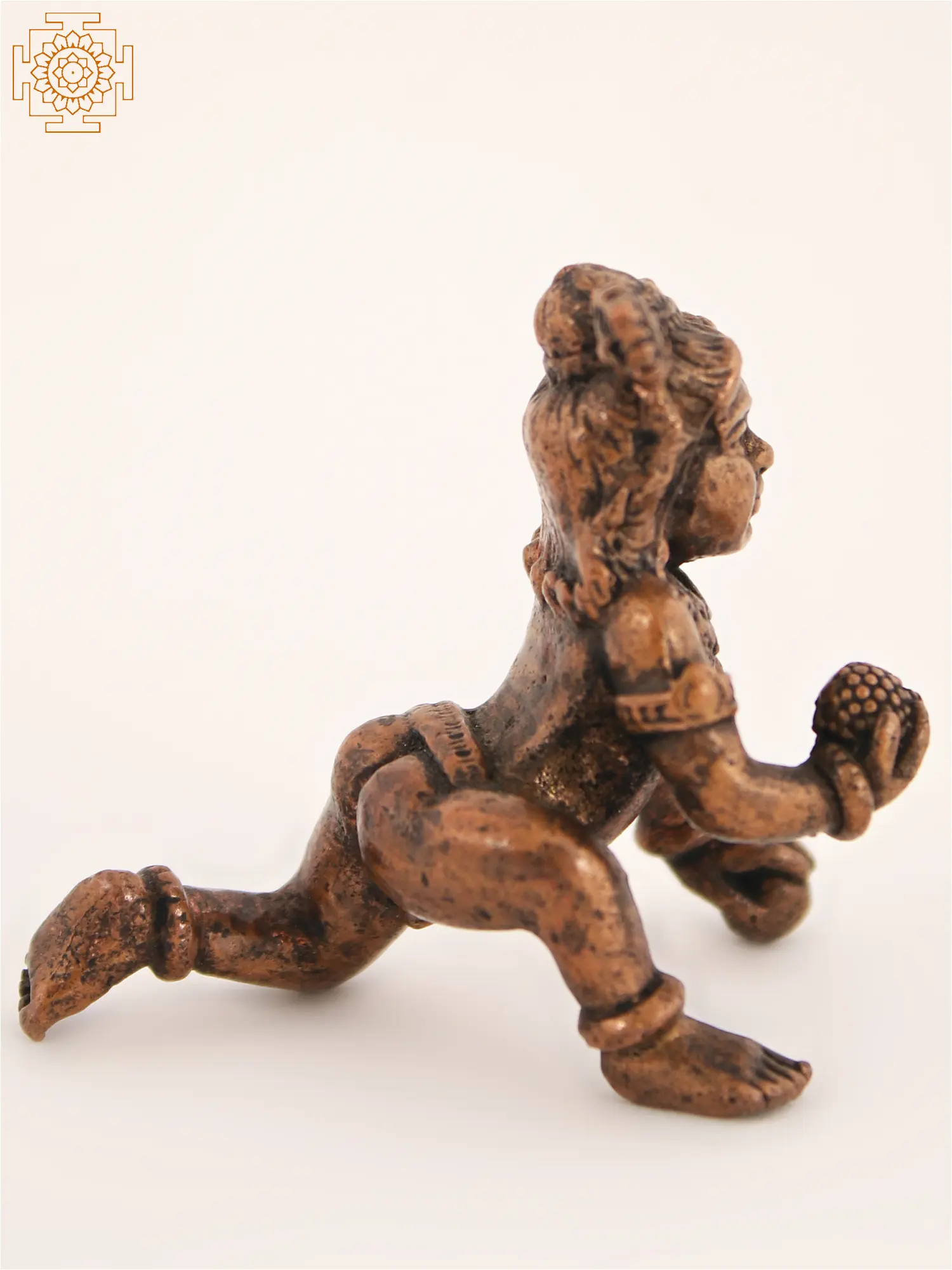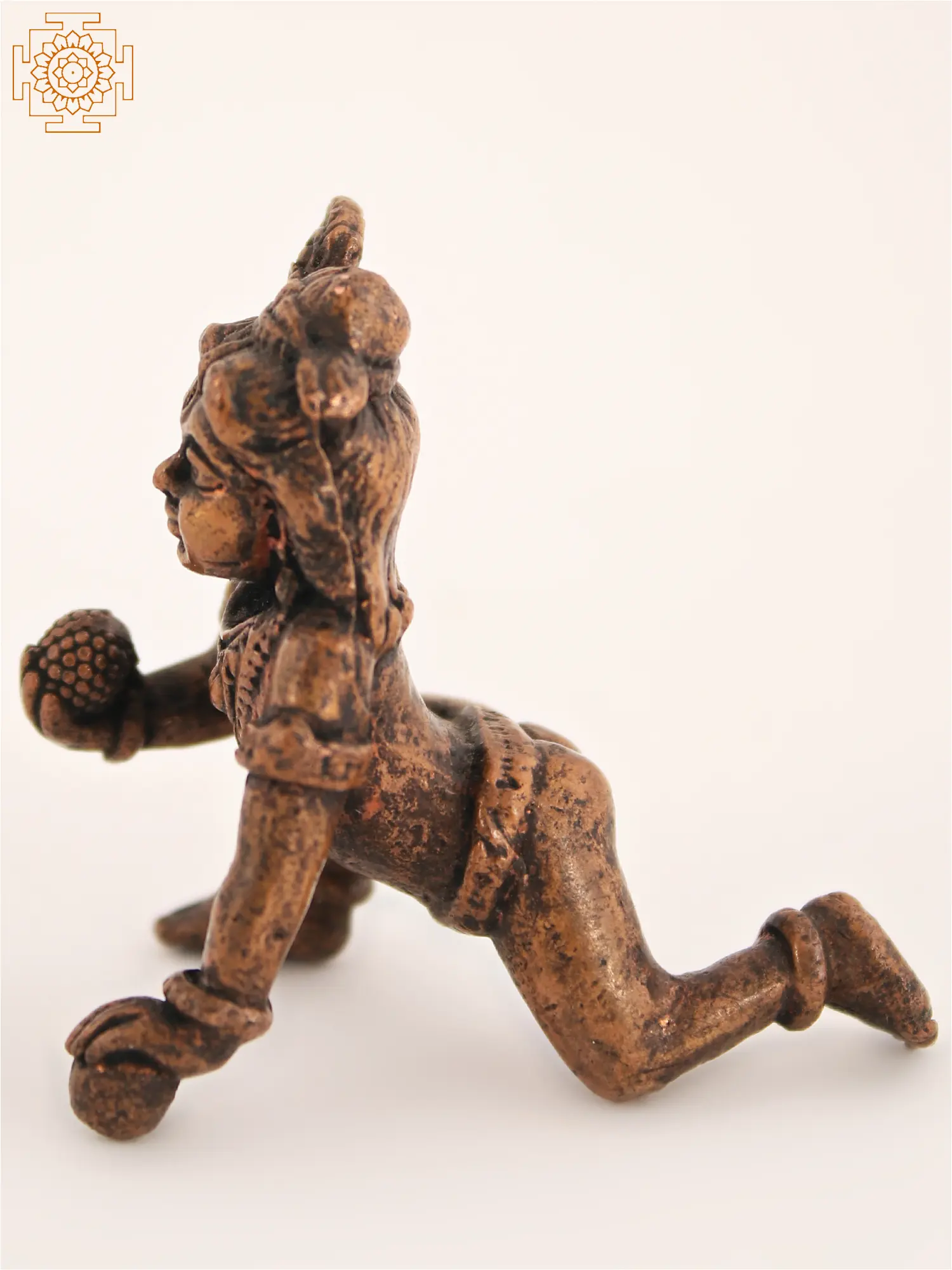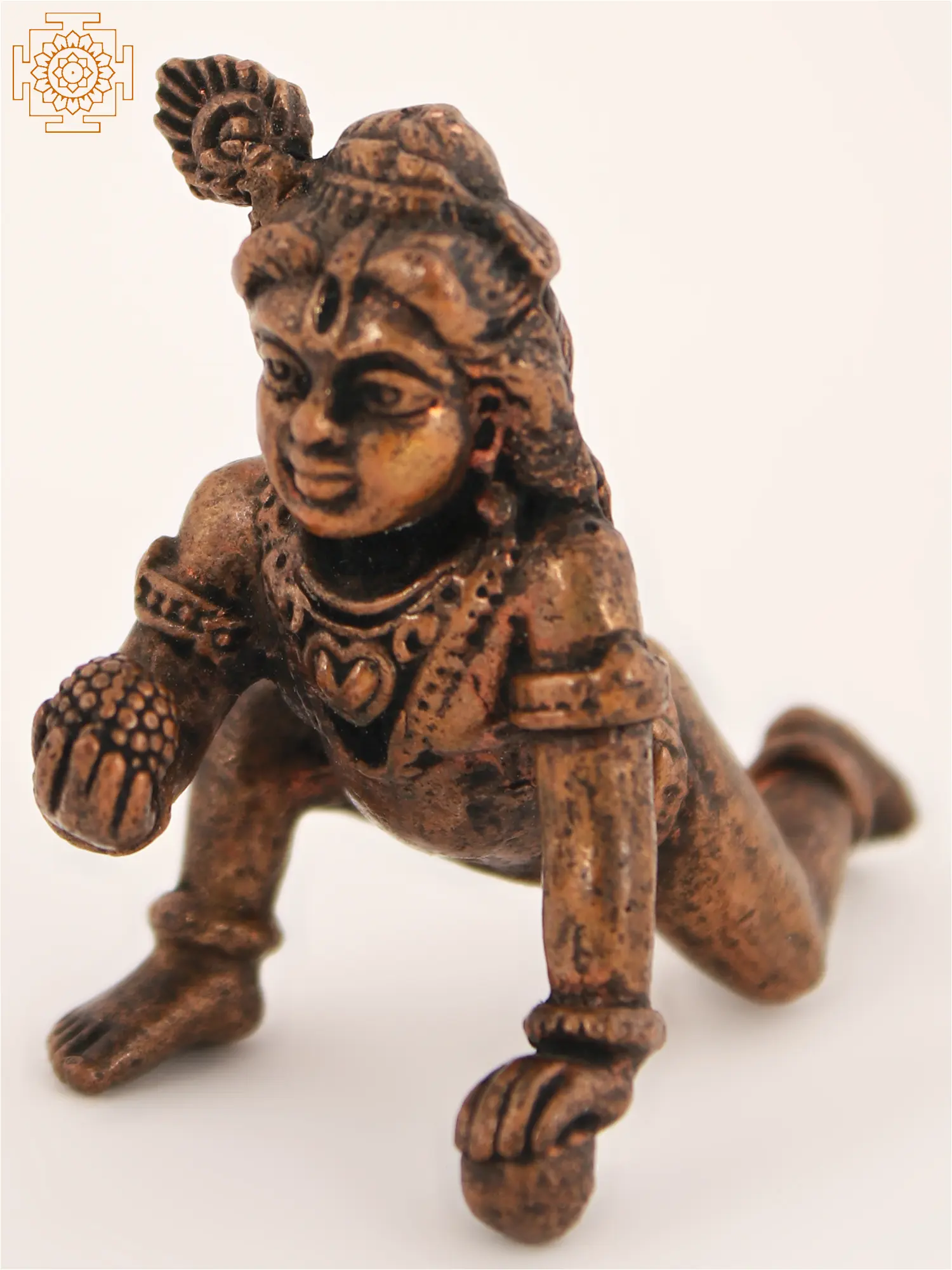 The Hindu god Sri Krishna's childhood form, Laddoo Gopal, is arguably the most adored roopa. Krishna is depicted as a young child crawling on the floor while carrying a laddoo (an Indian sweet) and is a cherished and adored member of the family of devotees, regarded with compassion and honor. In this handmade copper murti, Laddoo Gopal balances his dotting, chubby figure by resting one hand on the ground. He has exquisite ornamentation on him as well as his recognizable Mora-Mukuta. Krishna looks directly at the onlooker while holding a Laddo (sweet) as if he were kindly extending to them the sweetness of the entire universe.