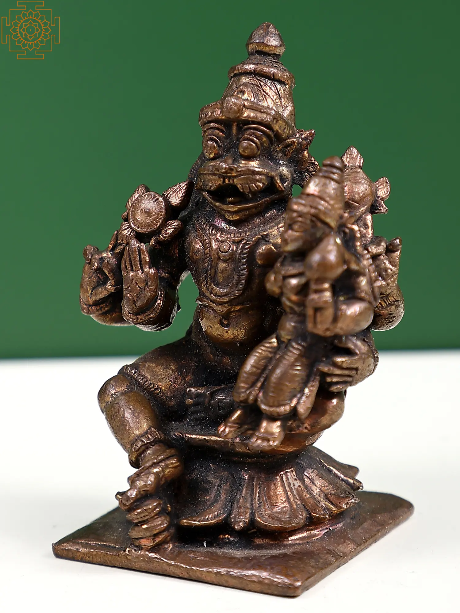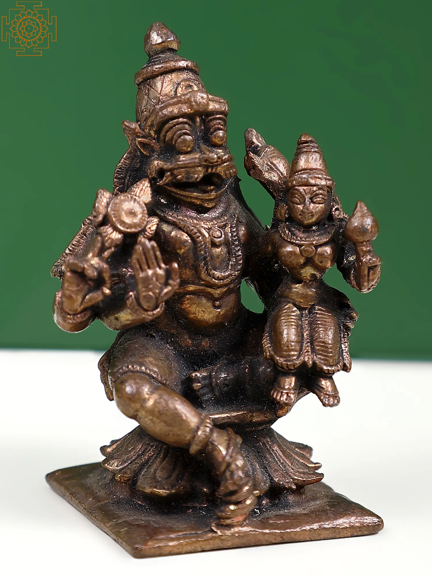 2" Copper Small Lord Narasimha Statue with Goddess Lakshmi Sitting on Pedestal
