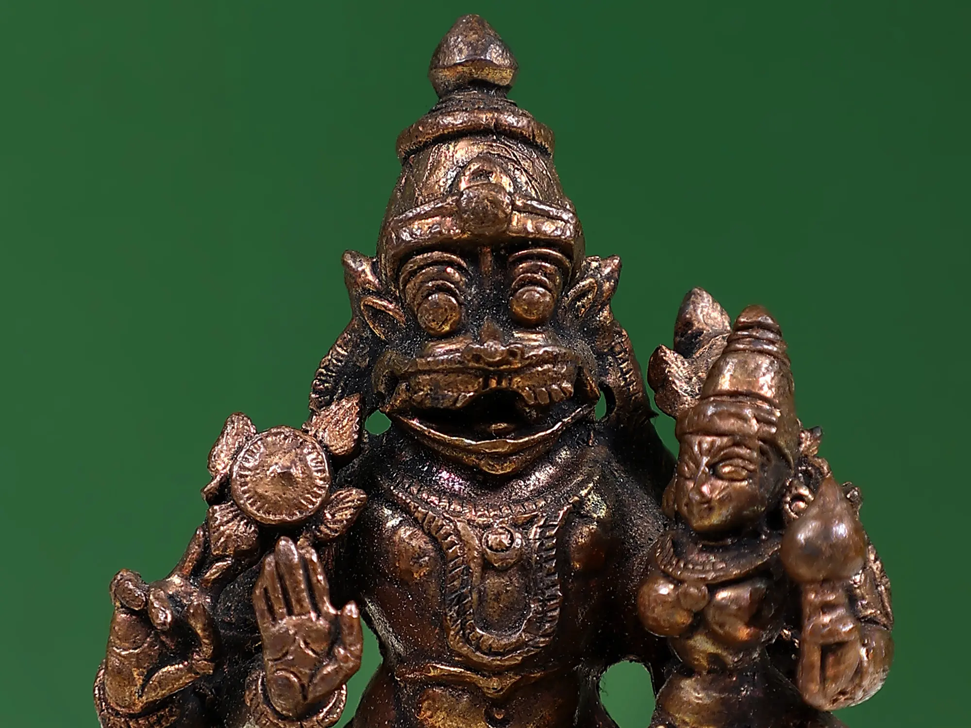 Sri Narasimha assumes a beneficent roopa while being accompanied by his beloved Shakti, Sri Lakshmi- the fierce man-lion manifestation of Vishnu, whose heavenly qualities are consolidated in this miniature copper statue. Narasimha is seated in Lalitasana on a beautiful inverted lotus seat, while gently holding Lakshmi. Devi Lakshmi rests in his lap in the gentlest roopa, enhancing her Lord's appearance in this idol and achieving a harmony of Purusha and Prakriti's forces.