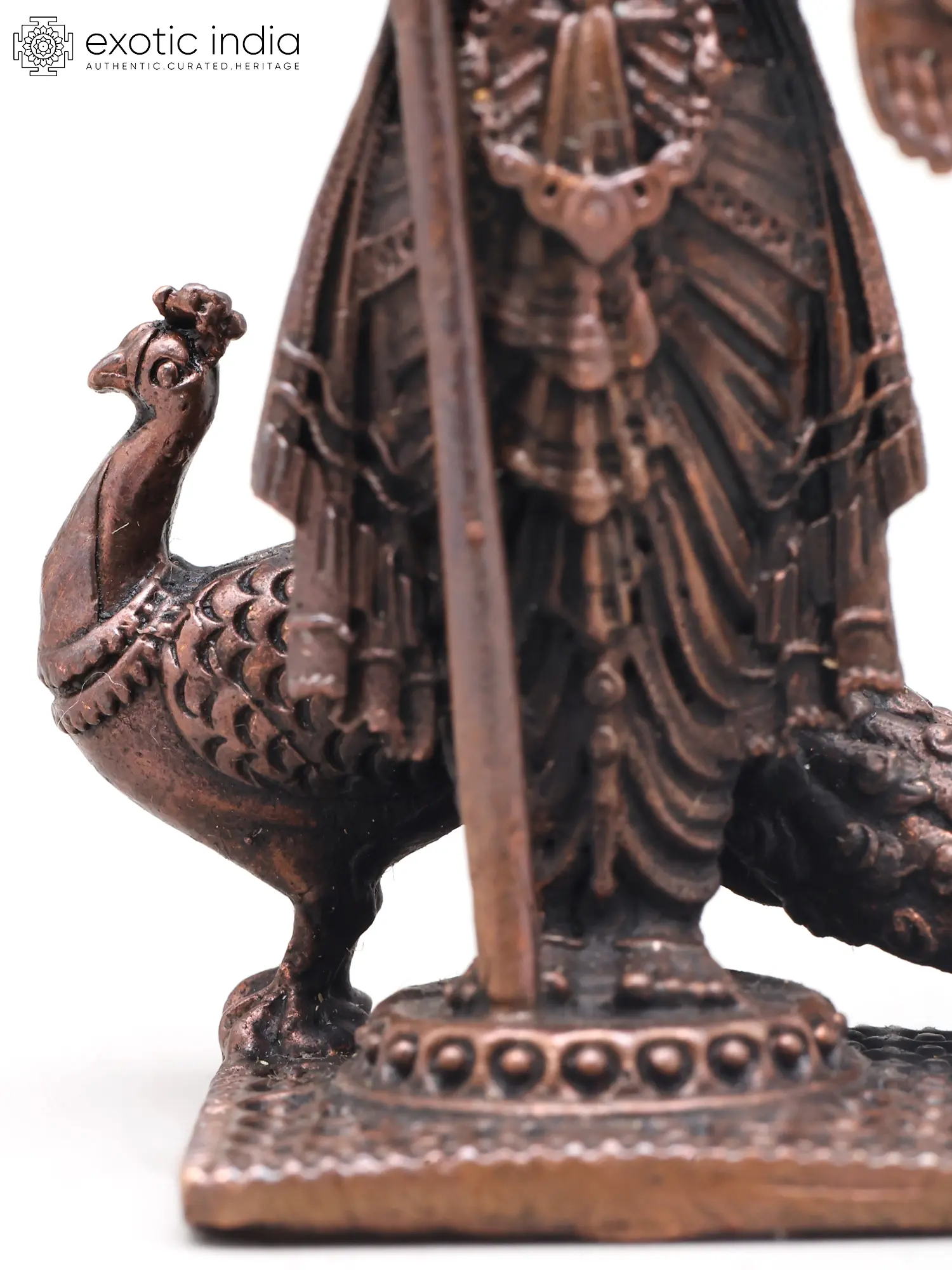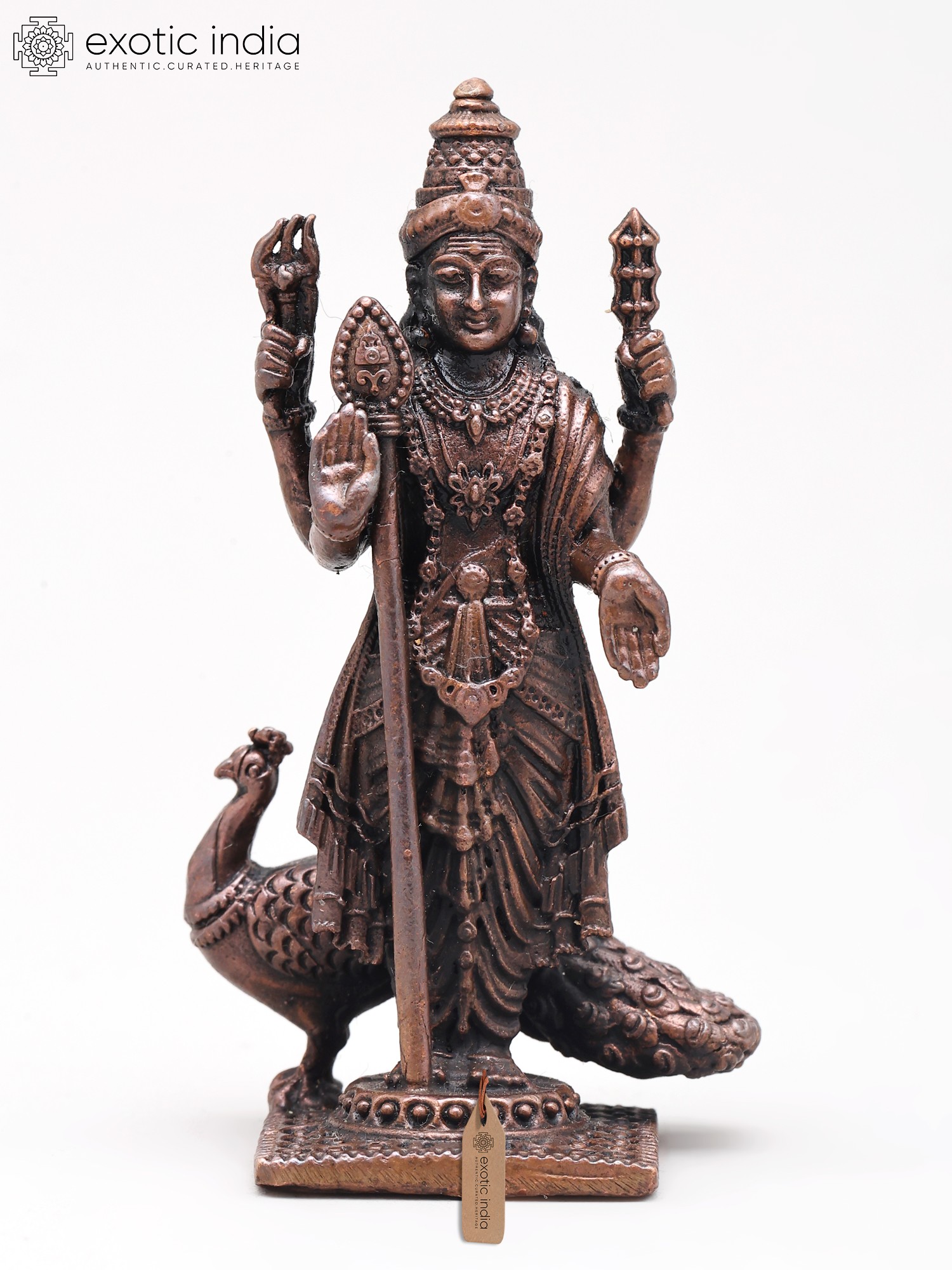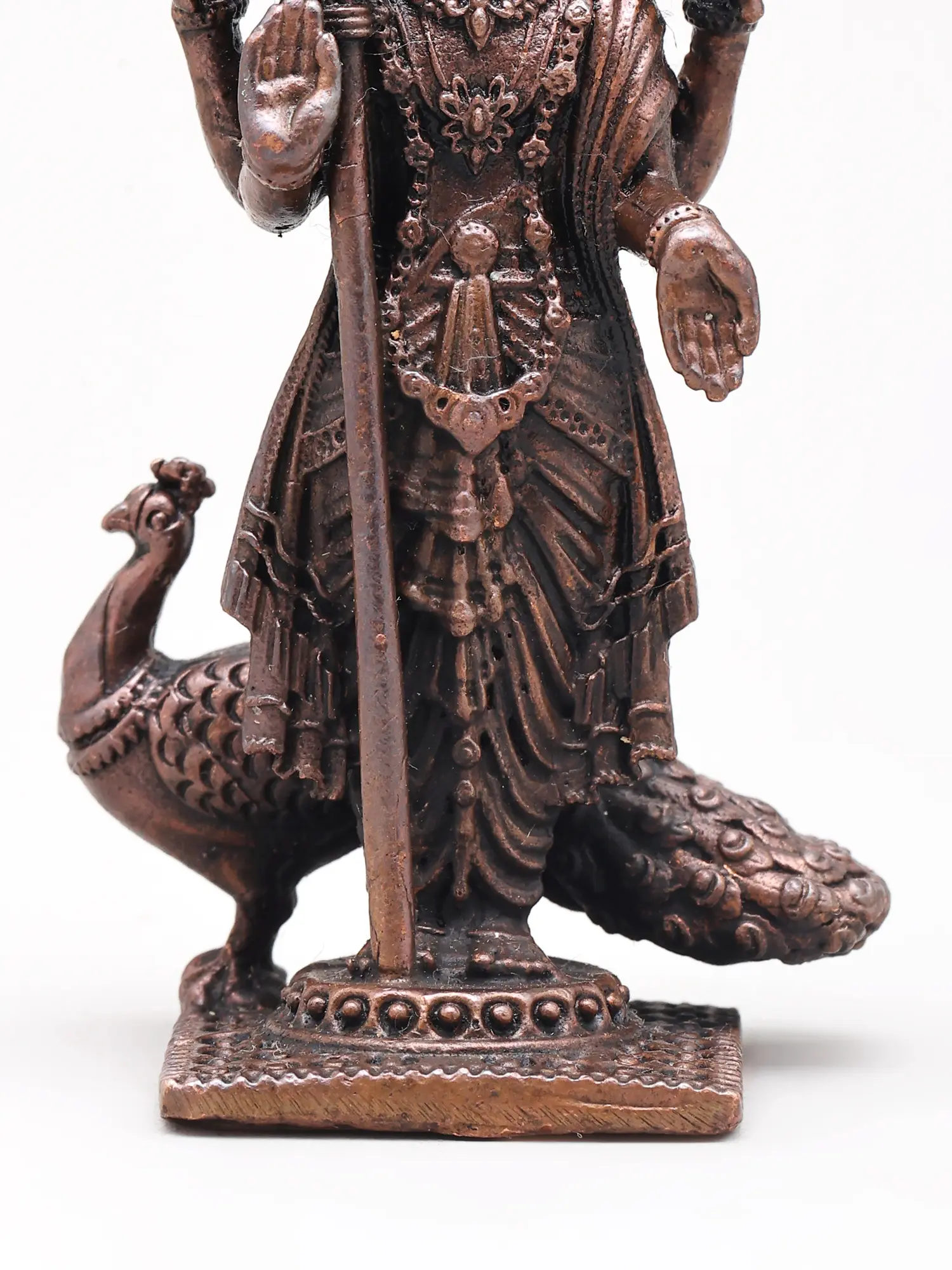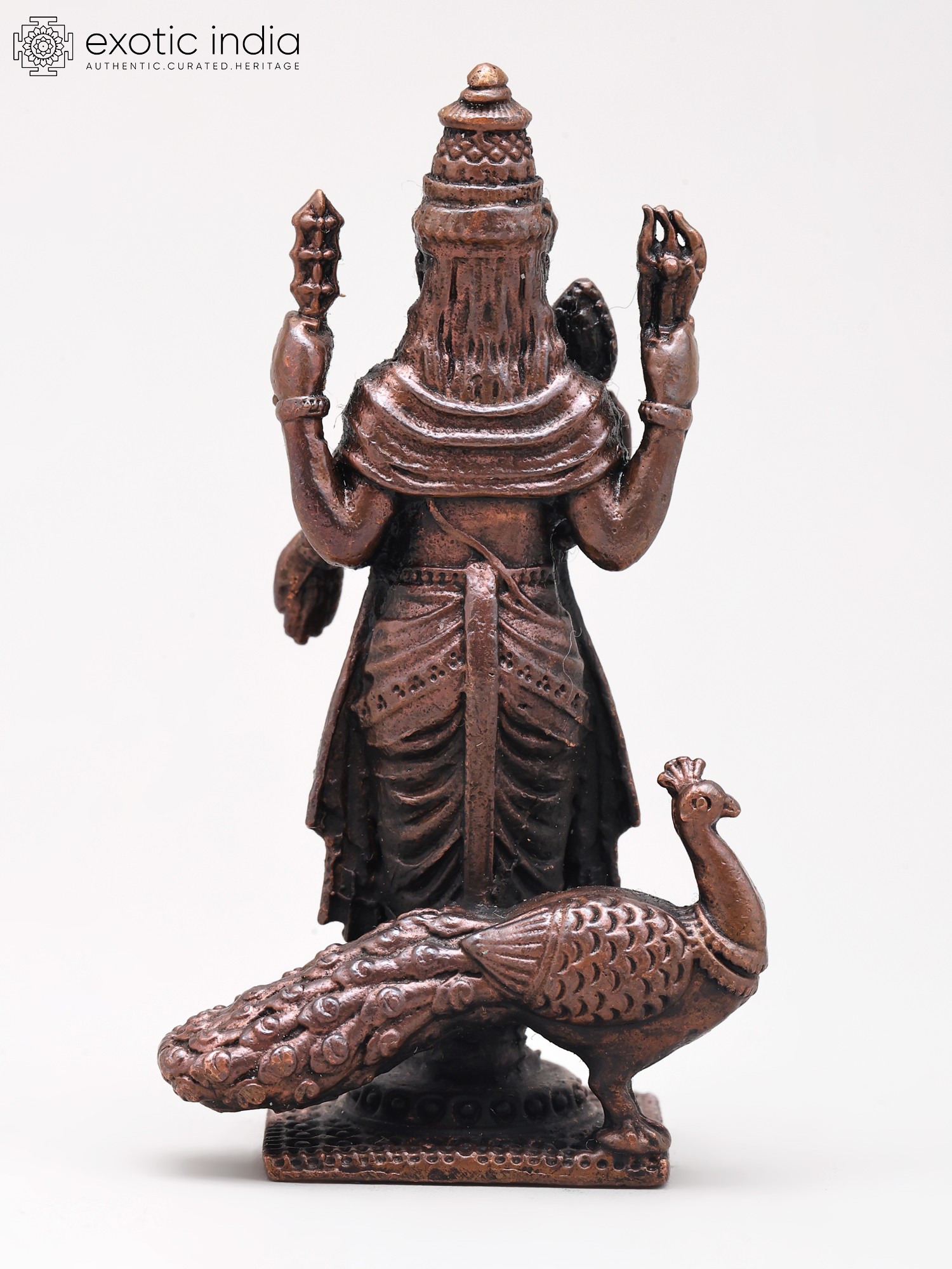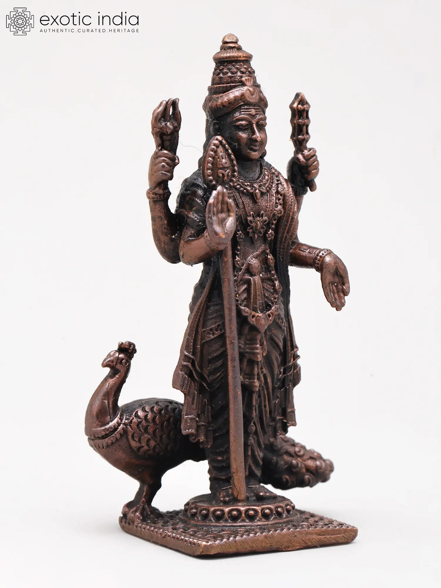 Small Standing Lord Murugan (Kartikeya) with Mayur and Vel | Handmade | Copper Statue