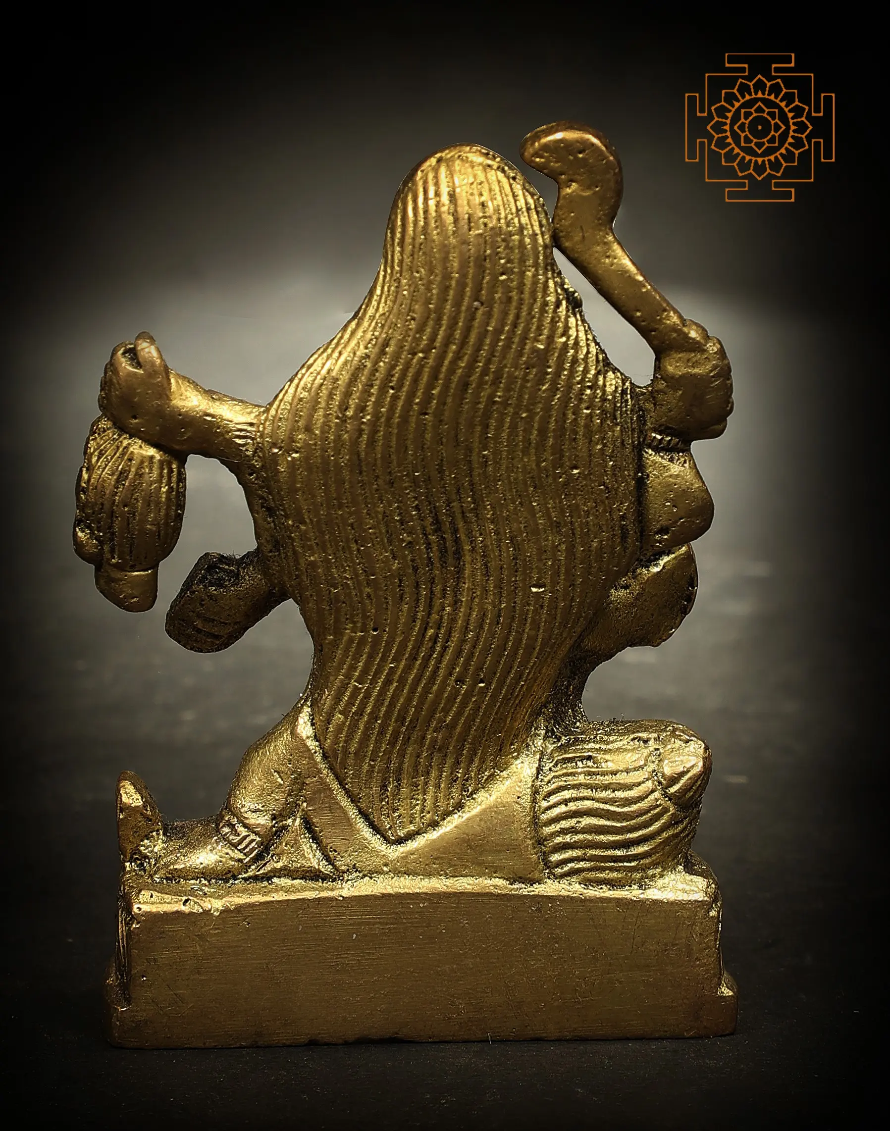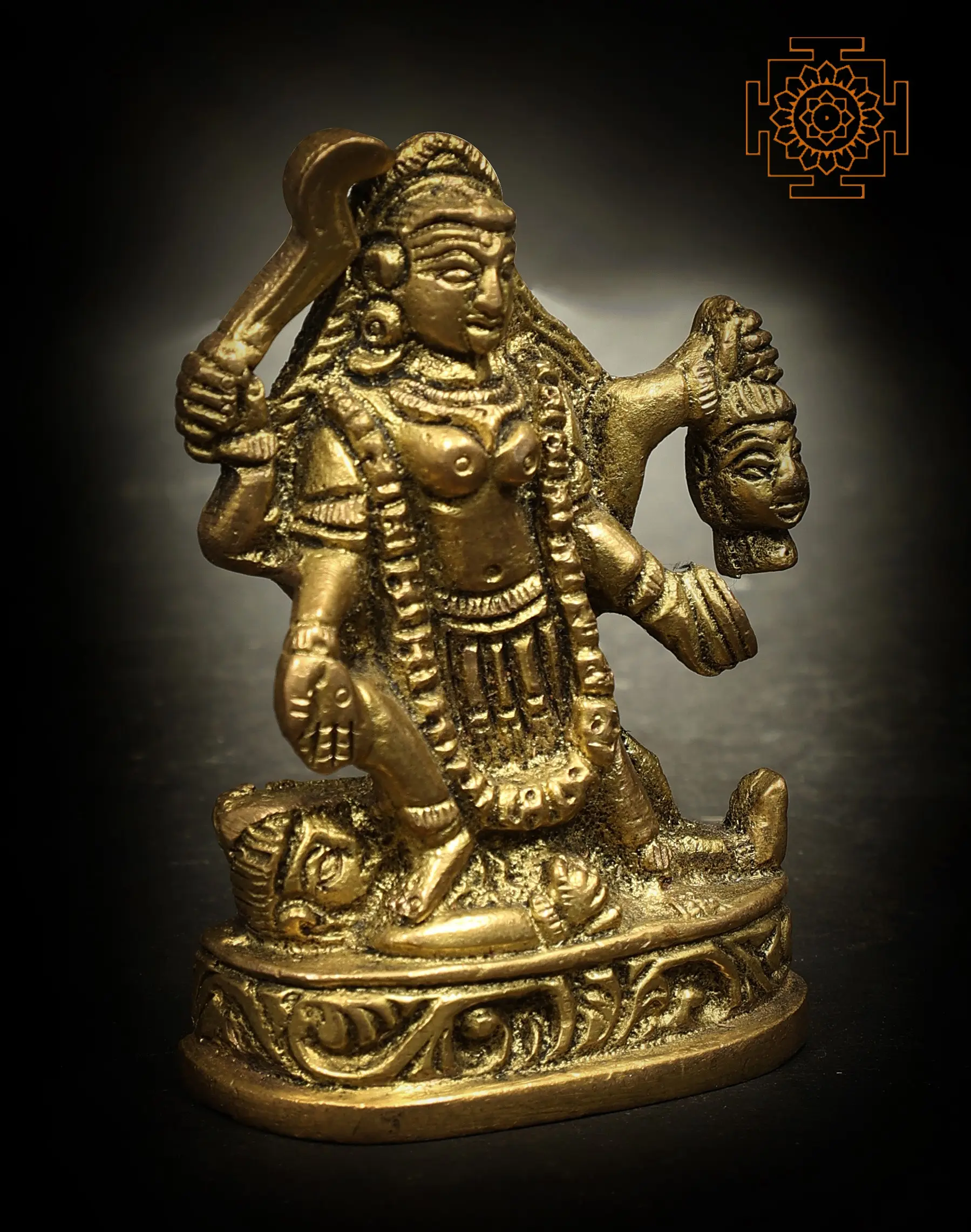 Placed on a beautiful ovular platform, the mighty goddess Kali, in her Chaturbhuja roopa is presented in this handmade brass statue. The divine features of the great mother goddess are all depicted in this idol, which in your place of worship will empower your life with the guarding gaze of the celestial mother.