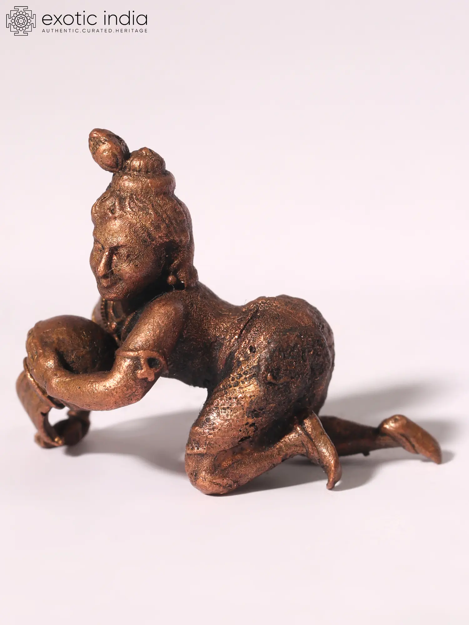 The Makhanchor image of Lord Krishna, depicting Him as the mischievous butter thief, is heartwarming and endearing. It reflects the playful and charismatic aspect of Krishna's divine persona, creating a connection that resonates with love and devotion. This Small Makhan Chor Krishna Copper Statue captures this enchanting portrayal, making it a perfect addition to personal worship spaces.