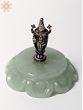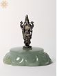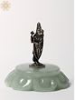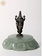 The divine figure is presented upon a base crafted from natural Aventurine, a gemstone often referred to as the "Stone of Opportunity" and a symbol of courage, confidence, and optimism. Aventurine is deeply connected with the heart chakra, promoting emotional well-being, healing, and tranquility. Its soft, luminous green hue evokes the calming essence of nature and is believed to attract prosperity and good fortune. In ancient traditions, green aventurine was associated with abundance, and wearing or displaying it was thought to invite wealth and success. The scalloped design of the base further enhances its aesthetic appeal, subtly suggesting the unfolding of a lotus, a sacred symbol in many Eastern philosophies representing purity, enlightenment, and spiritual awakening.