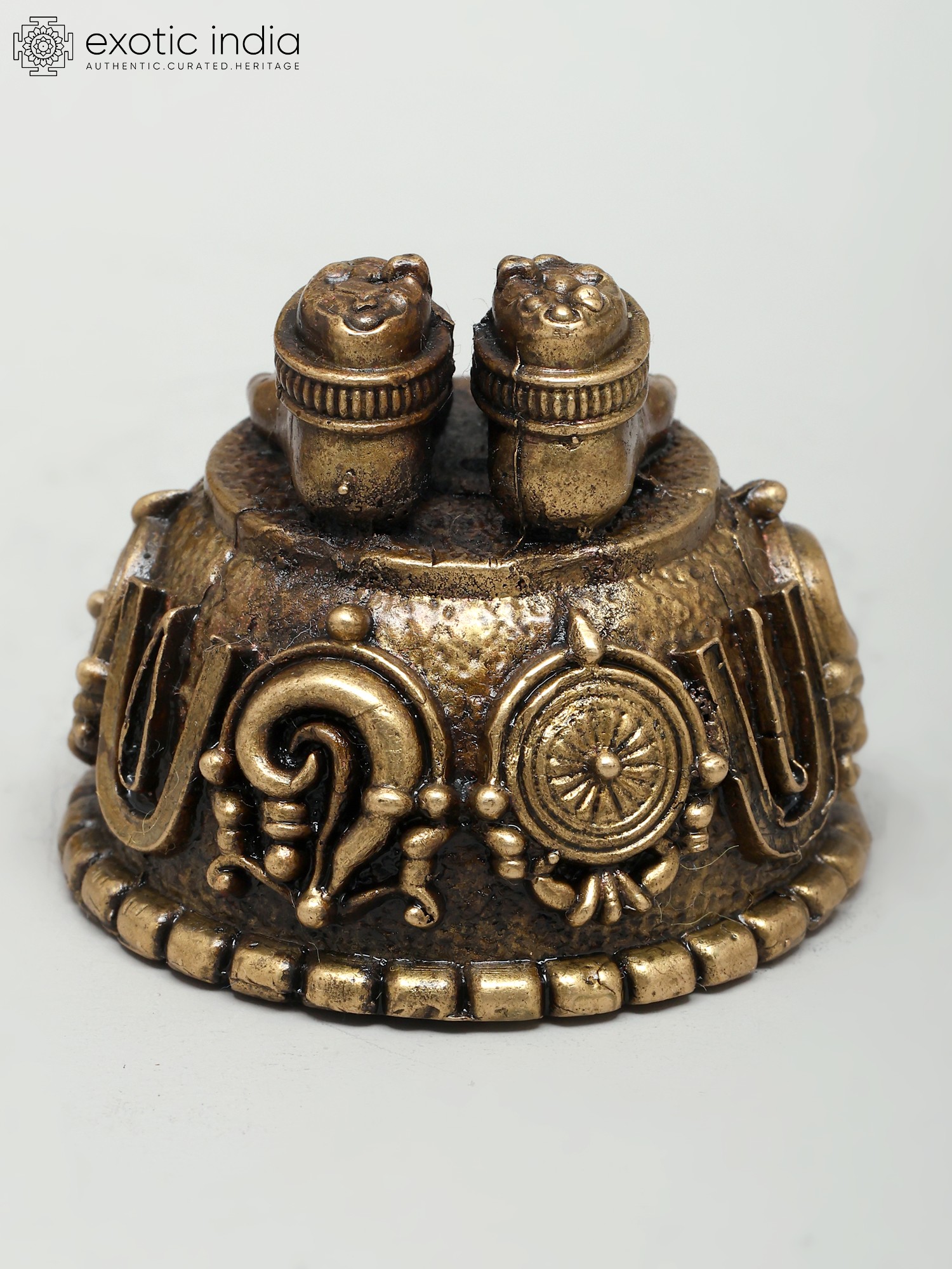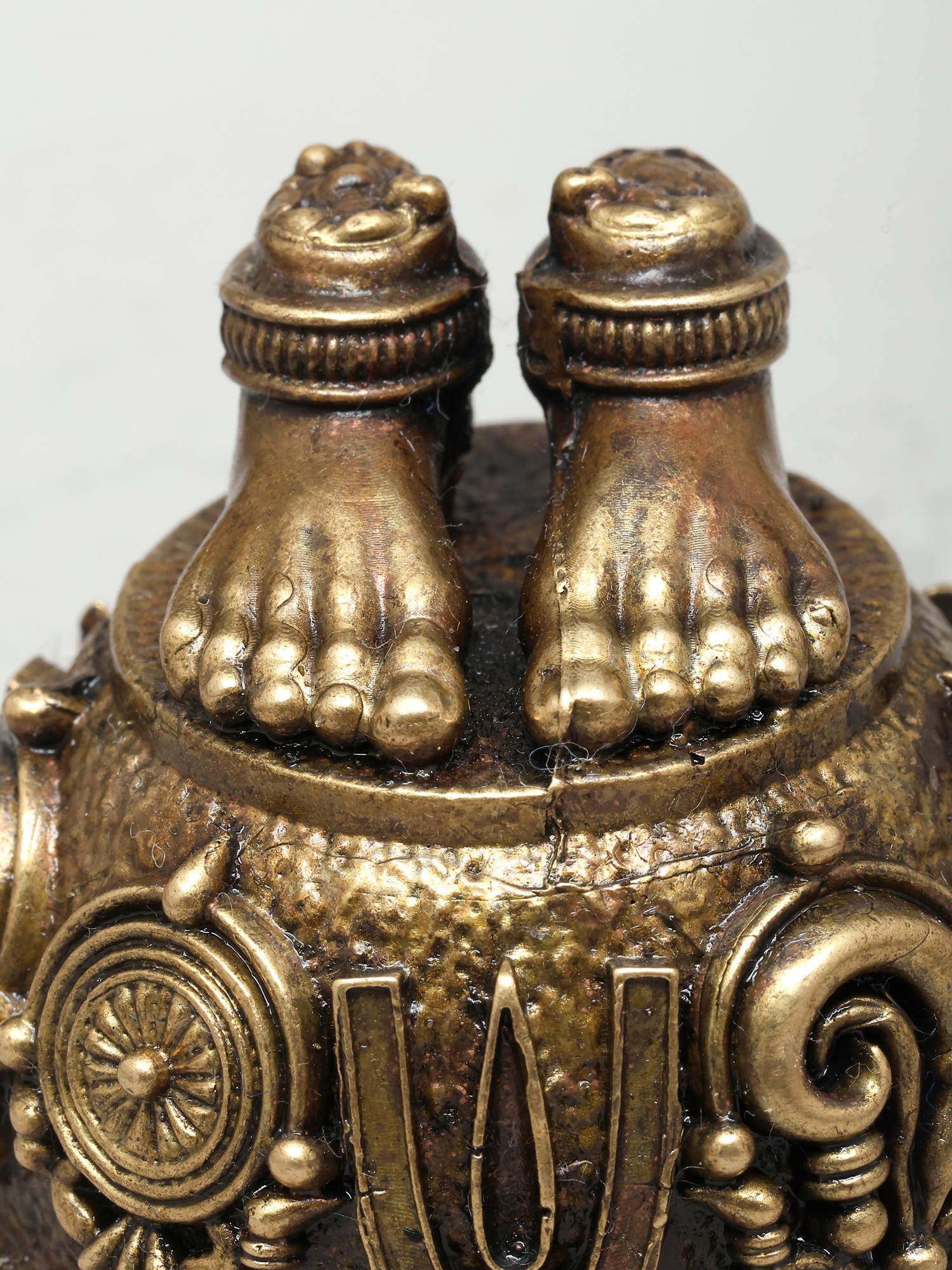 This compact and exquisitely detailed representation of Lord Vishnu's sacred feet is an ideal addition to any home altar or puja room. Its modest size makes it versatile for placement on shelves, mantels, or within sacred niches. Whether used for daily puja, meditation, or as a constant source of spiritual inspiration, these divine footprints offer a tangible connection to the divine energy of Lord Vishnu. They serve as a beautiful reminder of the eternal presence of the sustainer of the universe and an invitation to seek his blessings for peace, prosperity, and spiritual growth.