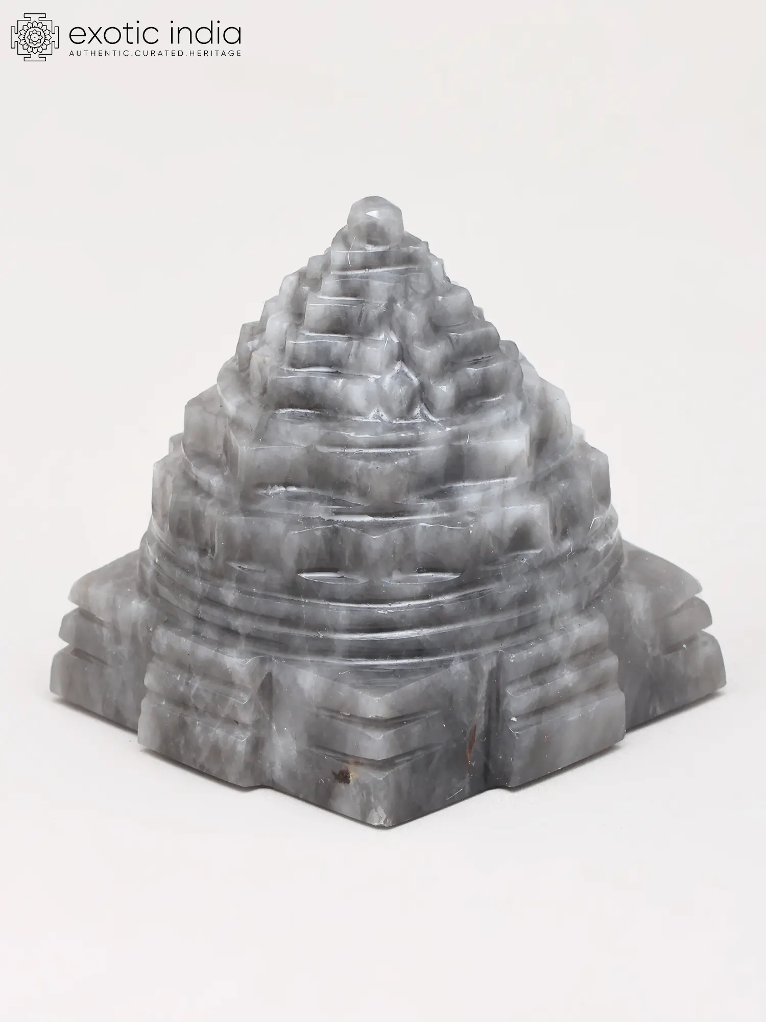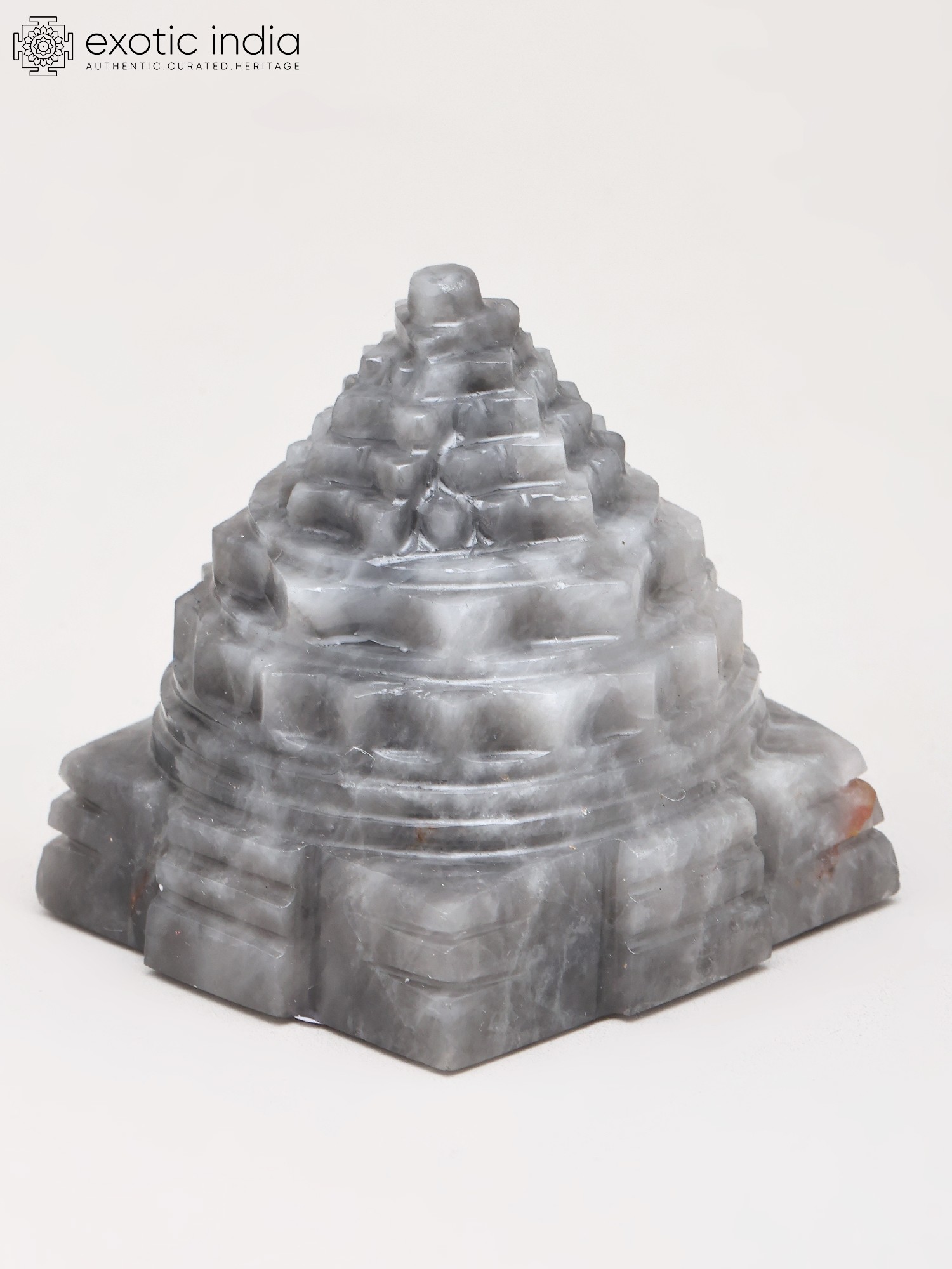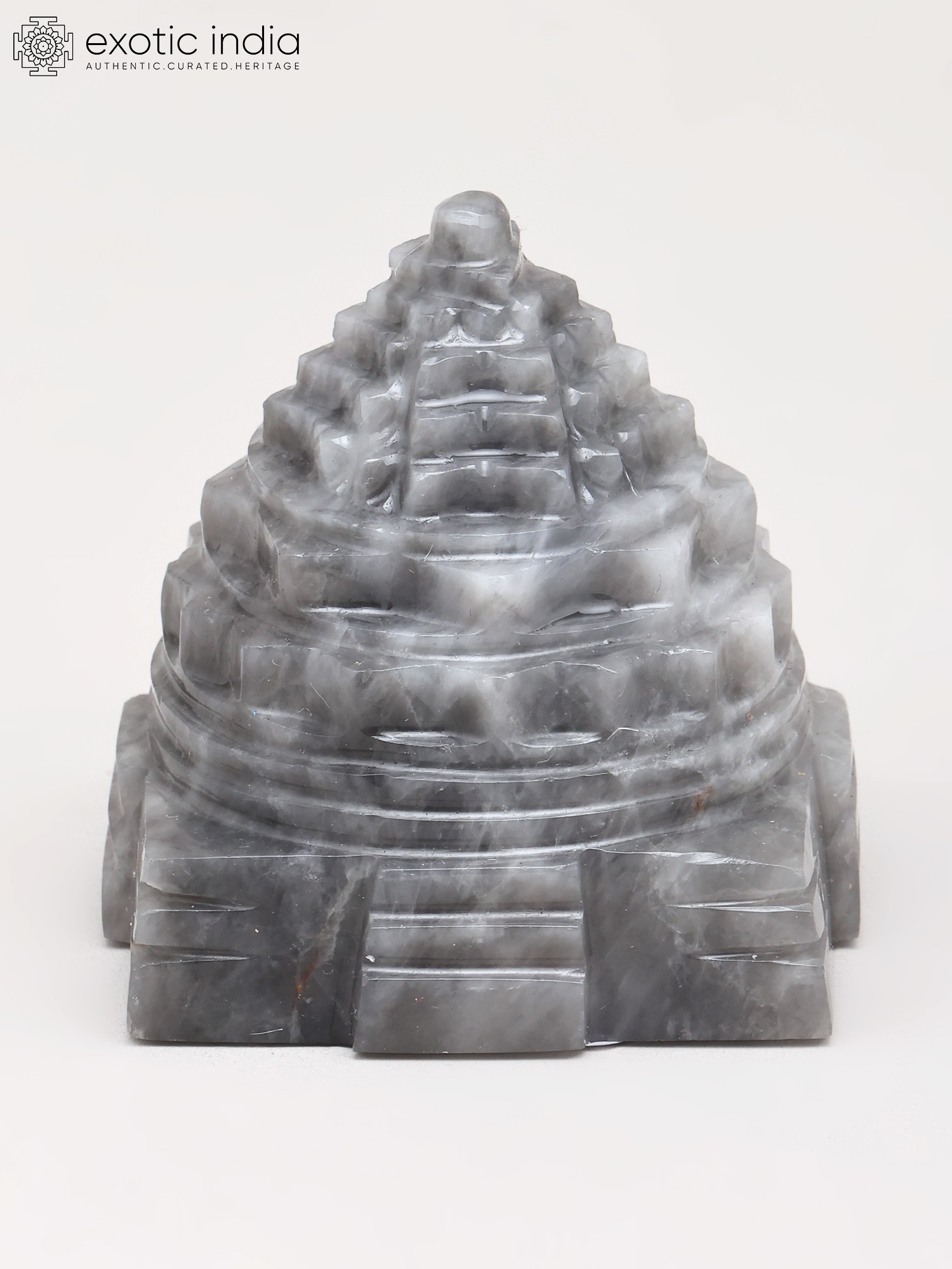 The striking tiered structure rises with a mesmerizing ascent, its steps and levels rendered with exceptional precision. The natural striations within the Grey Moon Gemstone lend a subtle, ethereal depth, making each angle a new discovery. This compact, approximately two-inch form is perfectly proportioned for contemplation and veneration, its intricate design a testament to masterful craftsmanship.