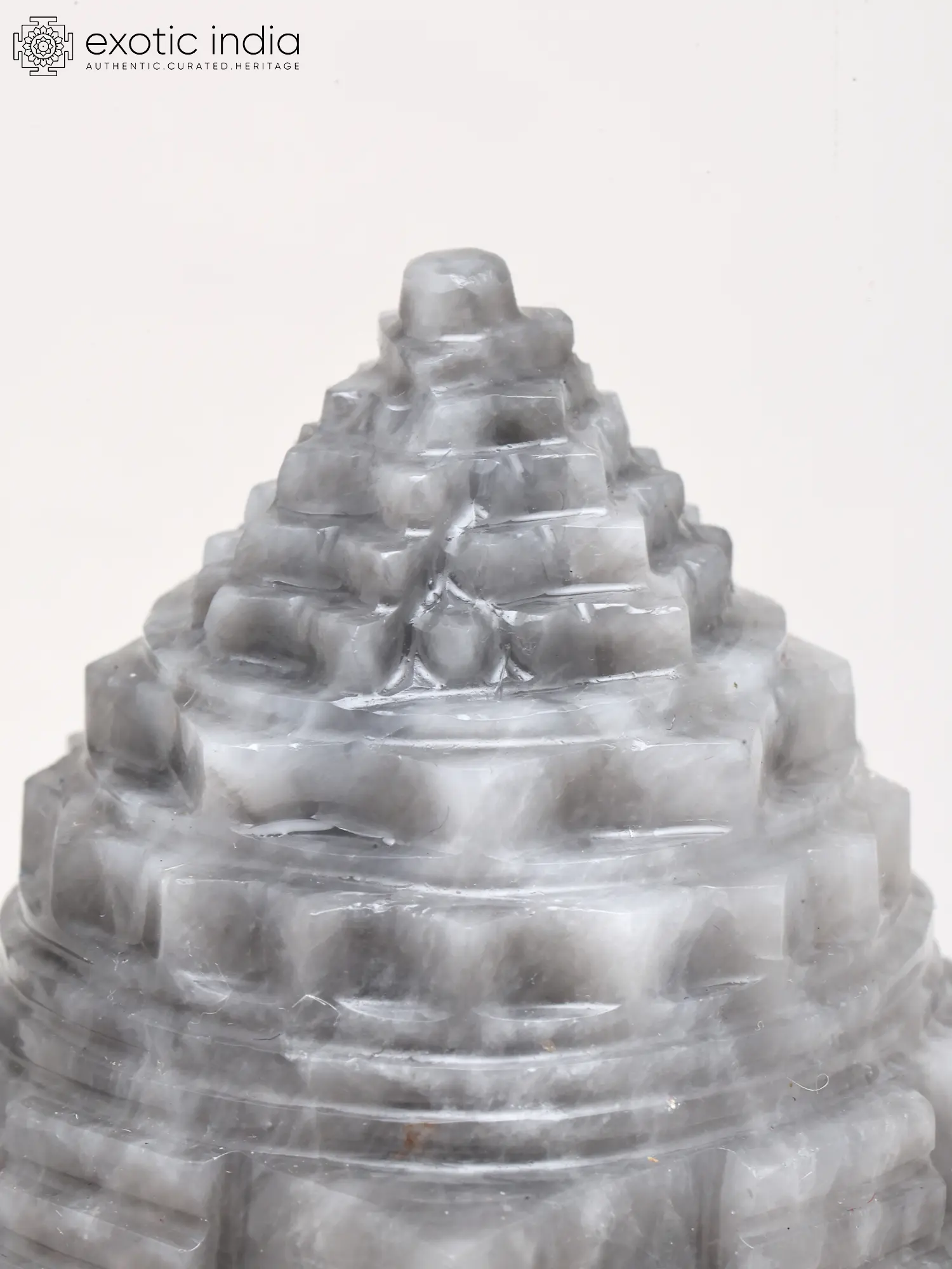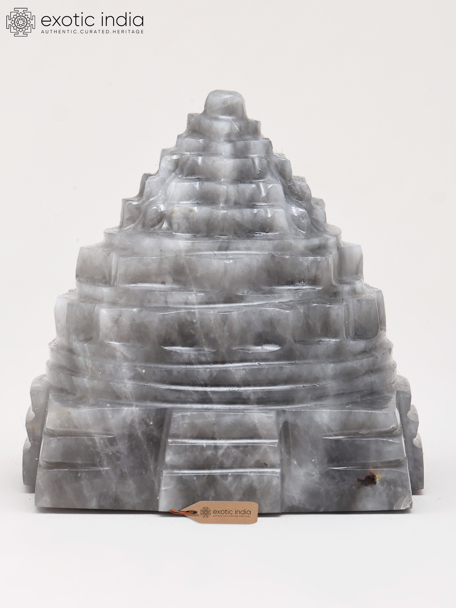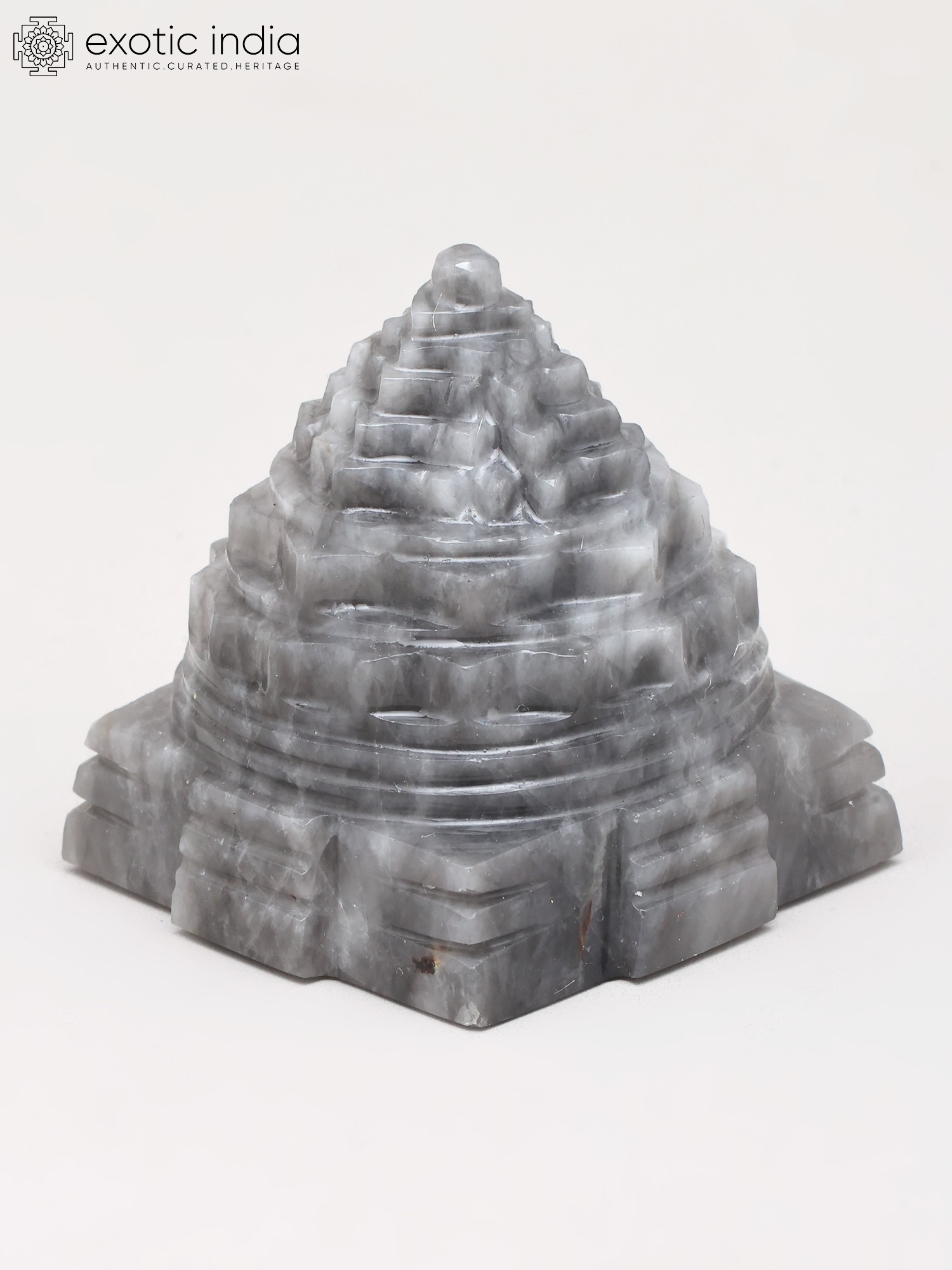 The striking tiered structure rises with a mesmerizing ascent, its steps and levels rendered with exceptional precision. The natural striations within the Grey Moon Gemstone lend a subtle, ethereal depth, making each angle a new discovery. This compact, approximately two-inch form is perfectly proportioned for contemplation and veneration, its intricate design a testament to masterful craftsmanship.