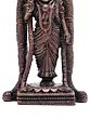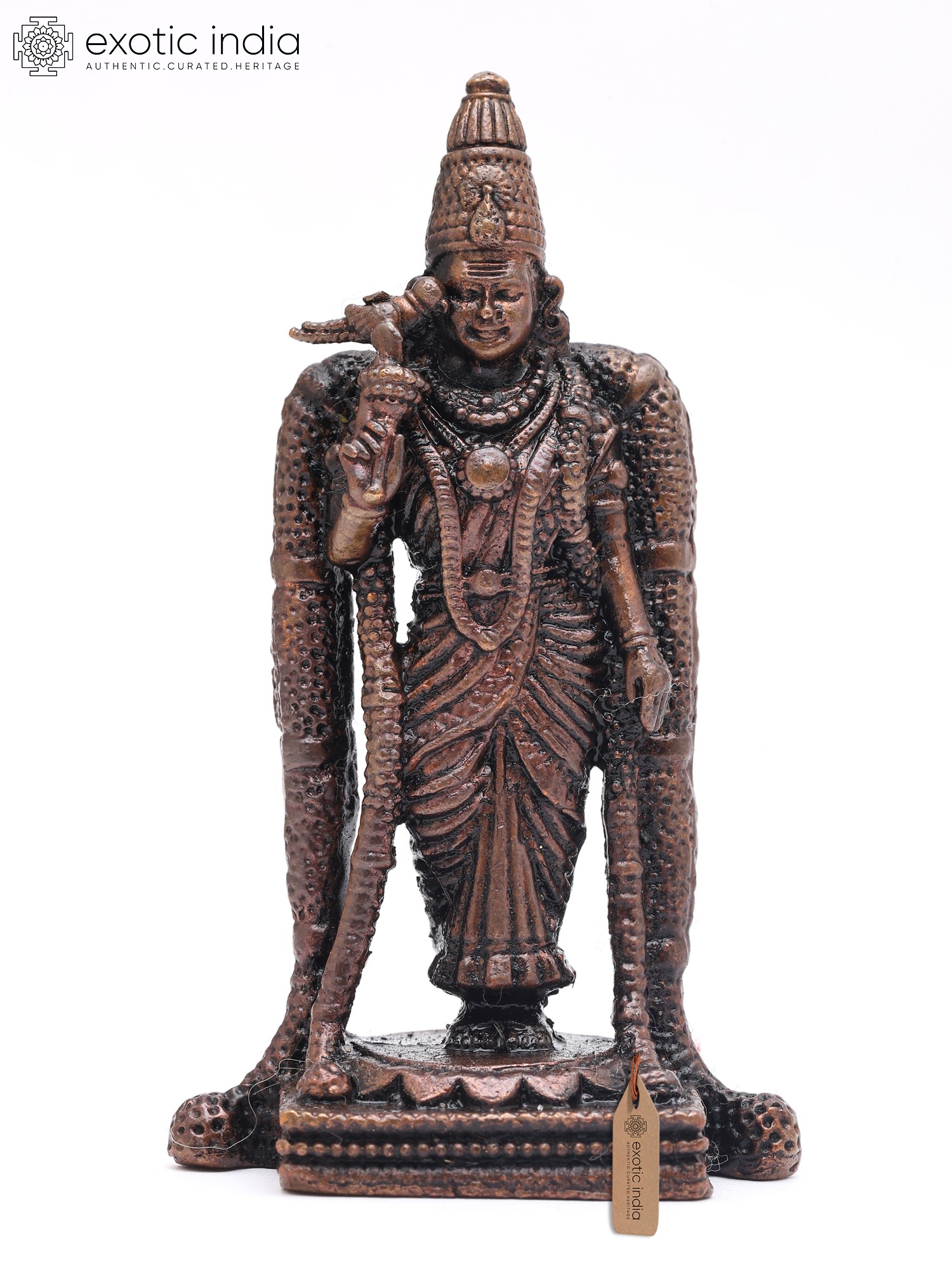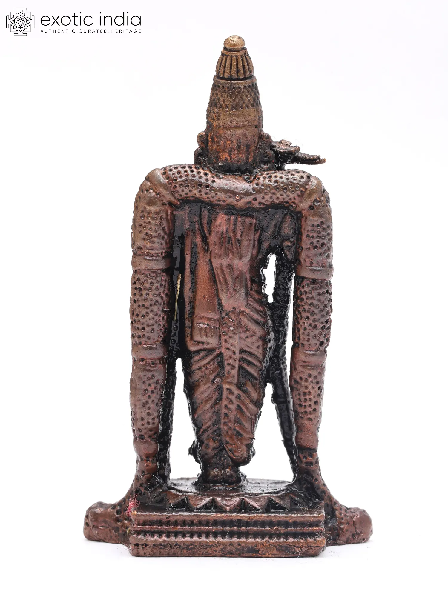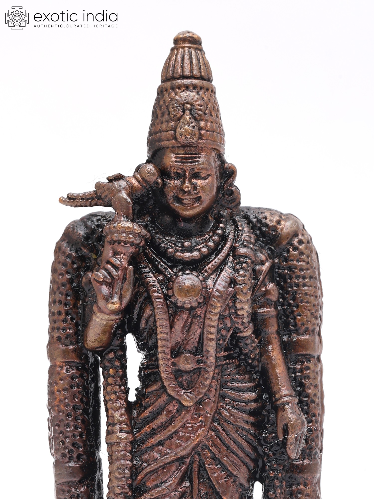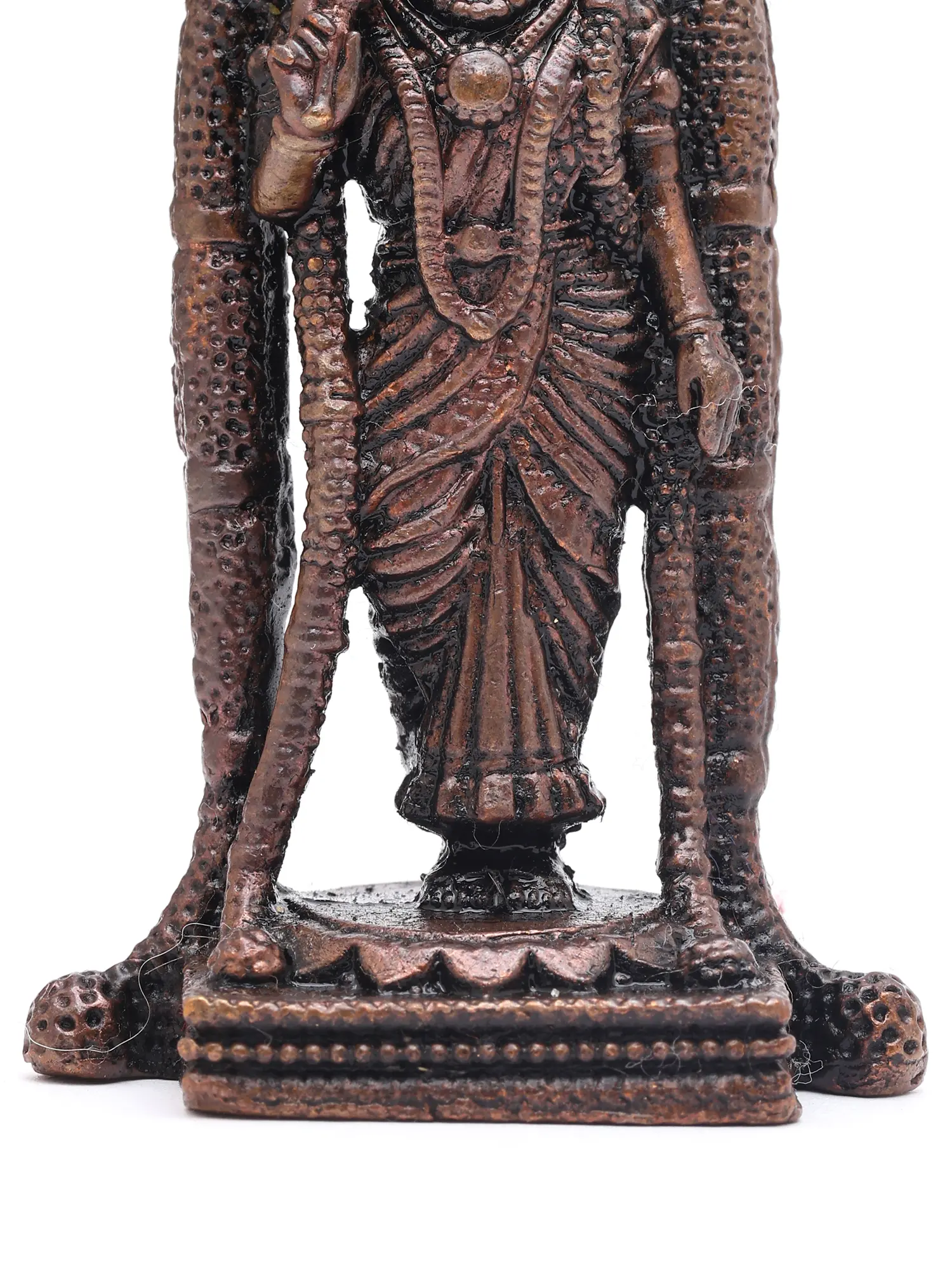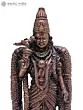 Observe the serene expression, the finely rendered ornaments, and the regal headdress that crowns the figure. Its standing posture conveys an aura of grace and authority, while the textured elements of its attire add a tactile dimension. The subtle variations in the copper’s finish create a play of light and shadow, enhancing its visual appeal from every angle.
