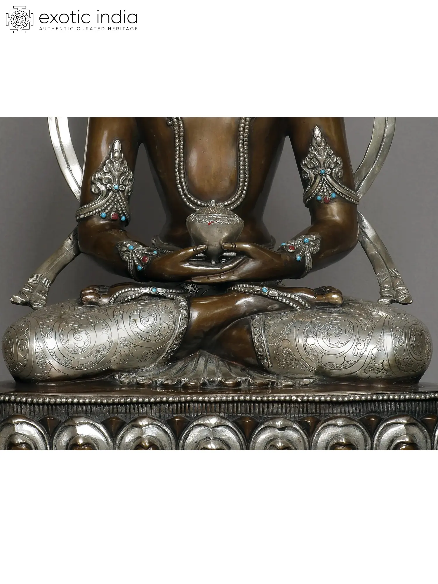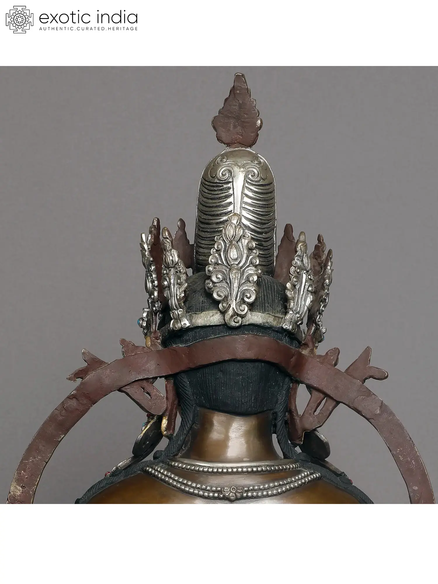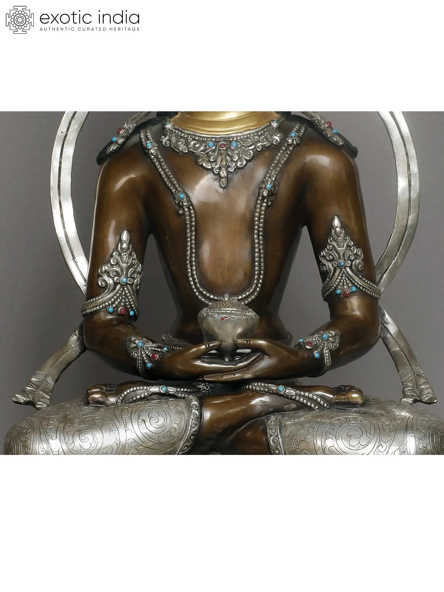 This remarkable sculpture from Nepal portrays Amitabha Buddha, the Buddha of Infinite Light and Boundless Compassion. Crafted with meticulous detail, the statue showcases Amitabha seated in the lotus position, emanating serenity and tranquility. The artist's skill is evident in the intricate patterns of the robes and the serene expression on the Buddha's face. Amitabha Buddha holds a deep significance in Buddhism, representing enlightenment, compassion, and the aspiration to attain rebirth in the Pure Land. Placing this sculpture in a meditation space or home altar can serve as a reminder of the path toward enlightenment and the cultivation of compassion.