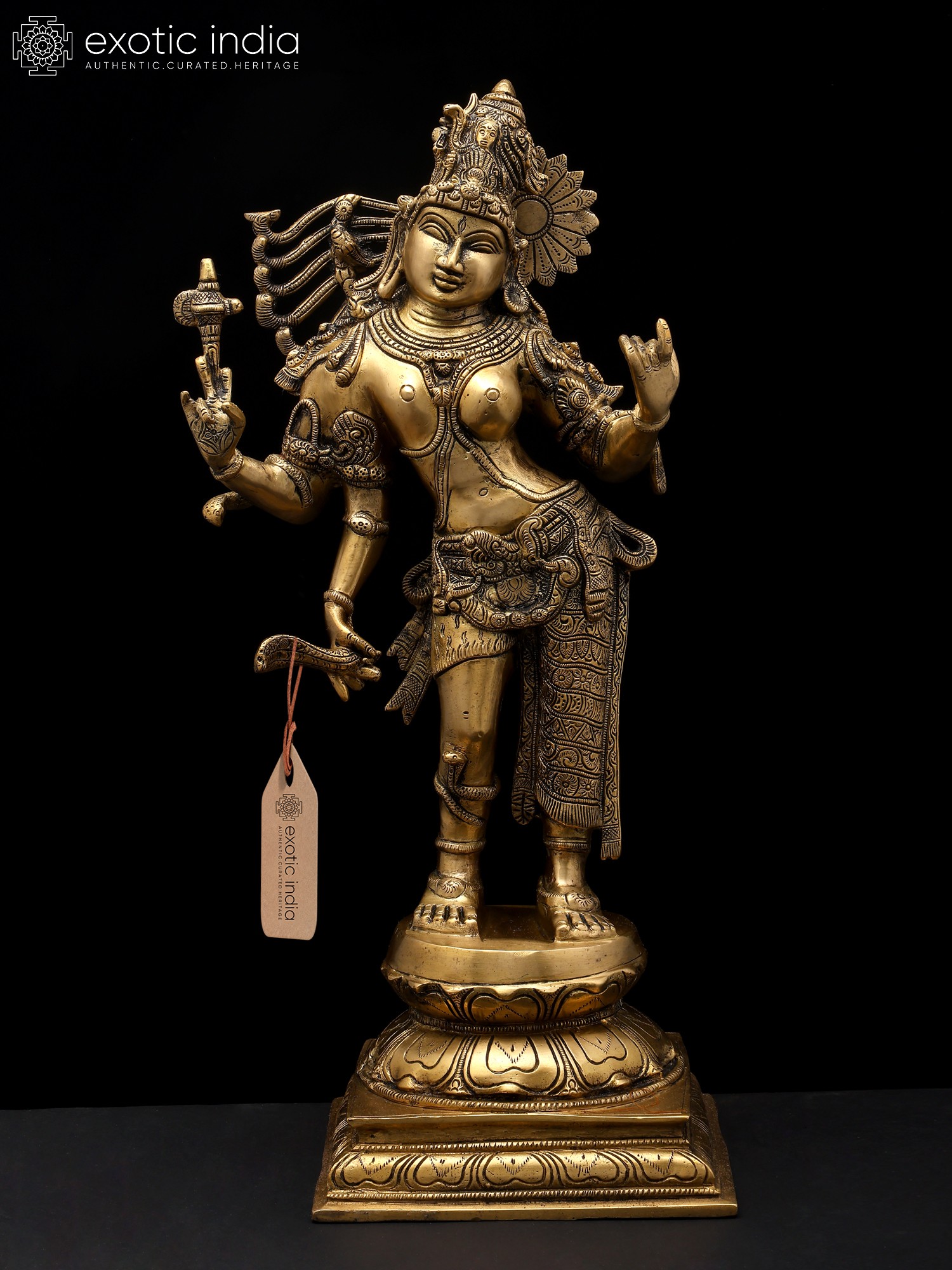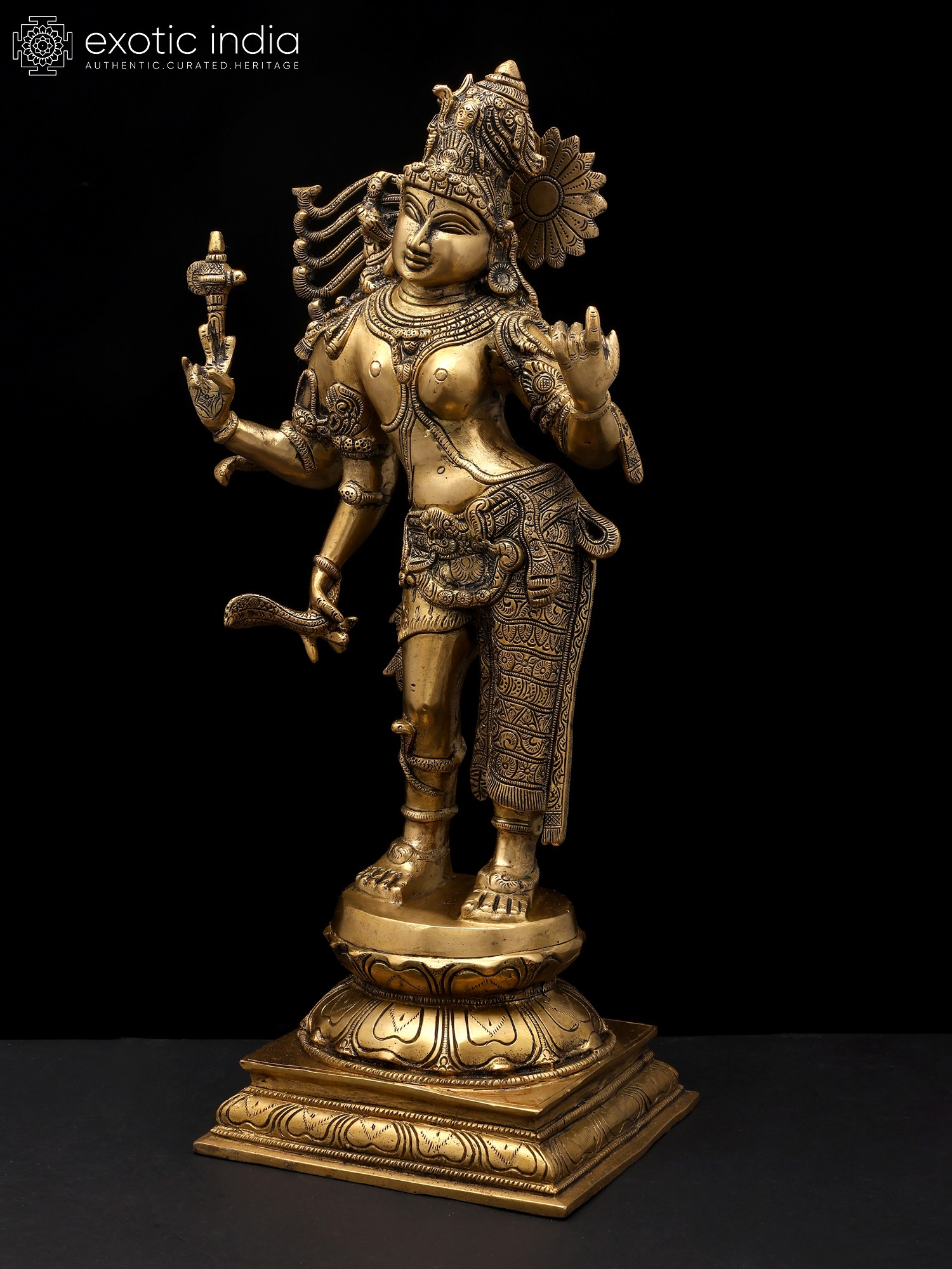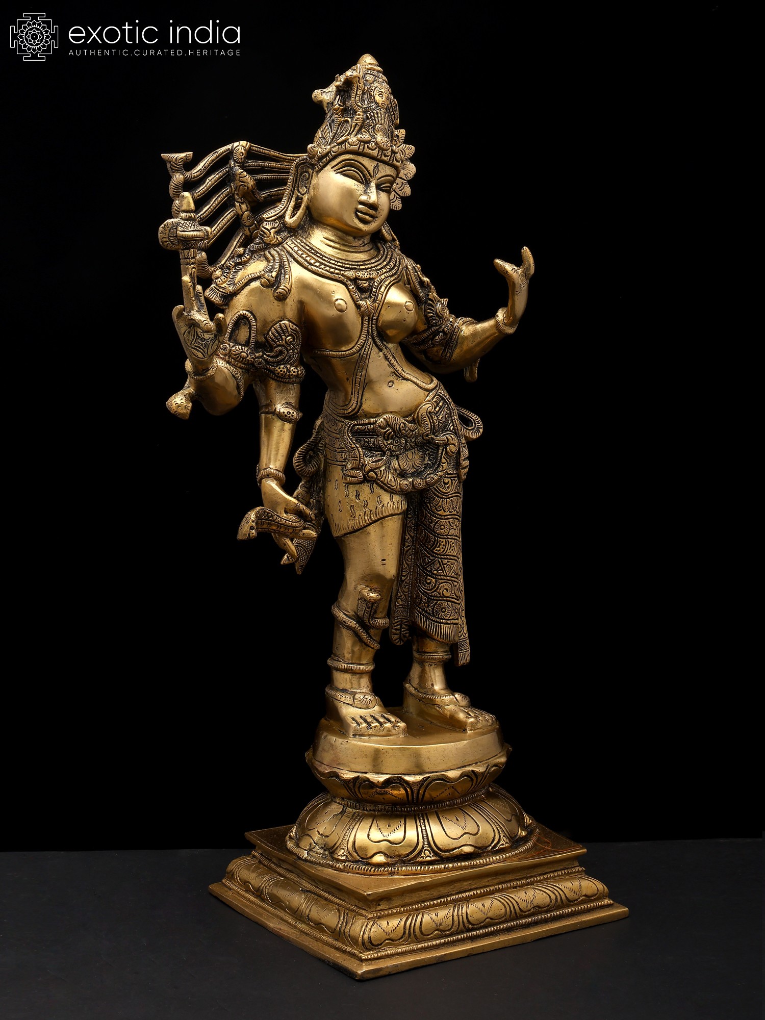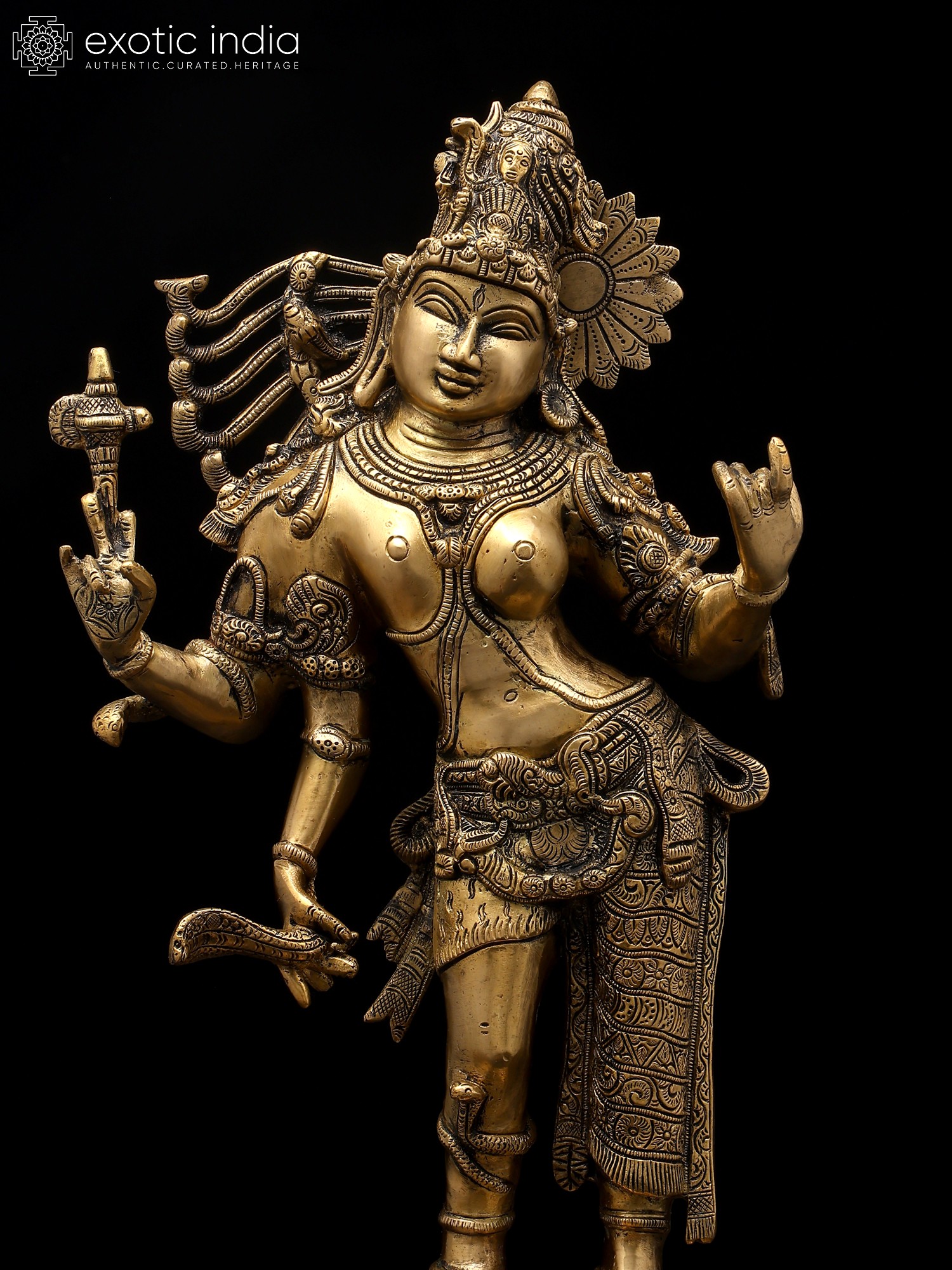 In iconographic perception, sculptural quality, craftsmanship, minute details, finish and aesthetic visualization this brass-statue is simply superb. Though a recent work of art, it excels medieval sculptures of Ardha-narishvara in many things : facial features, anatomy of the two aspects, portrayal of male and female elements and those related to Shiva and those related to Parvati and thematic insight and thrust.