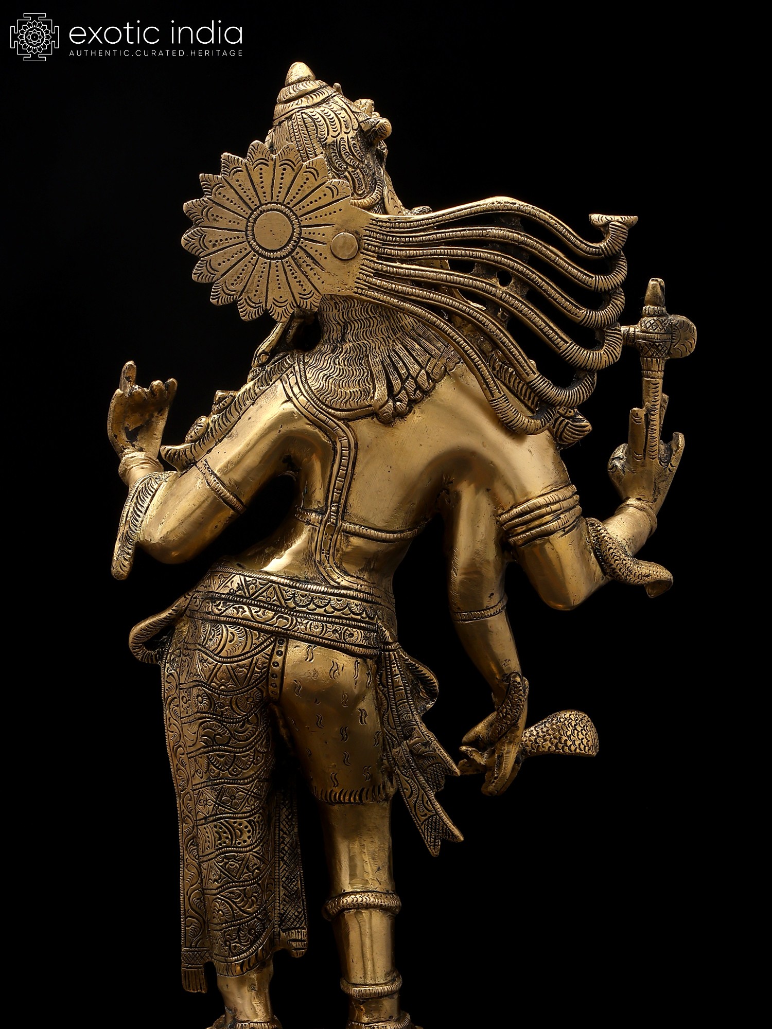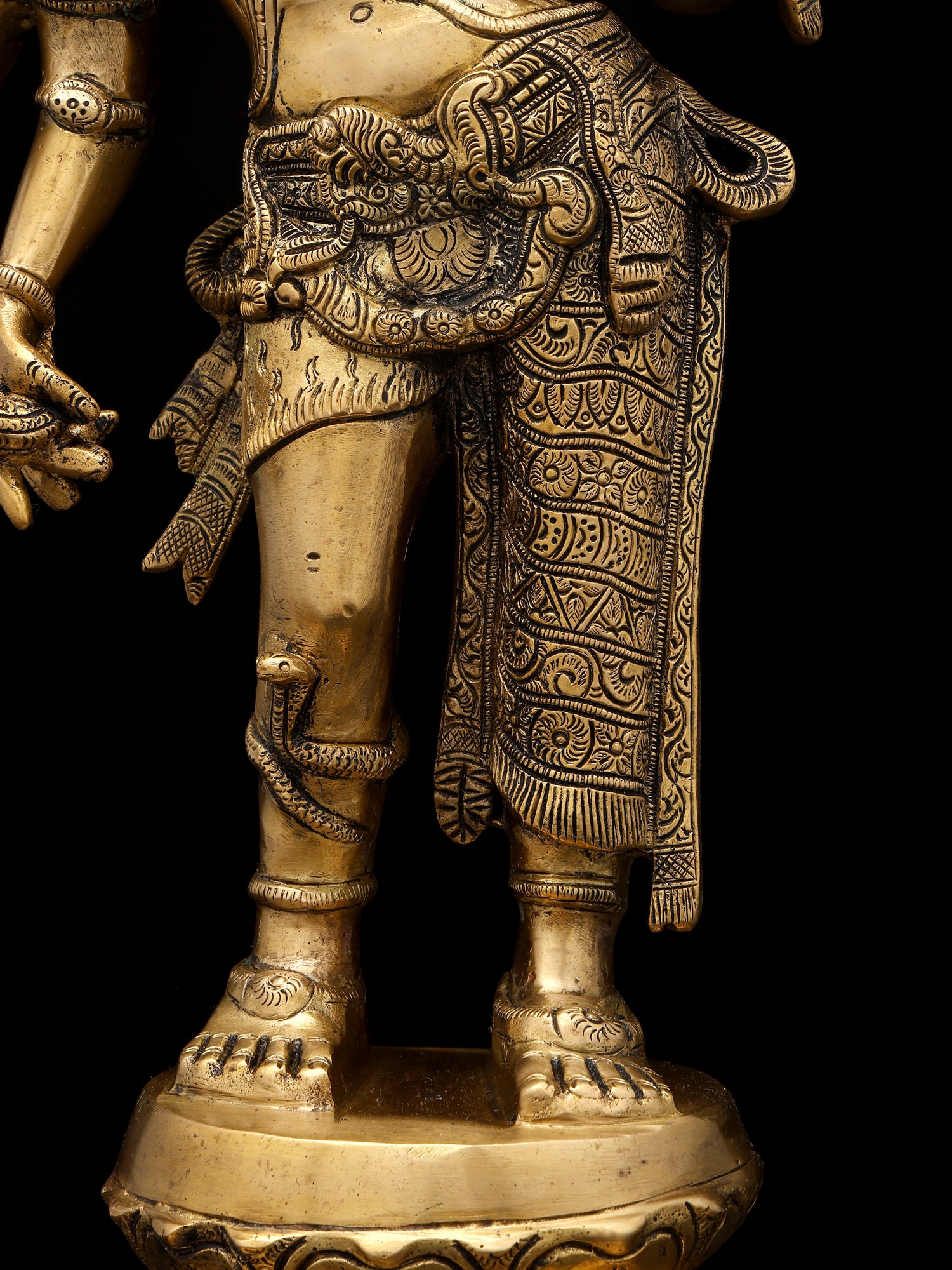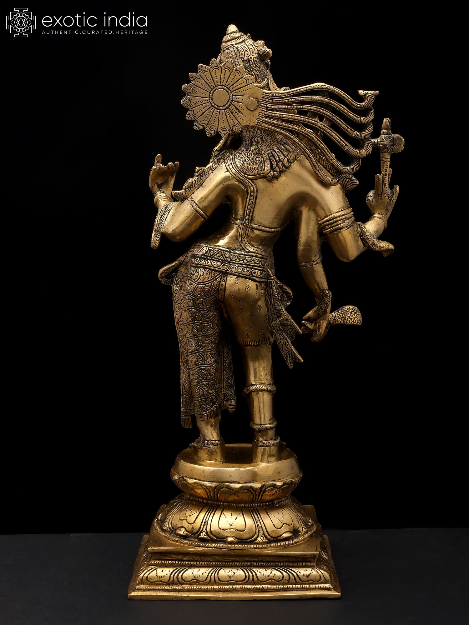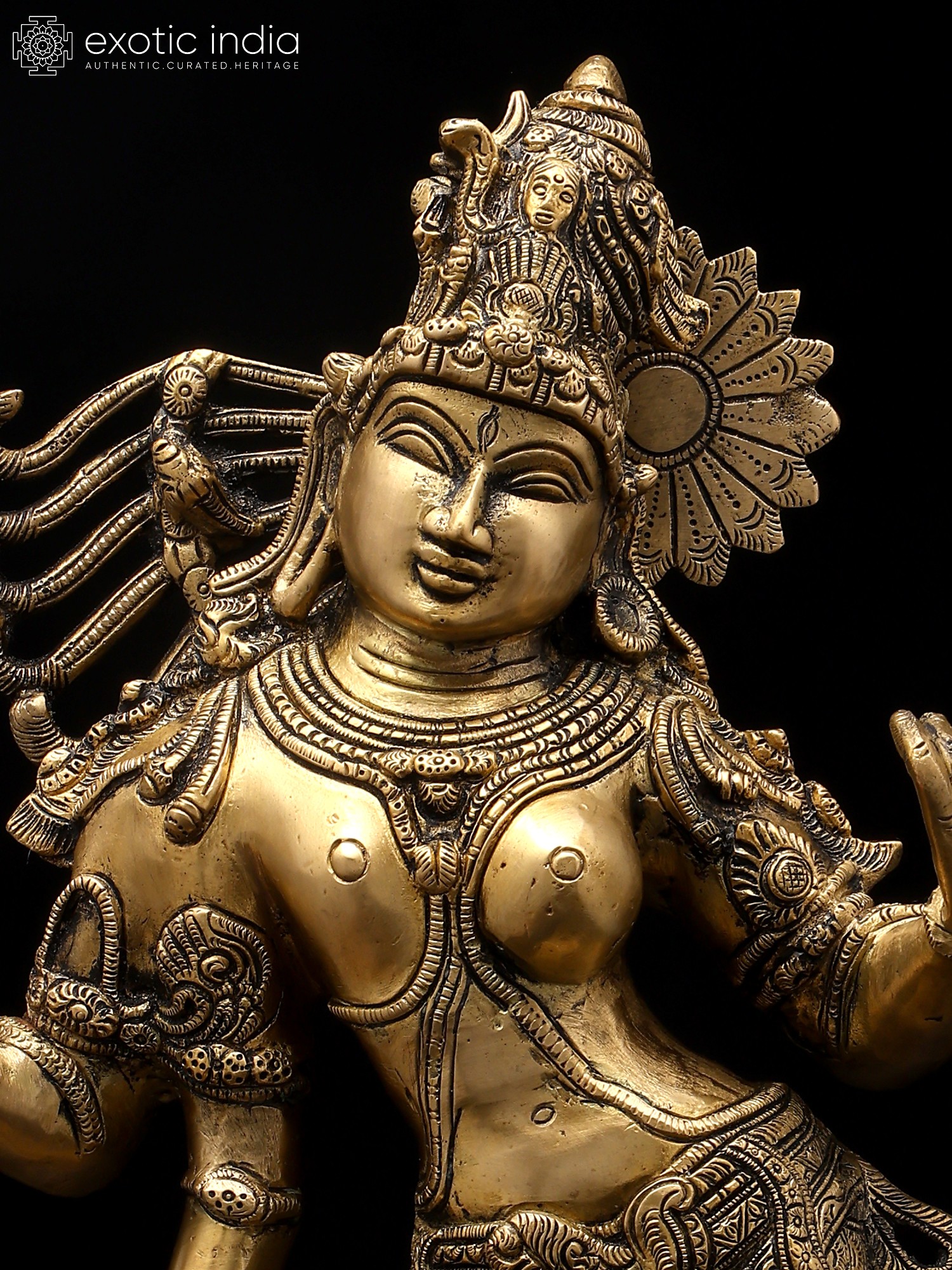 In iconographic perception, sculptural quality, craftsmanship, minute details, finish and aesthetic visualization this brass-statue is simply superb. Though a recent work of art, it excels medieval sculptures of Ardha-narishvara in many things : facial features, anatomy of the two aspects, portrayal of male and female elements and those related to Shiva and those related to Parvati and thematic insight and thrust.