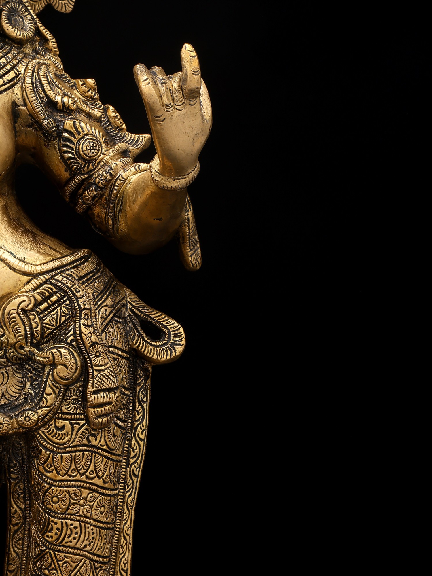 The statue, cast in brass, reveals greater lustre than would one cast in gold. It astonishes with its exceptionally beautiful craftsmanship conceiving one part side by side with the diagonally opposite other with perfect accuracy.