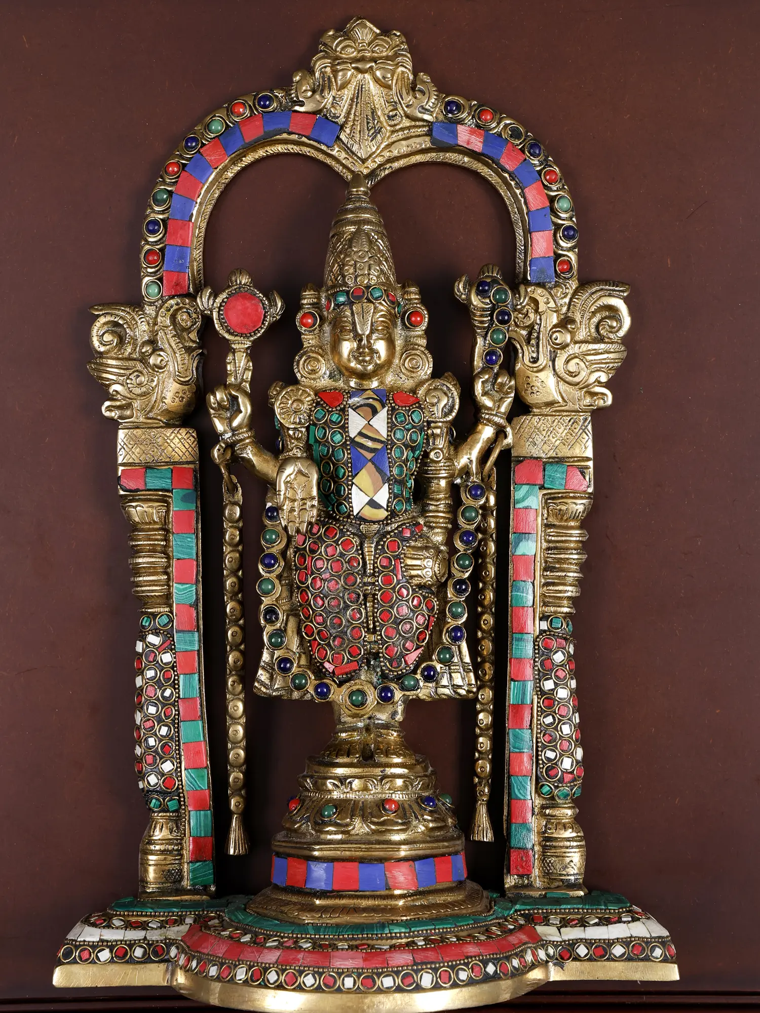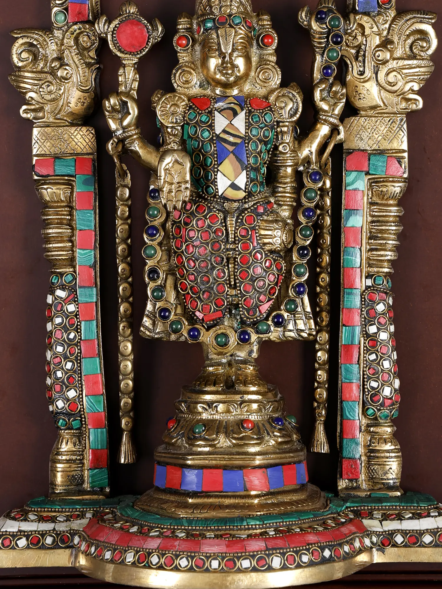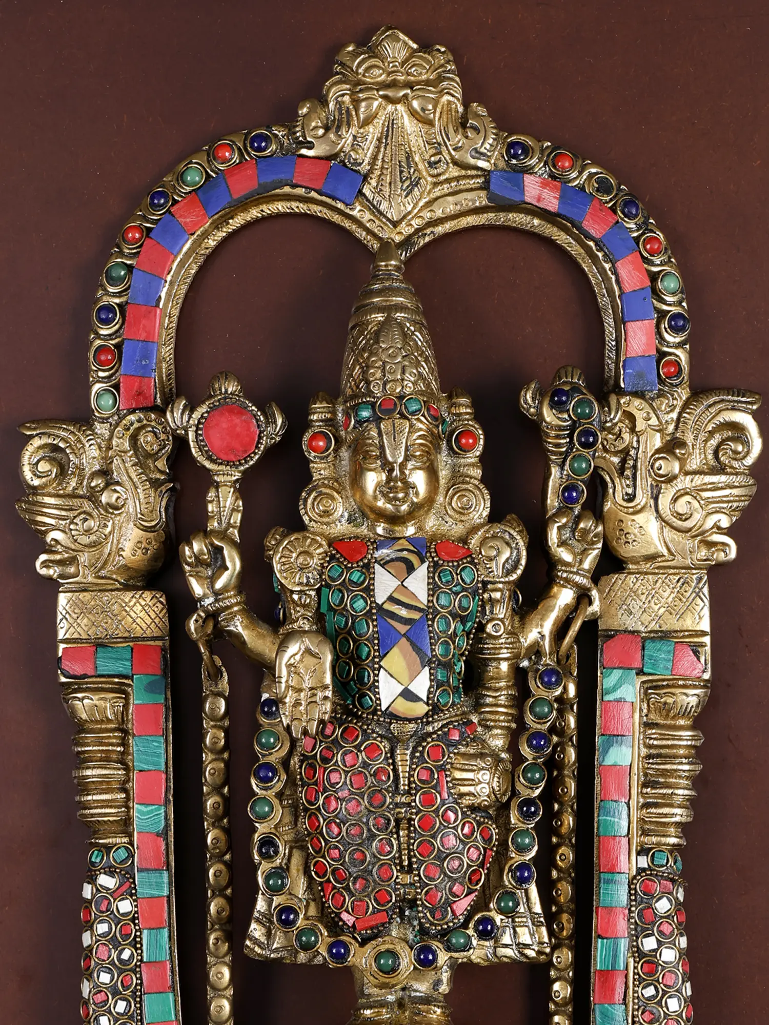 Every aspect of the deity is adorned with vibrant, colorful inlay pieces, representing the intricate ornamentation of the actual Tirupati temple idol.