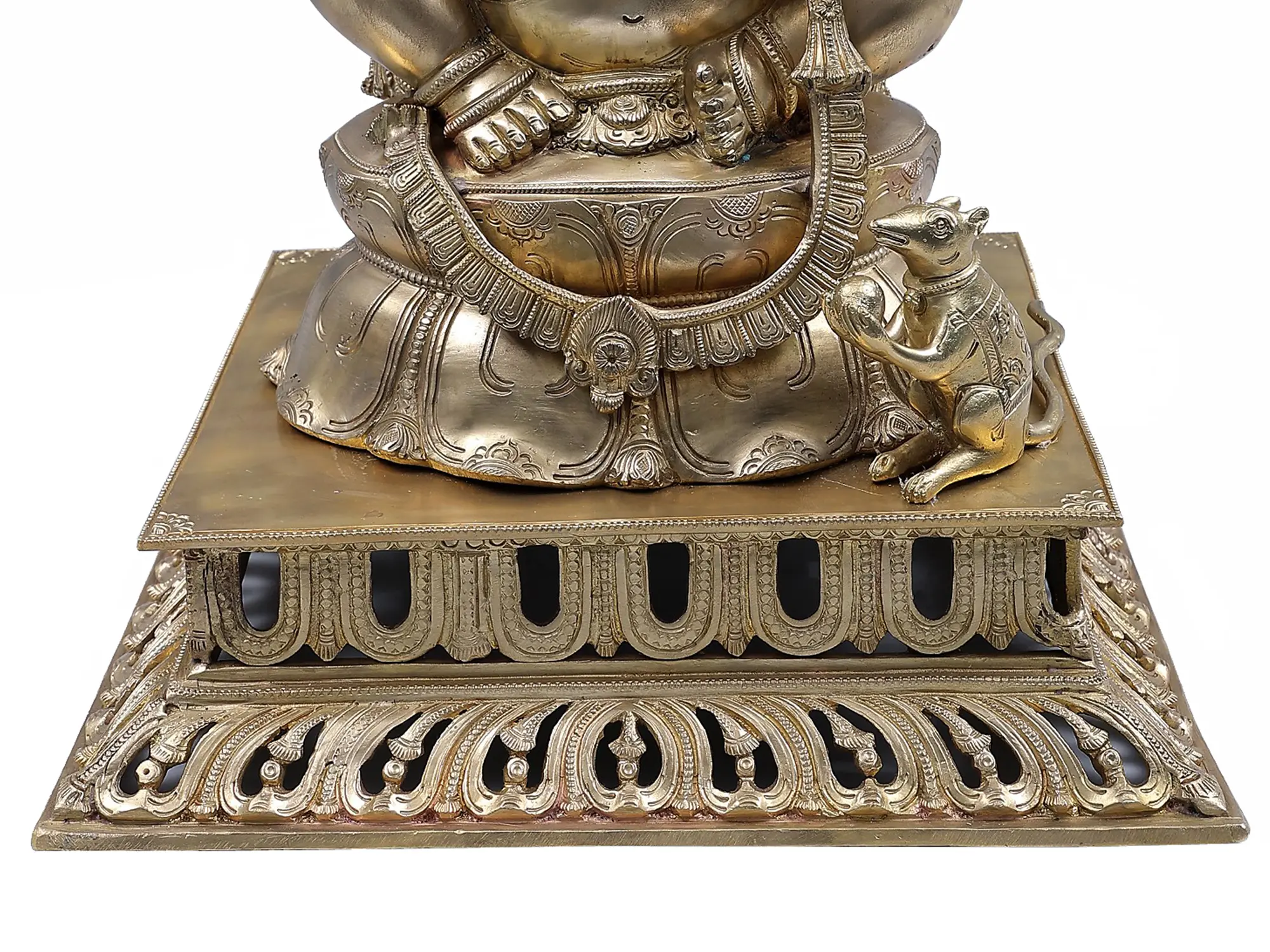 At the feet of the divine Ganesha sits his faithful mount and companion, Mushika, the mouse. In Hindu mythology, Mushika is not merely an animal but a representation of our own desires, fears, and worldly attachments. Lord Ganesha's ability to control and guide Mushika signifies his mastery over these internal obstacles. By taming the mouse, Ganesha teaches his devotees that through wisdom and discipline, one can overcome their own baser instincts and achieve spiritual liberation. The mouse's attentive posture, looking up at the deity, illustrates unwavering loyalty and devotion. This detailed depiction of Mushika, adorned with subtle decorative elements, adds another layer of symbolic depth to this captivating artwork, reminding us of the importance of self-control and the power of humble service. This striking bronze statue is more than just an object of devotion; it is a testament to the rich cultural heritage and spiritual traditions of India. It serves as a powerful reminder of the omnipresence of the divine and the path to overcoming life's challenges, making it an ideal addition to any home, temple, or sacred space seeking to invite auspiciousness and wisdom.