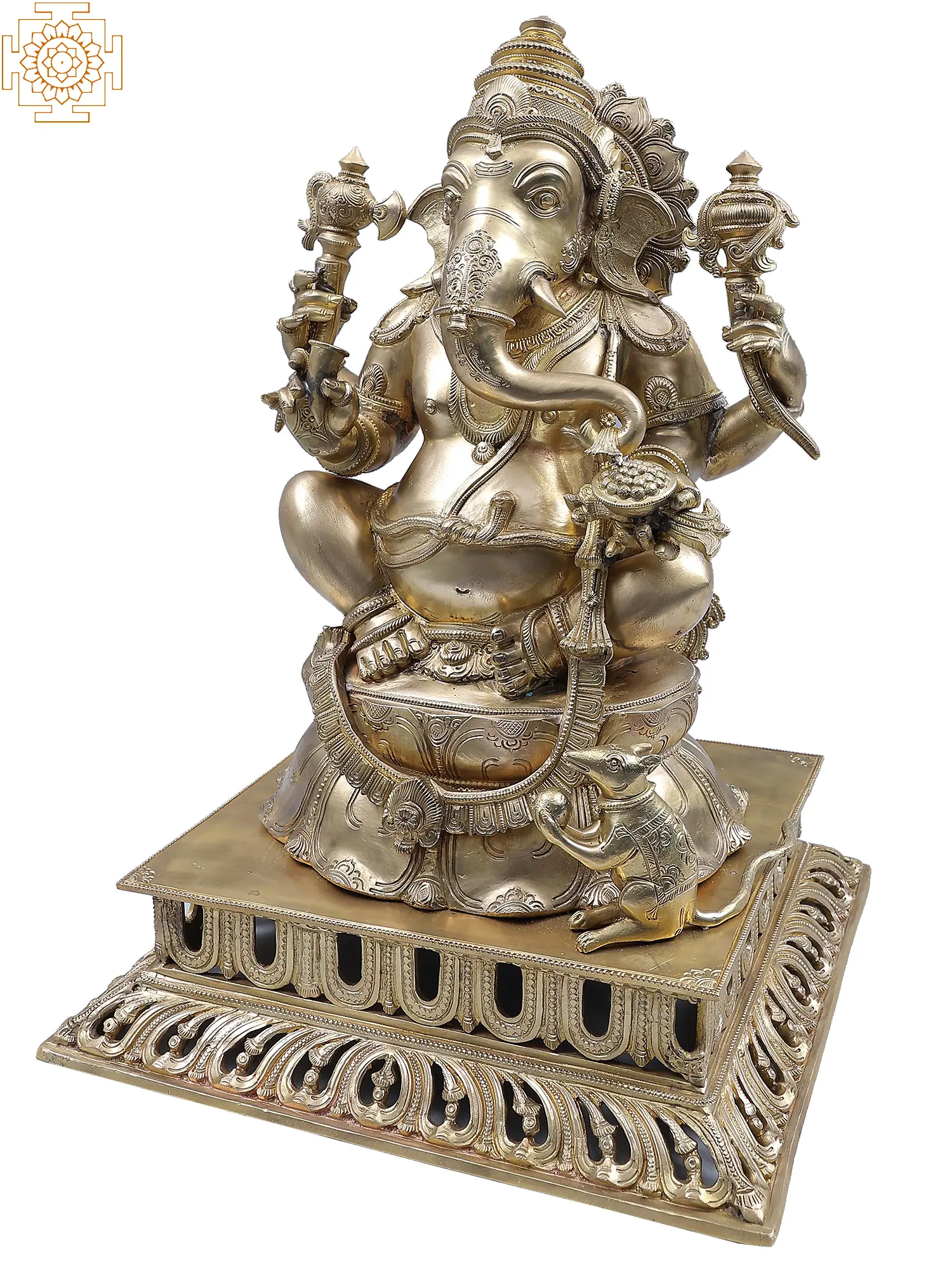 This magnificent bronze statue captures the divine presence of Lord Ganesha, the beloved elephant-headed deity revered as the remover of obstacles and the god of wisdom, intellect, and new beginnings. Crafted from lustrous bronze, this resplendent representation showcases the "Chaturbhuja" form, signifying Ganesha's four arms, each holding symbolic items that represent his powers and blessings. The intricate detailing of his divine form, from the majestic sweep of his trunk to the serene expression on his face, speaks of a masterful artistry that honors this revered deity. The tranquil posture of Ganesha, seated in a relaxed cross-legged position upon an intricately carved lotus base, exudes an aura of peace and stability. The lotus, a symbol of purity and spiritual awakening, signifies the blossoming of knowledge and the triumph of spirit over matter. His four arms are depicted in various symbolic gestures. The upper right hand often holds a battle-axe or an ankusha (an elephant goad), symbolizing his power to overcome difficulties and guide devotees. The upper left hand may carry a noose, representing his ability to capture and hold onto wisdom and good fortune. The lower right hand is often raised in a blessing posture, bestowing grace and prosperity, while the lower left hand might hold a modak (a sweet dumpling), signifying the rewards of devotion and the sweetness of spiritual realization.