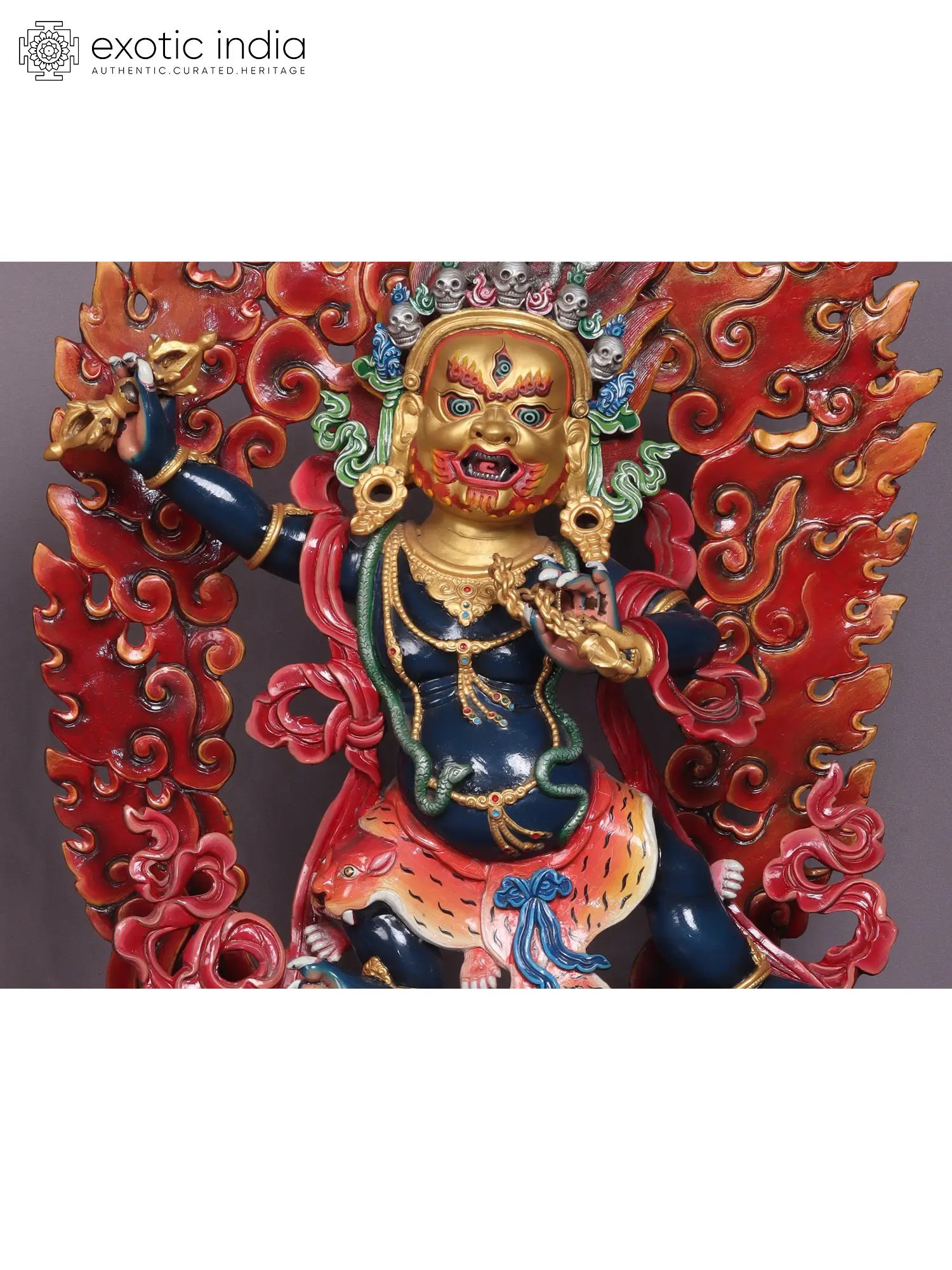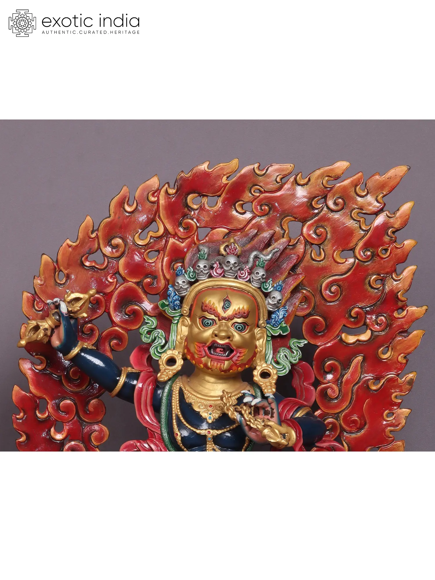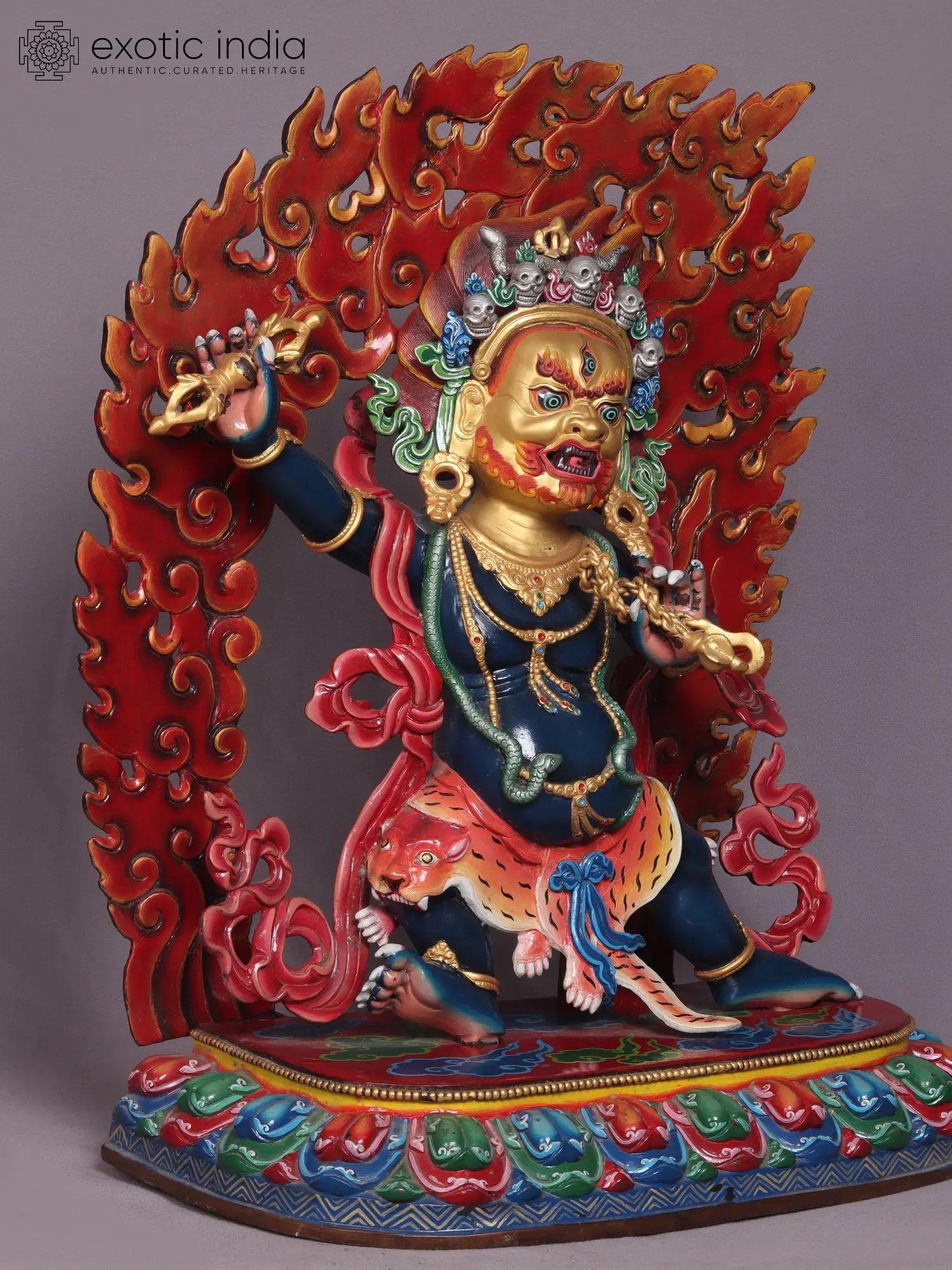 This exquisite sculpture from Nepal depicts Bodhisattva Vajrapani, a powerful and compassionate figure in the Buddhist tradition. Standing at 20 inches tall, the statue showcases Vajrapani in a dynamic posture, adorned with intricate ornaments and holding a vajra, a symbol of indestructible power. The craftsmanship and attention to detail are remarkable, capturing the deity's fierce yet benevolent expression. Bodhisattva Vajrapani represents the embodiment of strength and wisdom in the pursuit of enlightenment. Displaying this sculpture can inspire individuals on their spiritual journey, reminding them of the importance of courage and compassion.