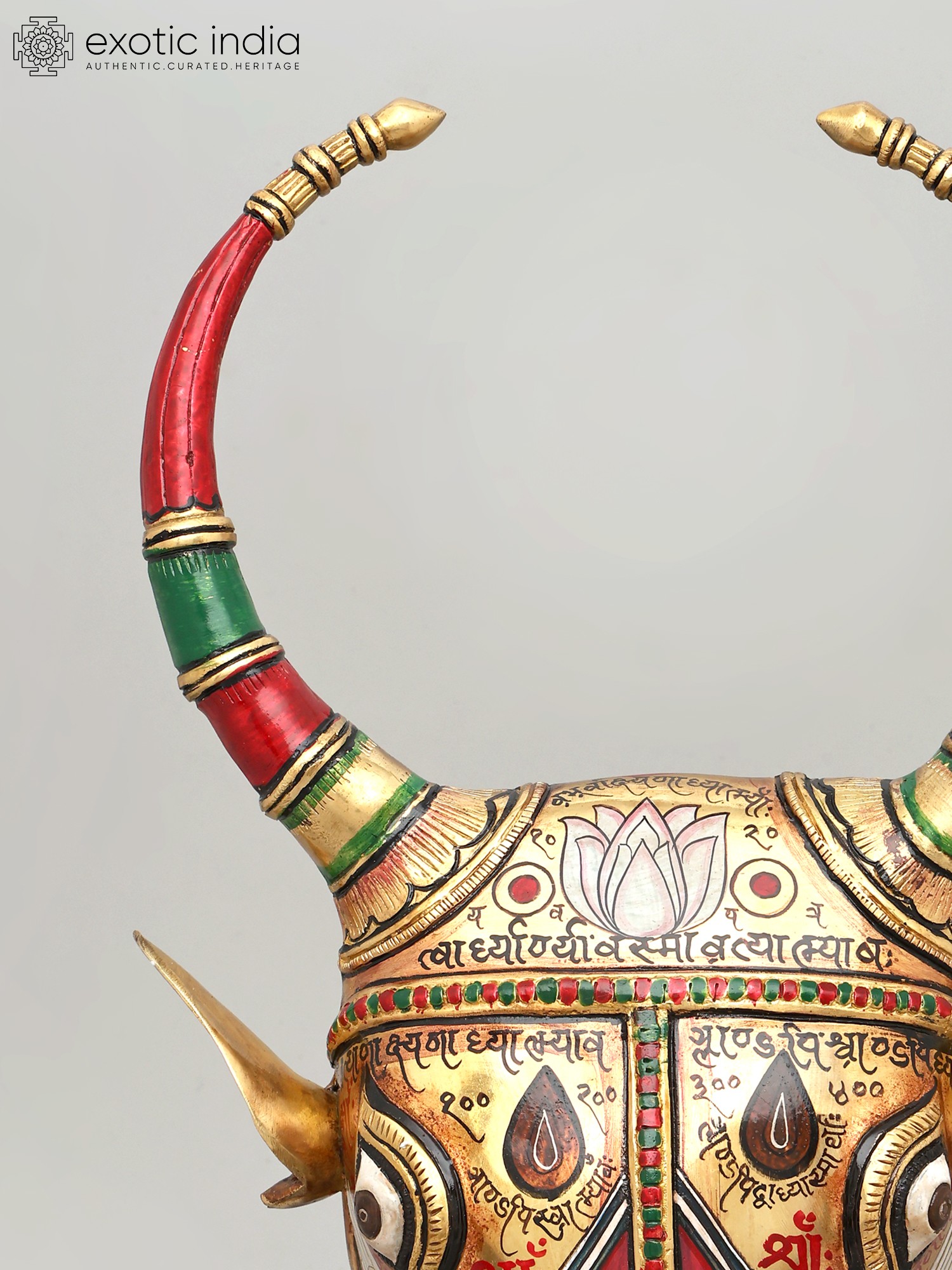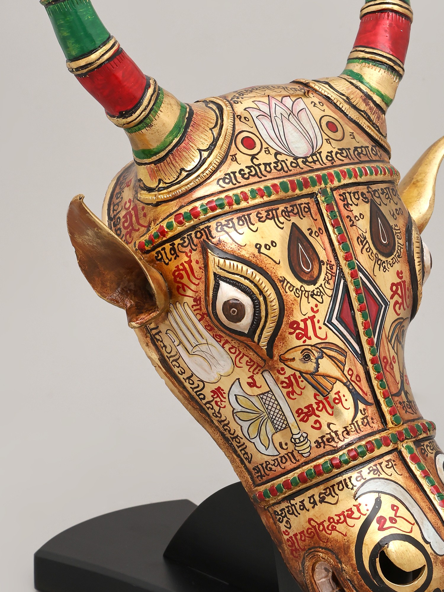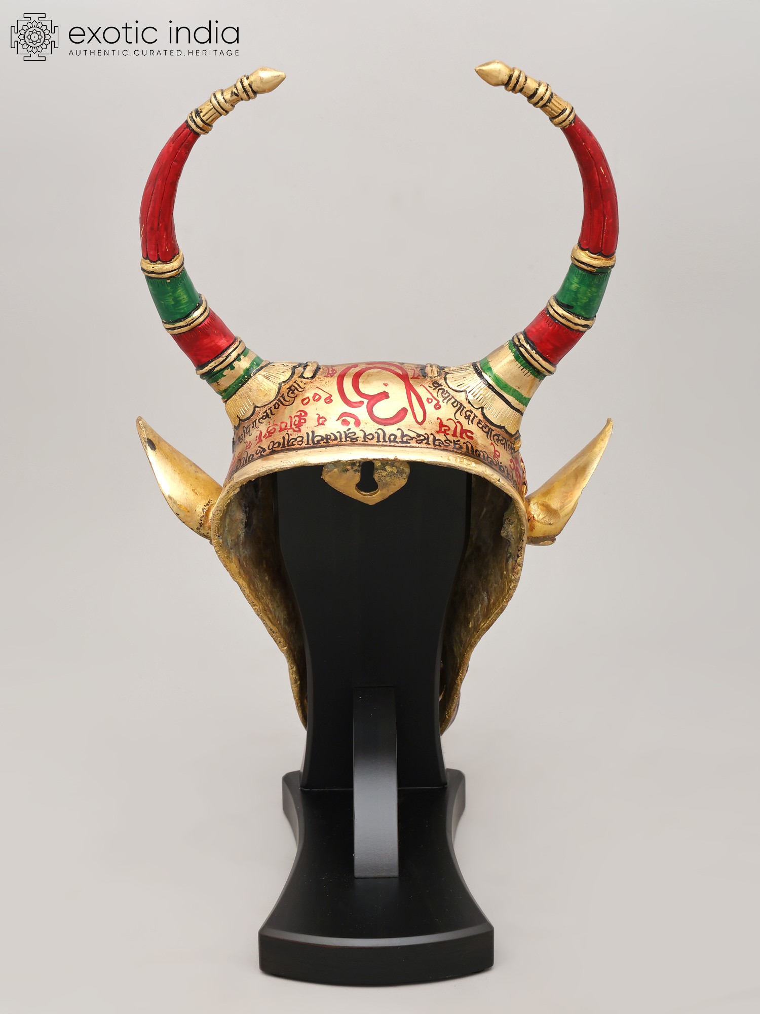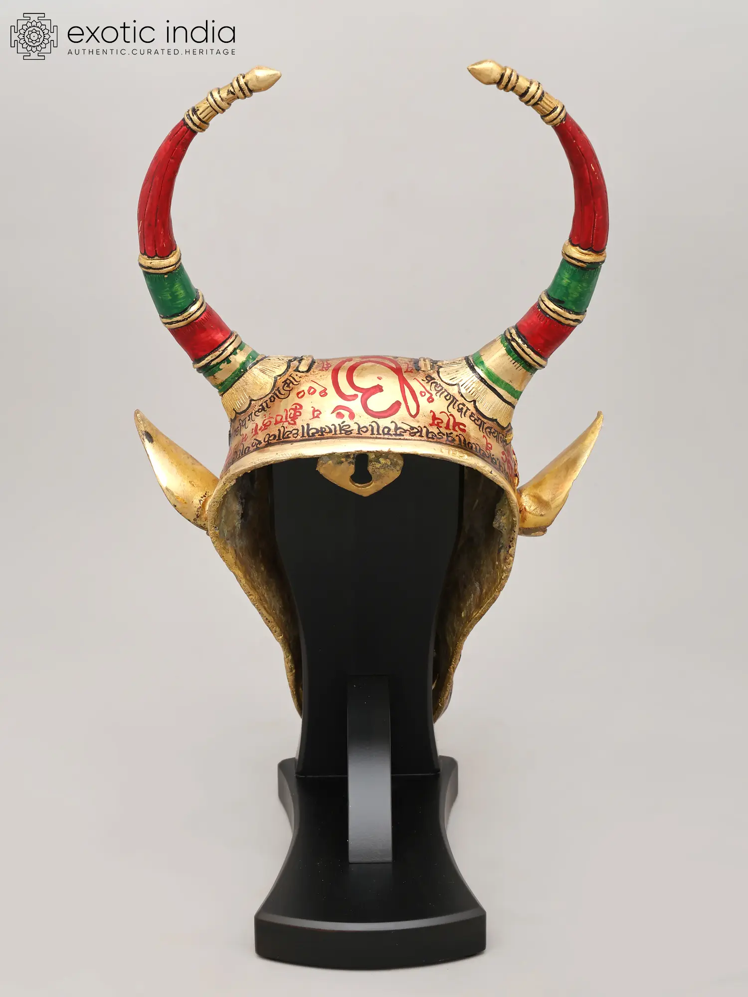 Witness the dedication poured into its creation, where brass forms the sturdy foundation of this magnificent piece. Artisans meticulously hand-etch and paint each detail, breathing life into the metal. The rich hues of red and green grace the elegantly curved horns, accented with the warm gleam of gold. This testament to traditional techniques ensures a creation that is not only visually stunning but also built to endure, embodying the spirit of artisanal excellence.