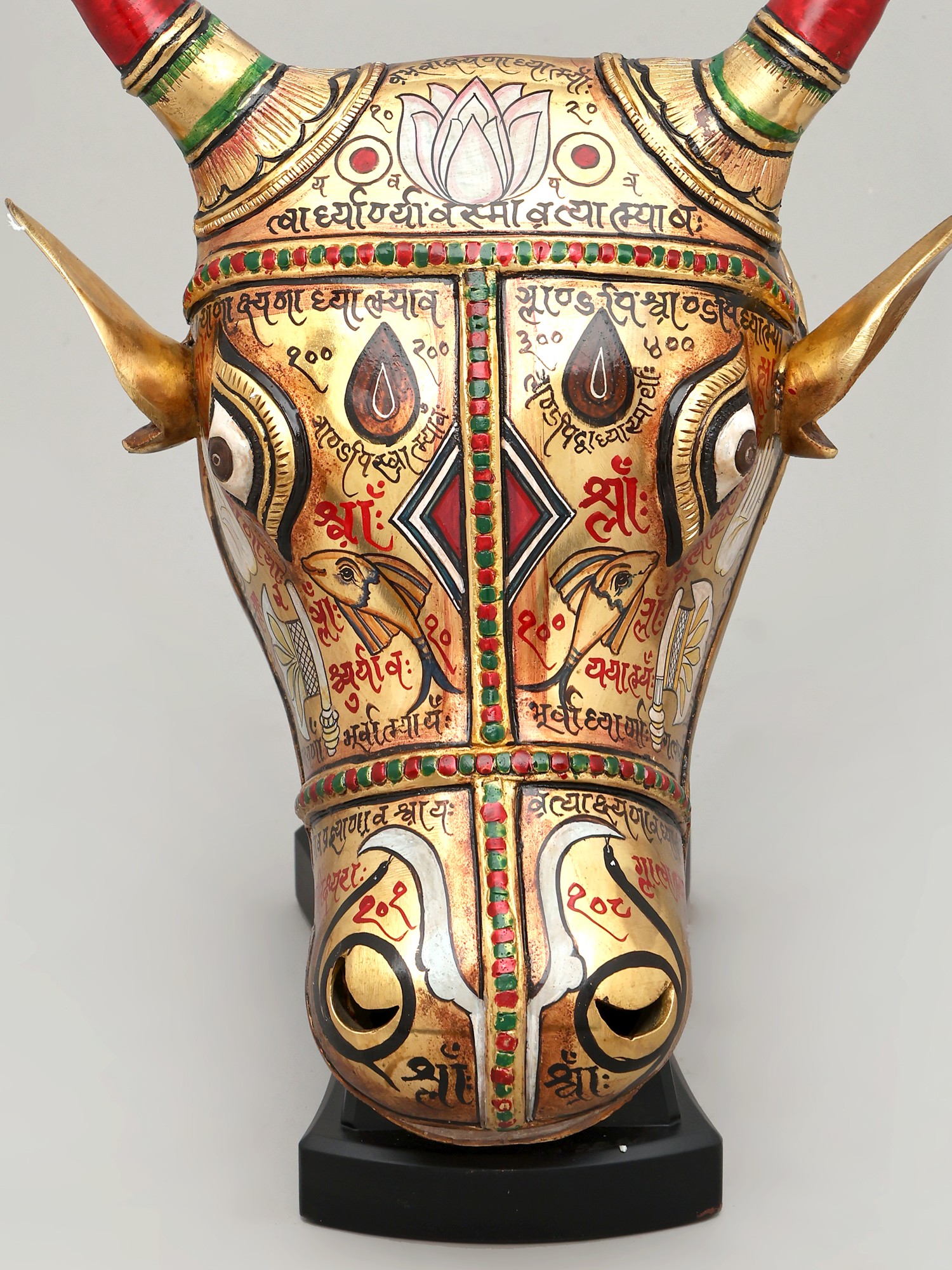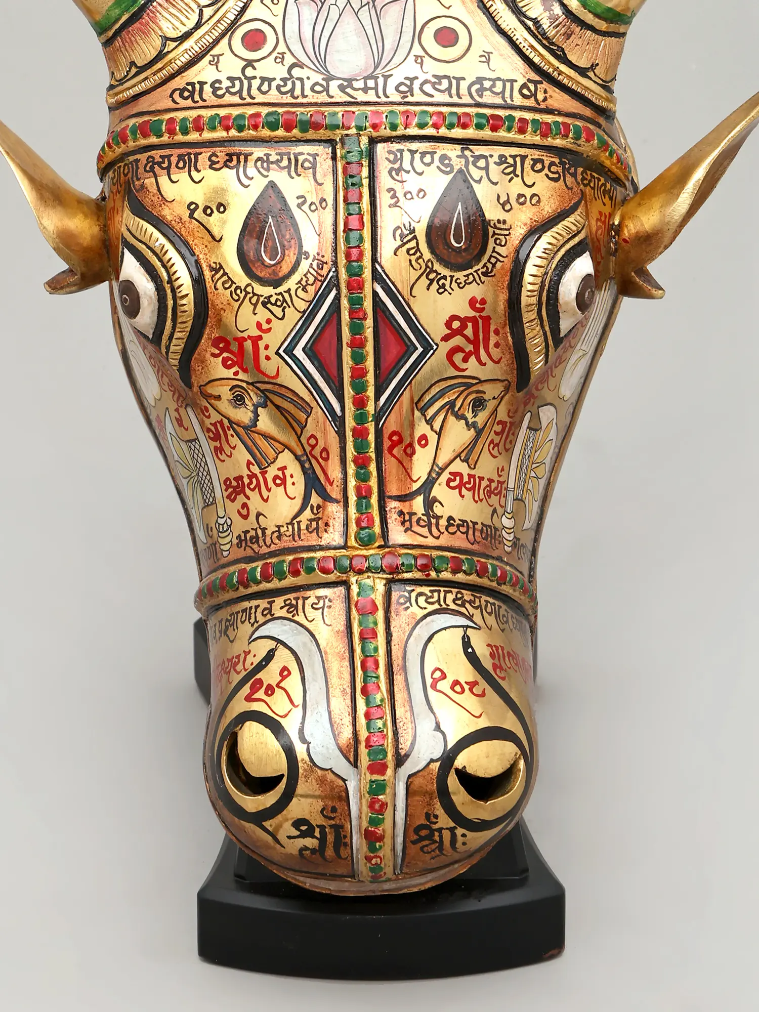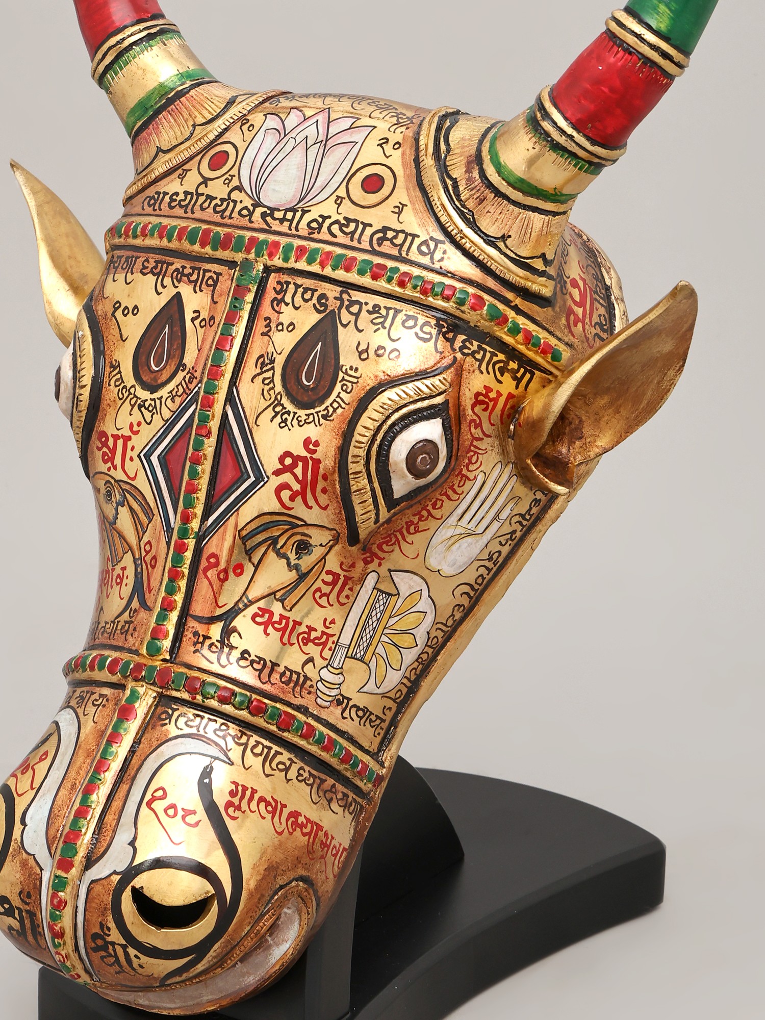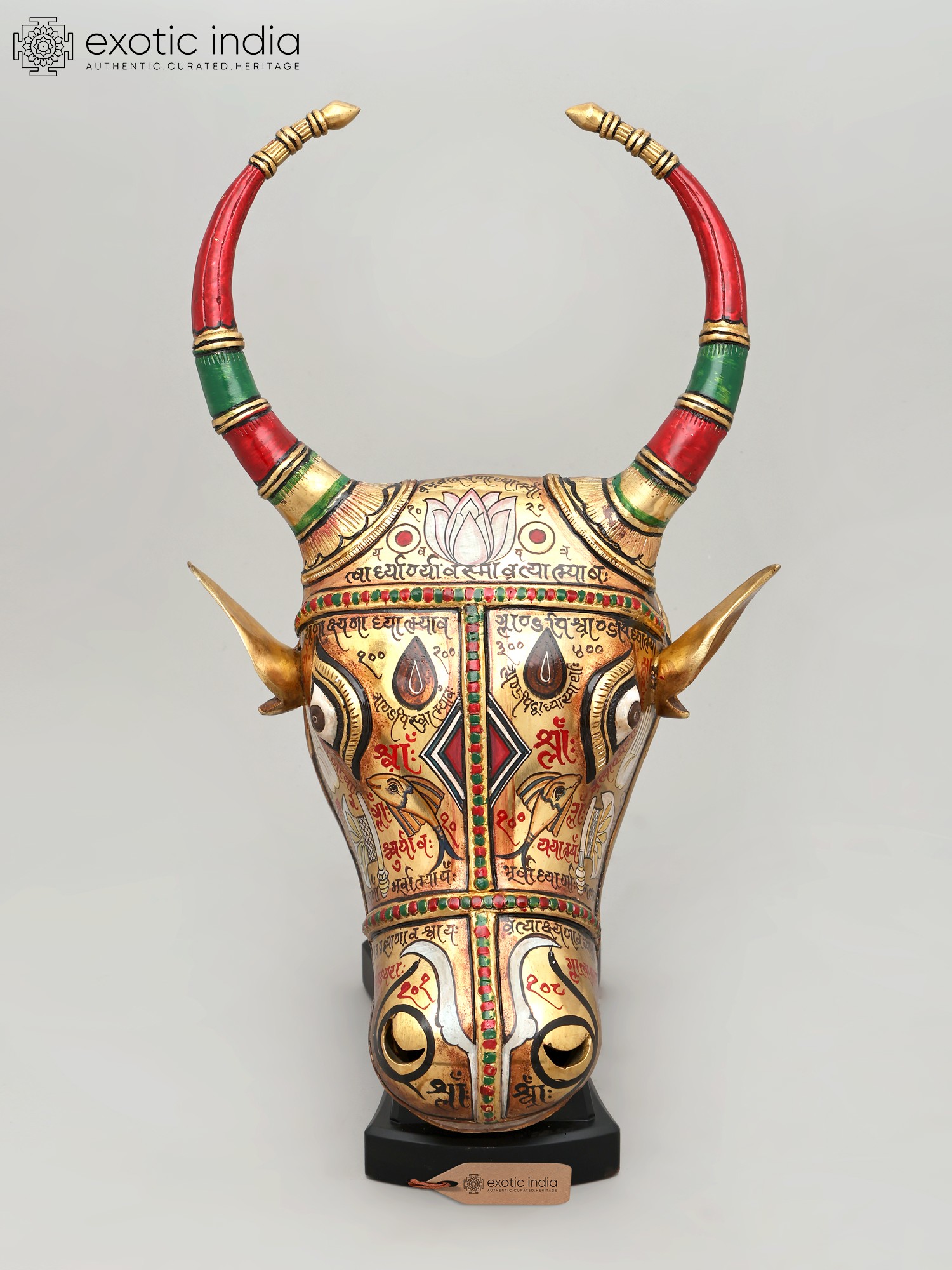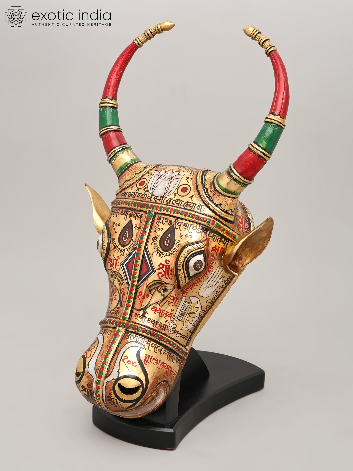 Witness the dedication poured into its creation, where brass forms the sturdy foundation of this magnificent piece. Artisans meticulously hand-etch and paint each detail, breathing life into the metal. The rich hues of red and green grace the elegantly curved horns, accented with the warm gleam of gold. This testament to traditional techniques ensures a creation that is not only visually stunning but also built to endure, embodying the spirit of artisanal excellence.