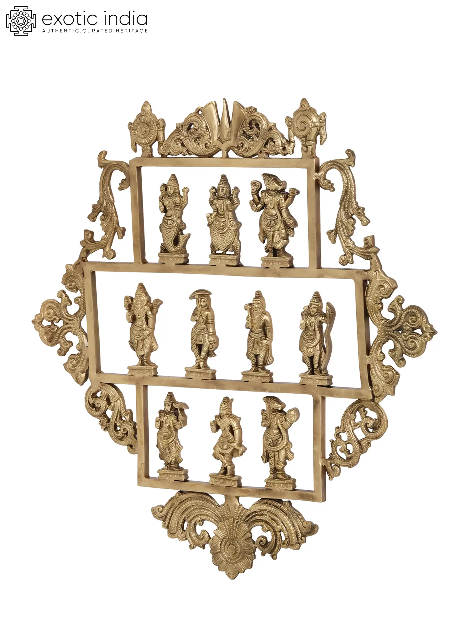 Wall hangings featuring sacred imagery of Gods and Goddesses have become popular choices as they serve to channel positive energy into homes. Devotees seek to create a spiritually charged environment, promoting a sense of peace and well-being. This Stylized Bronze Dashavatara Panel with Three Vaishnava Symbols Atop, crafted in Hoysala art, caters to these devotional needs. Handmade in South India, the panel showcases the ten avatars of Lord Vishnu arranged on three stands within a Hoysala-style vine decoration.