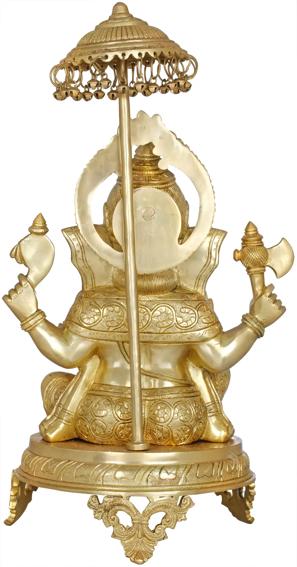 This statue captures several key attributes of Lord Ganesha. In one hand, he holds a parashu, or axe, representing his power to sever attachments and overcome negative forces. In another hand, he blesses with abhaya mudra, a gesture of fearlessness and protection, assuring devotees of his safeguarding grace. His mouse companion, Mooshika, symbolizes humility and control over desires, always by his side to carry him swiftly through obstacles. The elaborate parasol, adorned with tiny bells, is a striking addition. Such canopies often signify honor and royalty. In some traditions, the tinkling of bells is believed to awaken the senses, ward off evil spirits, and create a sacred ambiance. This detail adds a layer of visual and symbolic richness, enhancing the overall aura of divine majesty surrounding Ganesha. The sturdy brass construction ensures the longevity and enduring beauty of this sacred representation, making it a timeless piece for any spiritual space or discerning collection. ––––––––––––––––––––