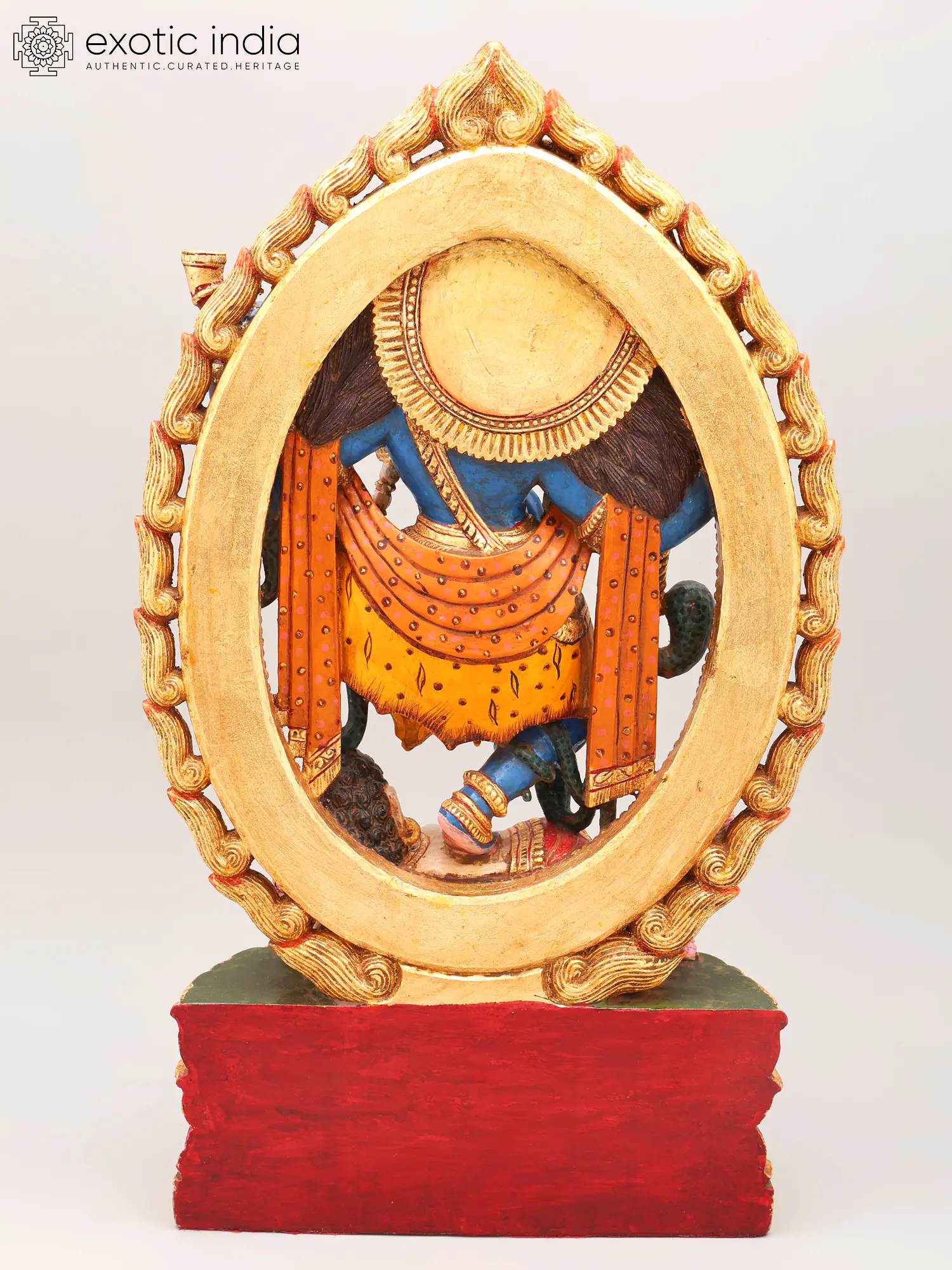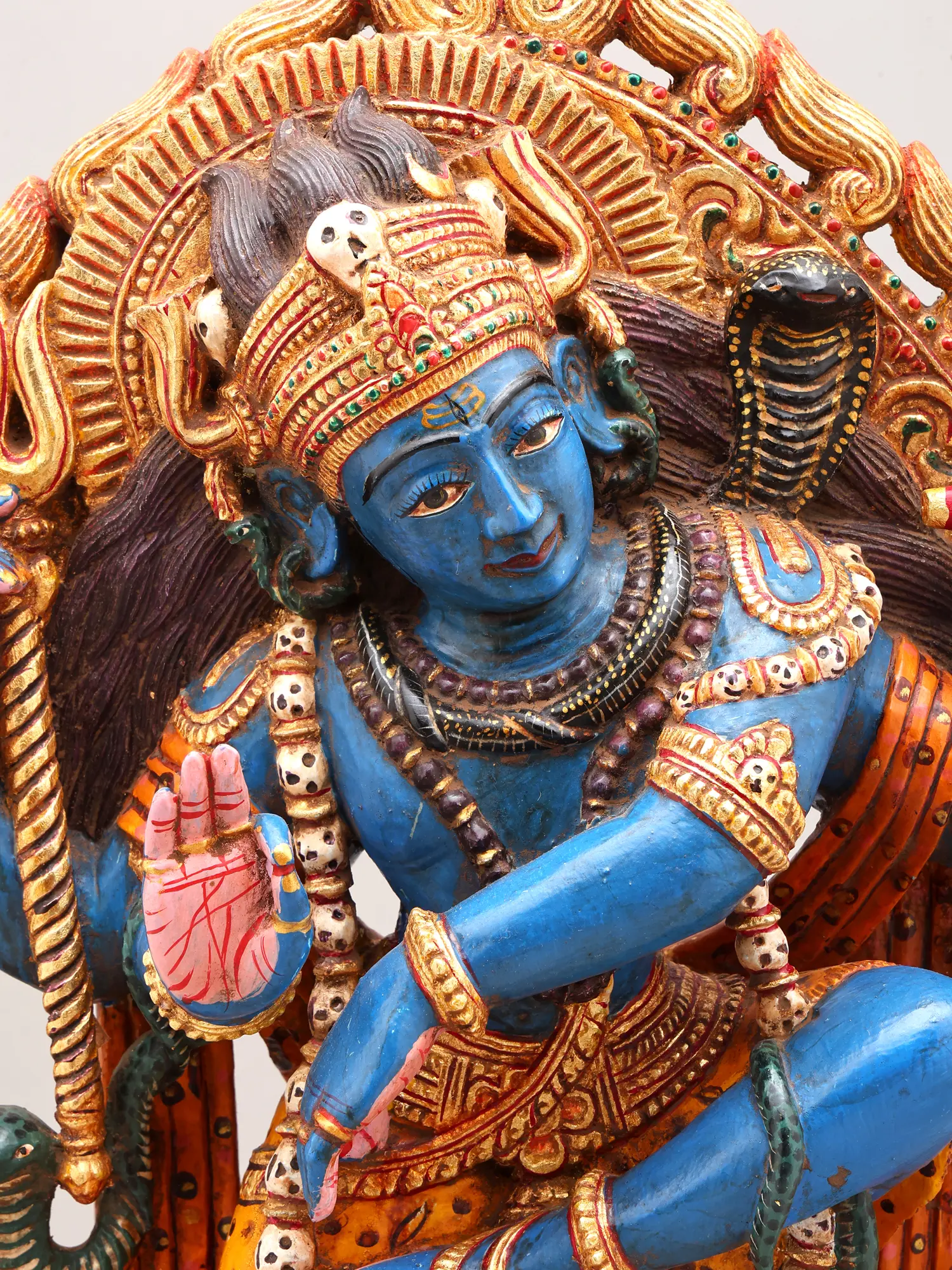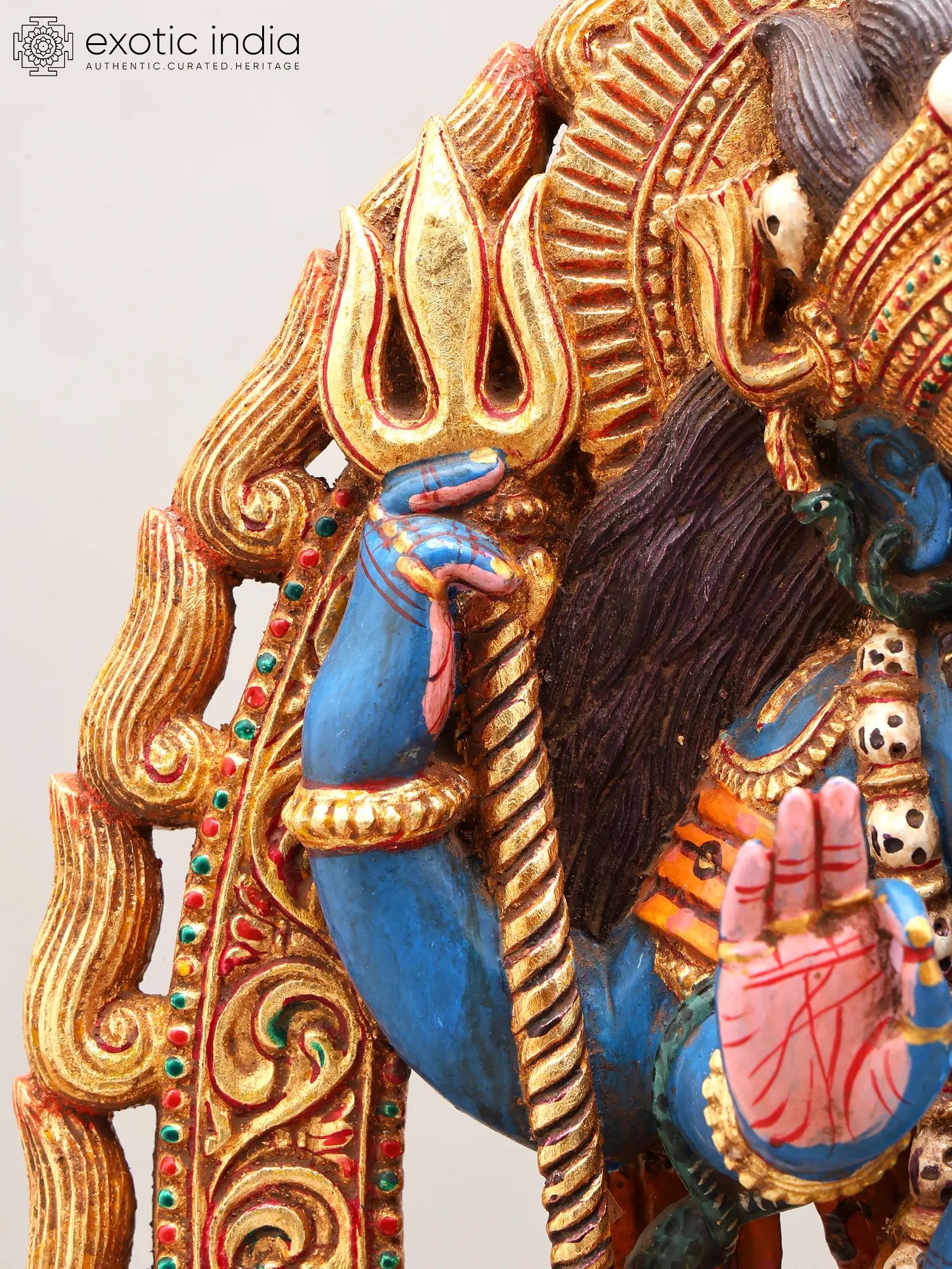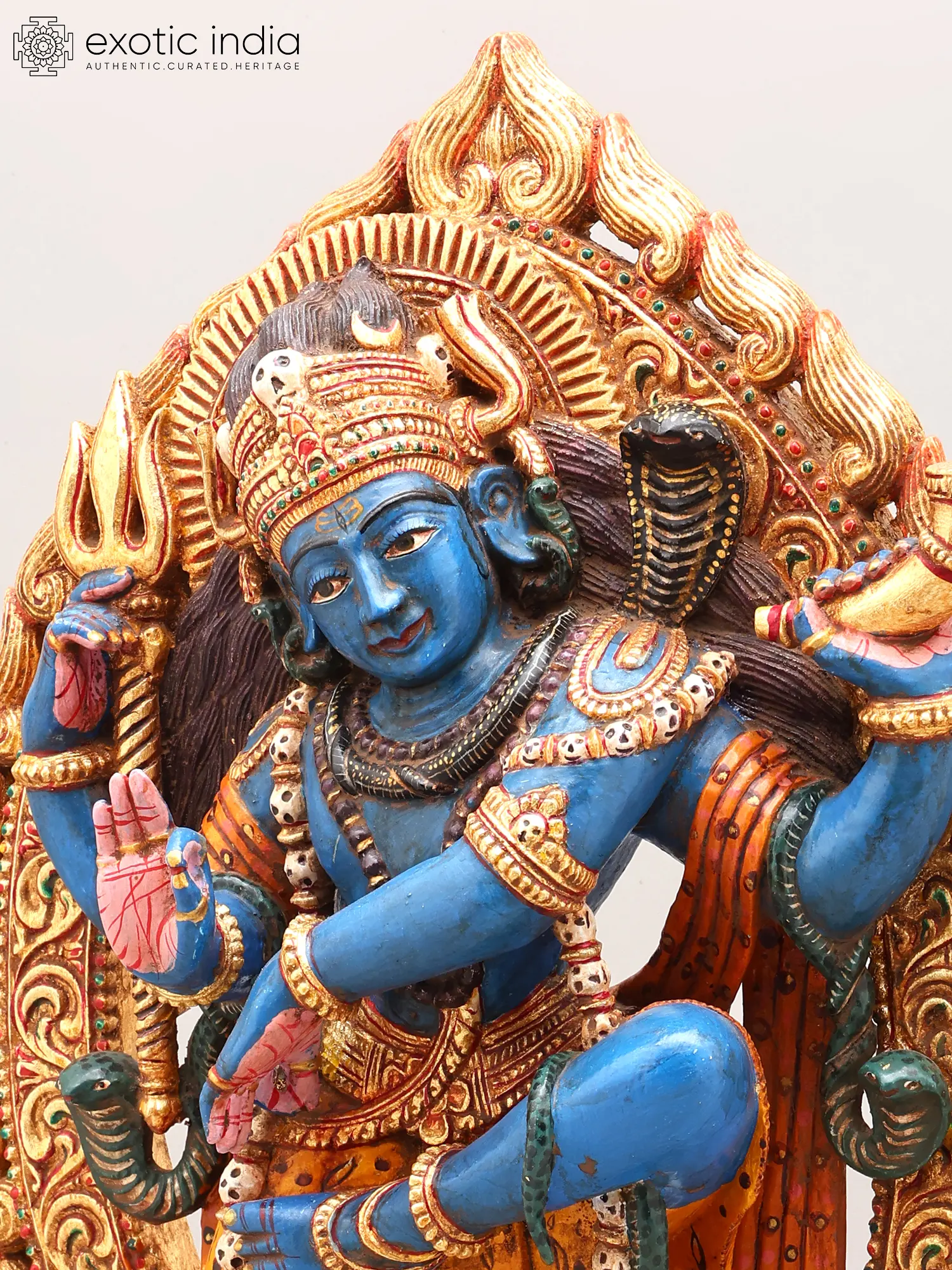 Vibrant blue hue of Shiva contrasts with rich gold and crimson accents, creating a commanding visual.