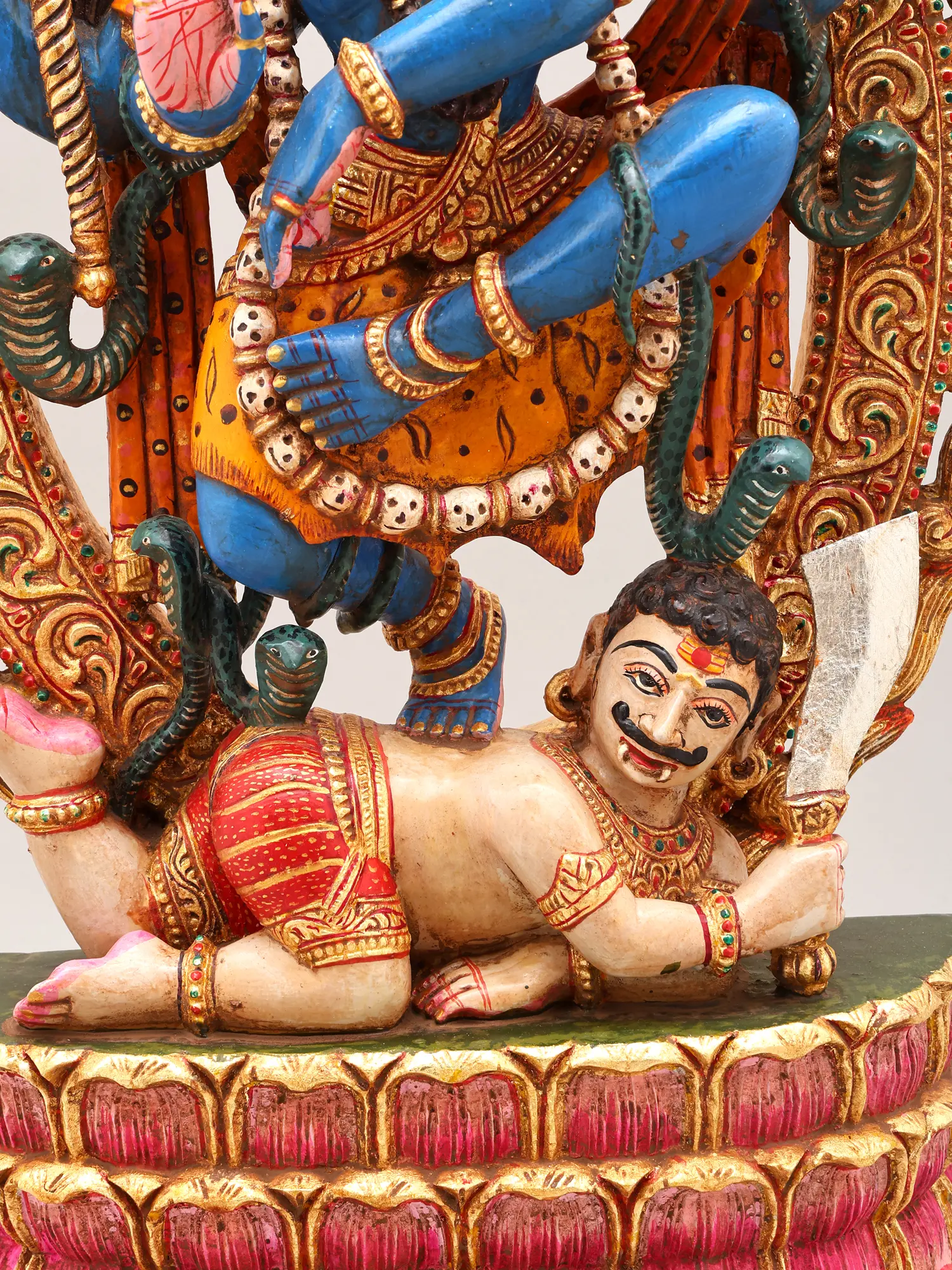 Adorned with symbolic elements like coiled serpents representing control over primal energies, and a trident.