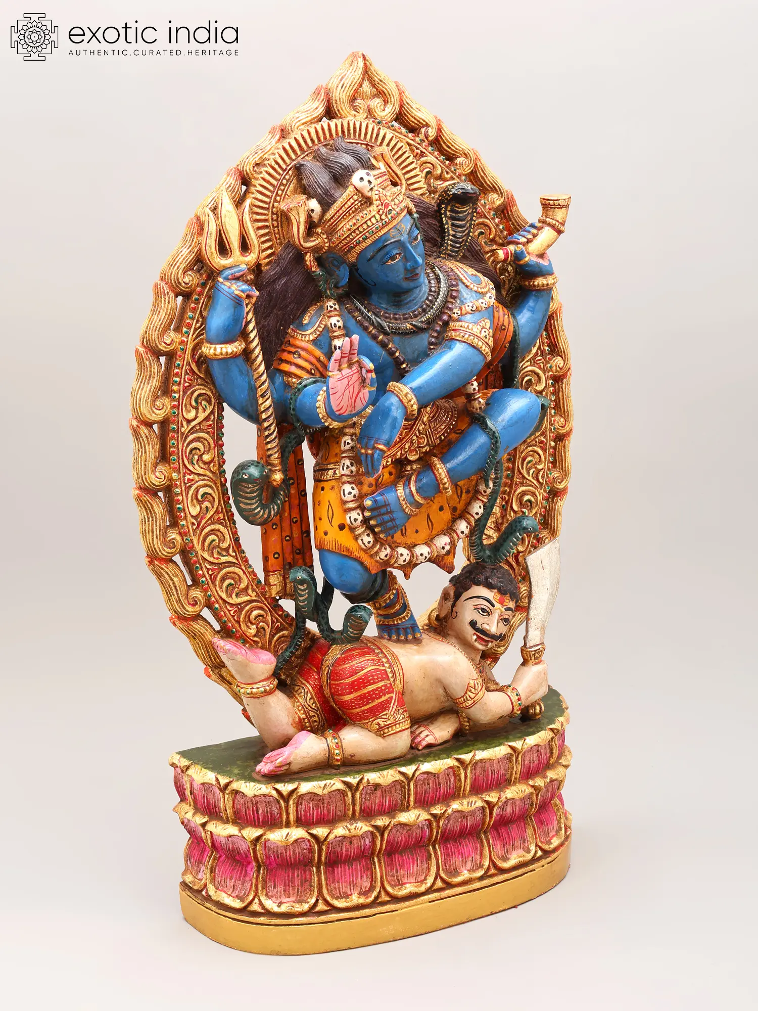 The vibrant azure hue of the central deity, Lord Shiva, commands attention, set against a backdrop of burnished gold and deep crimson. Coiled serpents artfully adorn the form, symbolizing control over primal energies, while the divine trident, a symbol of Shiva's cosmic power, crowns the composition. The dynamic posture, frozen in the midst of a celestial dance, conveys both immense power and fluid grace, a testament to masterful composition. Its considerable height of 20 inches ensures it is a commanding presence, measuring 11.5 inches wide and 4 inches deep.
