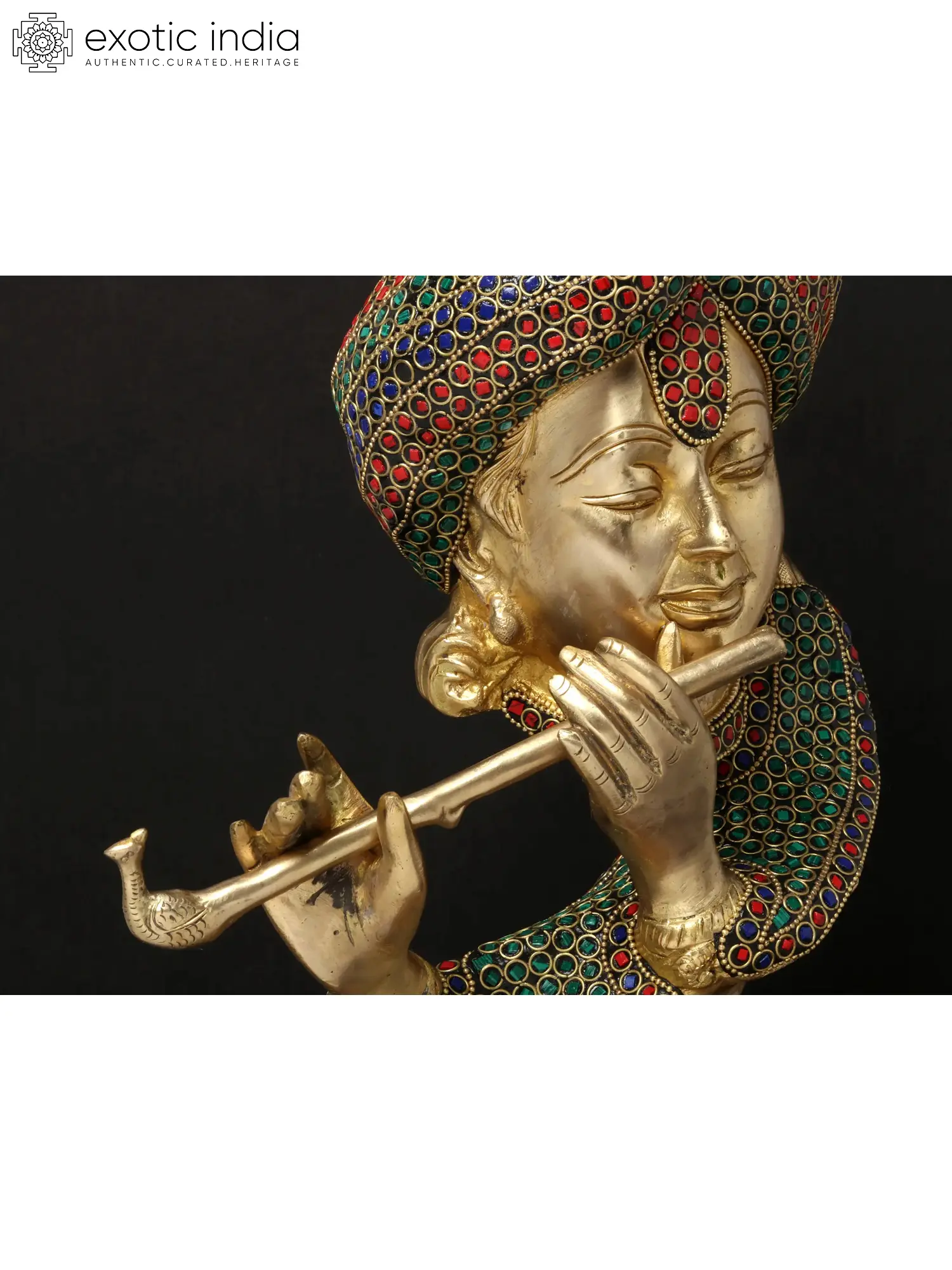 This Krishna murti is a pure brass, highly stylised sculpture. A strip of skilfully carved metal starts from the base of the neck, coursing across space to gather in a delicate, solid fold upon the simplistic, round-shaped pedestal. Visually, it is indicative of His signature tribhanga stance.