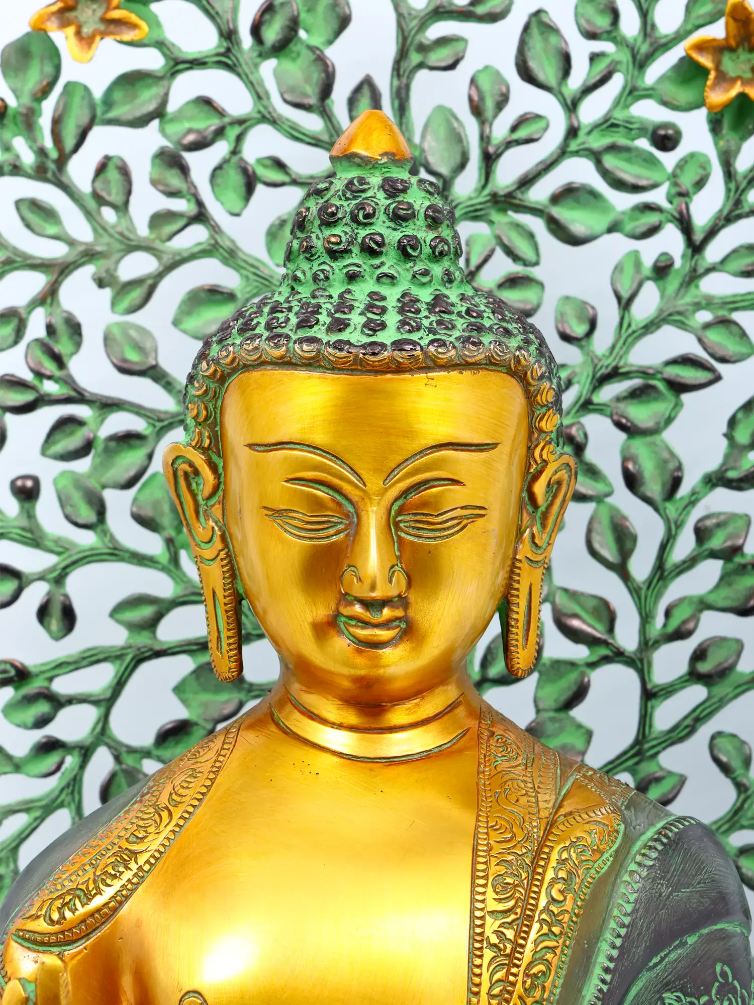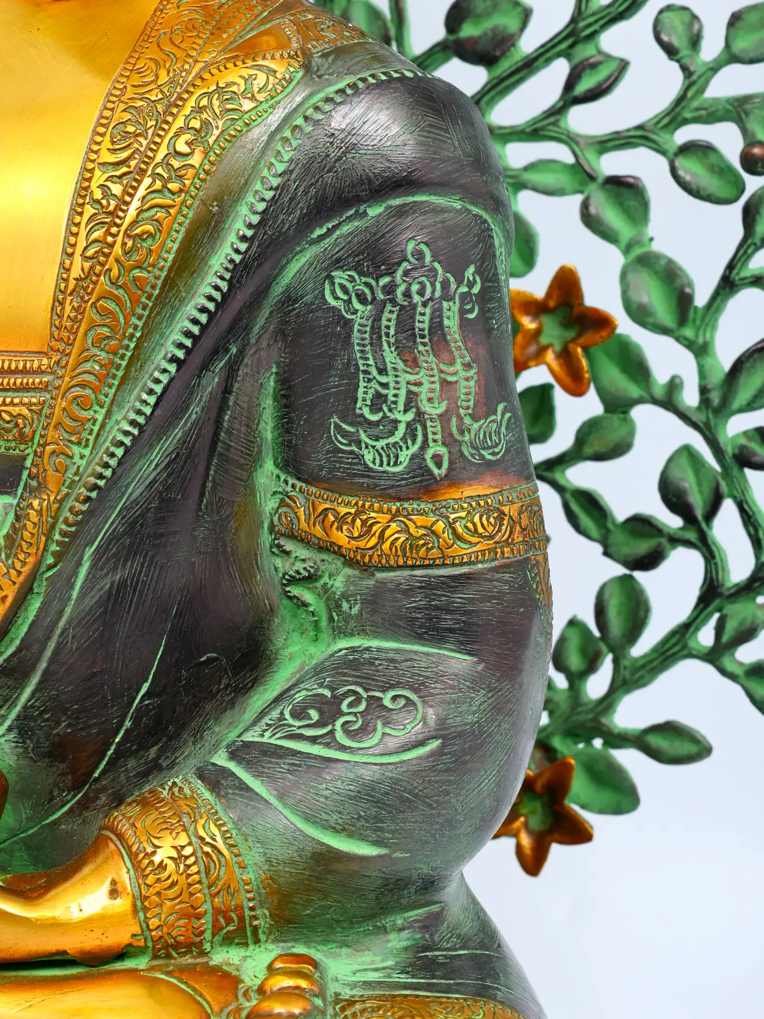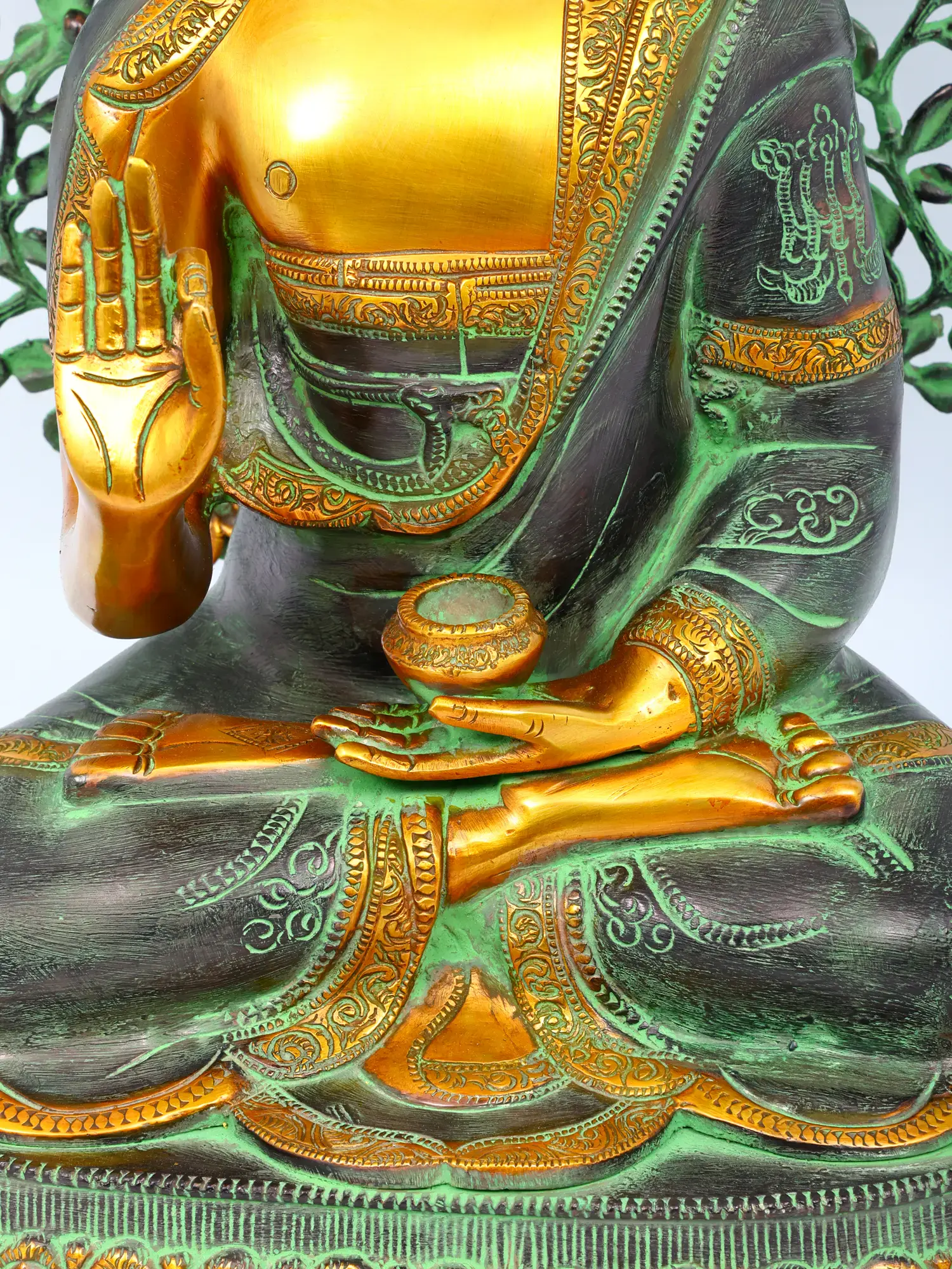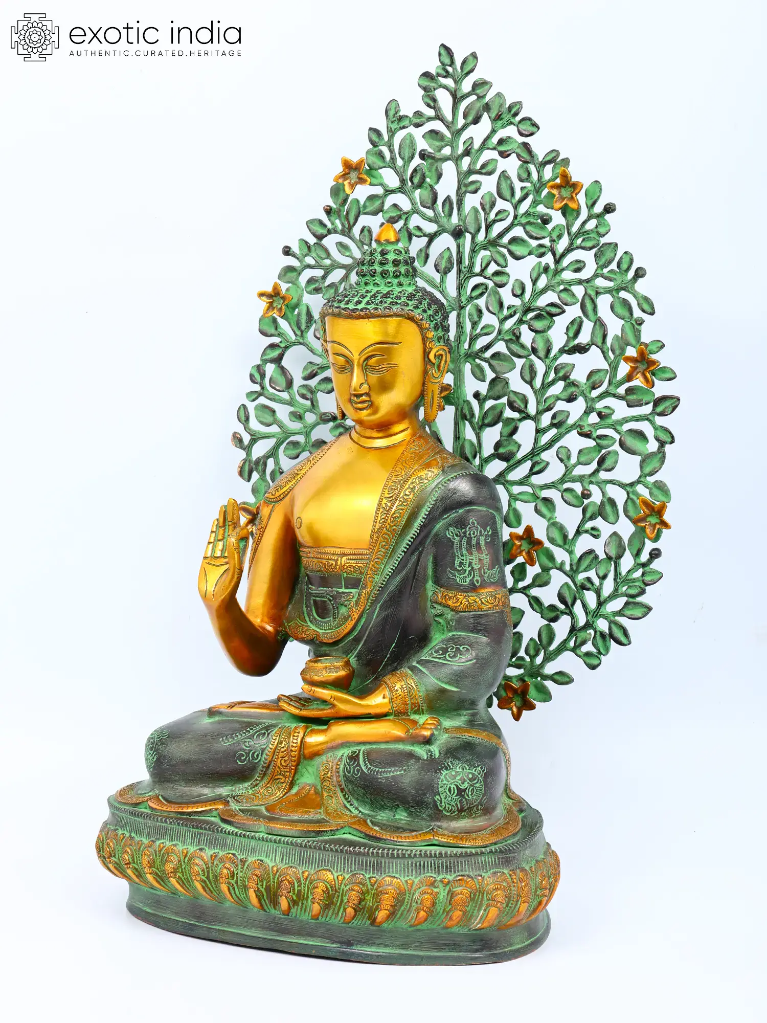 Shakyamuni Buddha stands in the serene ambiance of brass, enveloped by the sacred Bodhi tree, a symbol of enlightenment and profound wisdom. With hands gracefully poised in the gesture of teaching, he imparts the timeless truths of the Dharma to all beings. Crafted with exquisite detail and reverence, this brass statue captures the essence of the Buddha’s divine presence and compassionate teachings.