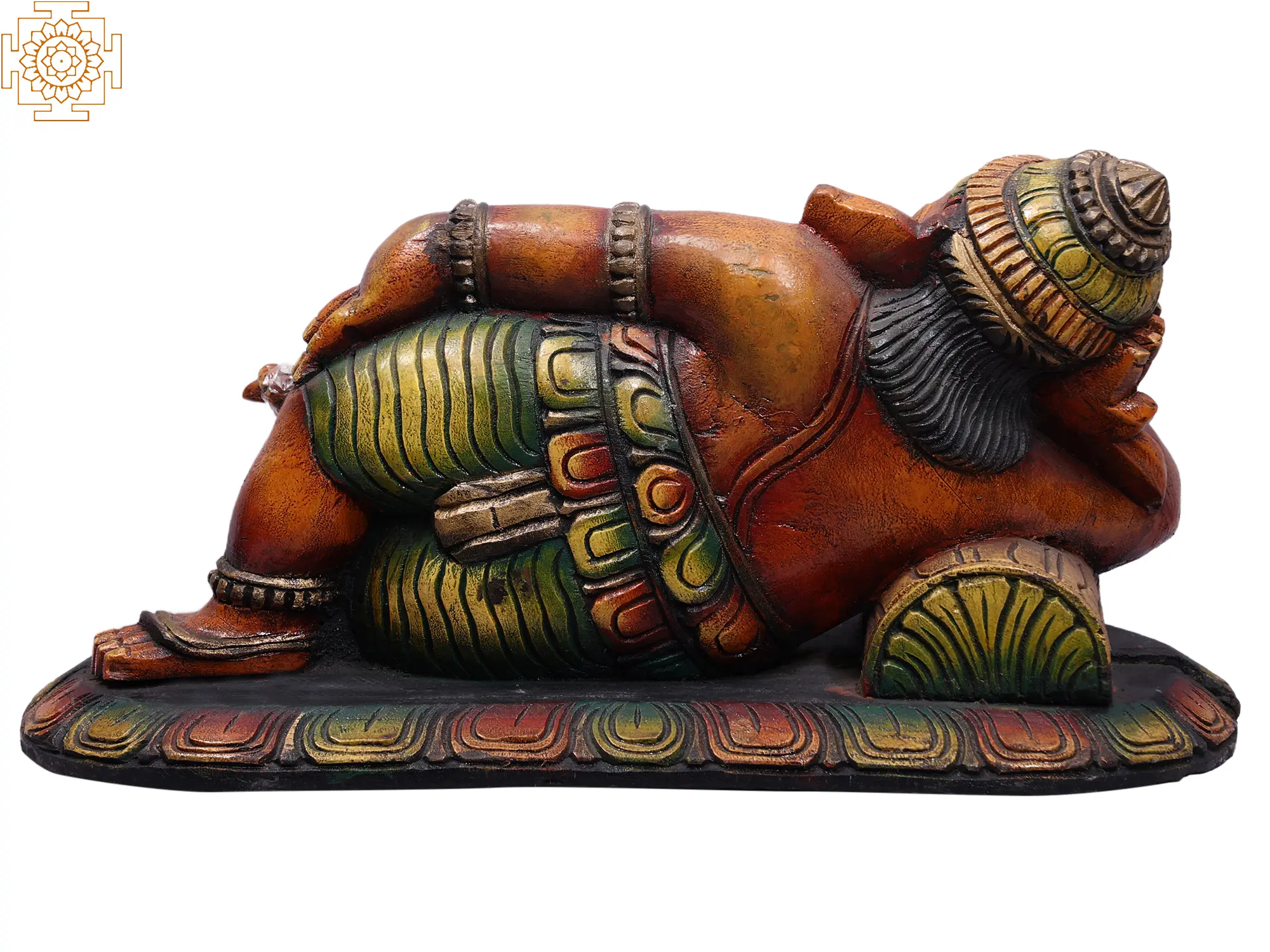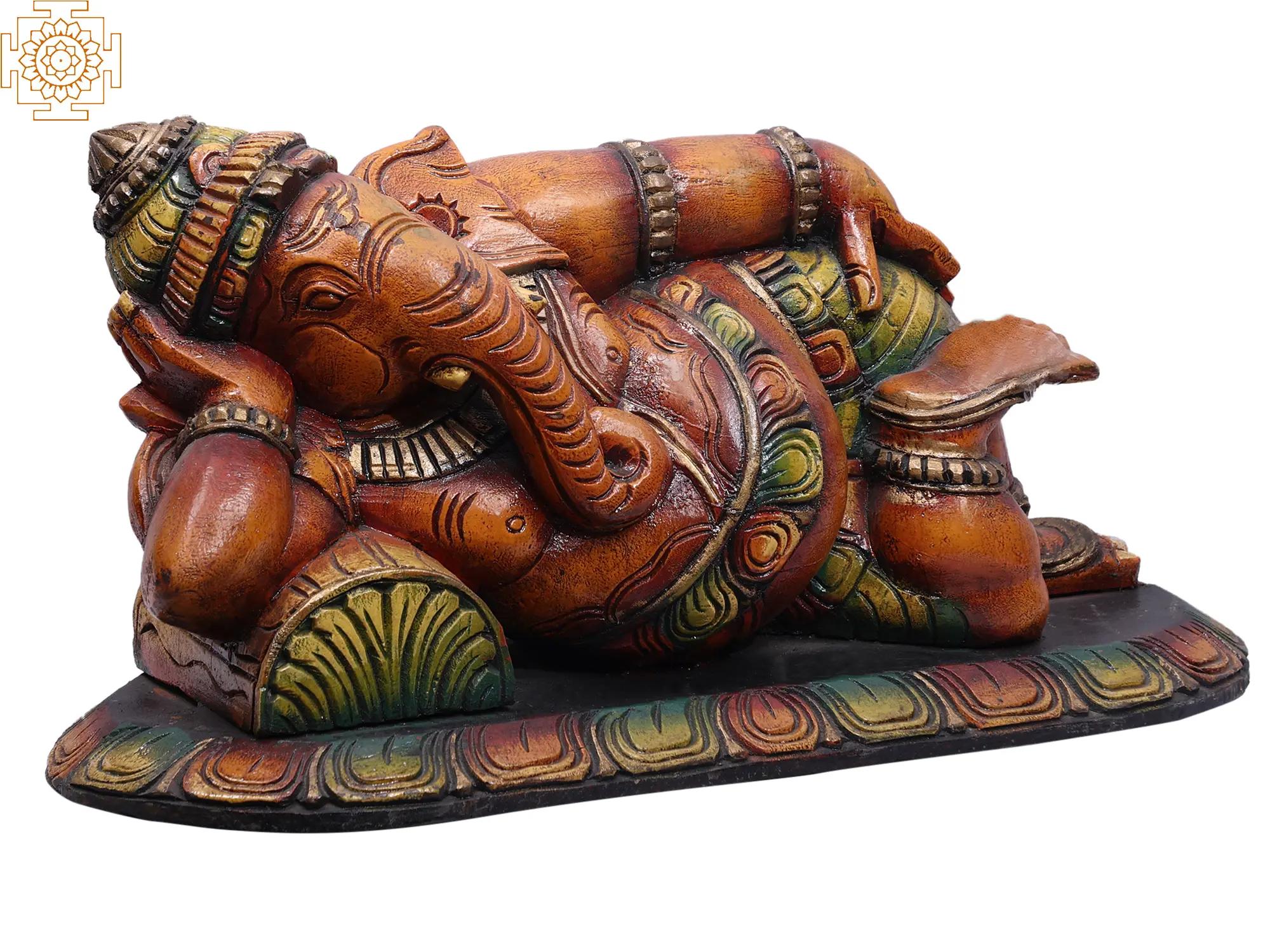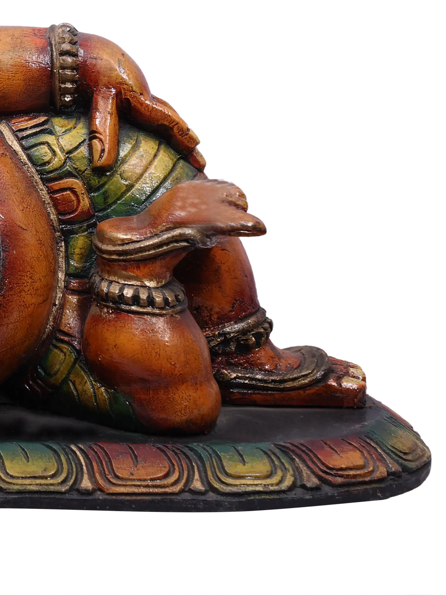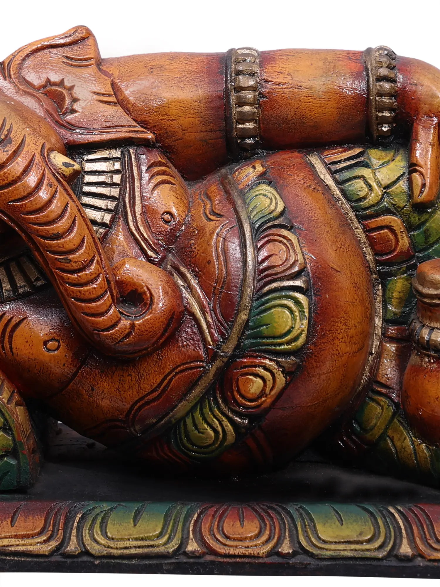 This exquisite wooden carving captures Lord Ganesha in a rare moment of repose, a profound symbol of peace and thoughtful contemplation. Unlike his more dynamic portrayals, this depiction invites a sense of calm, reflecting the immense wisdom and strategic thinking that the Remover of Obstacles possesses. The rich, warm tones of the wood, accentuated by vibrant yet harmonious colors, bring this divine figure to life, making it a captivating centerpiece for any spiritual or decorative setting.