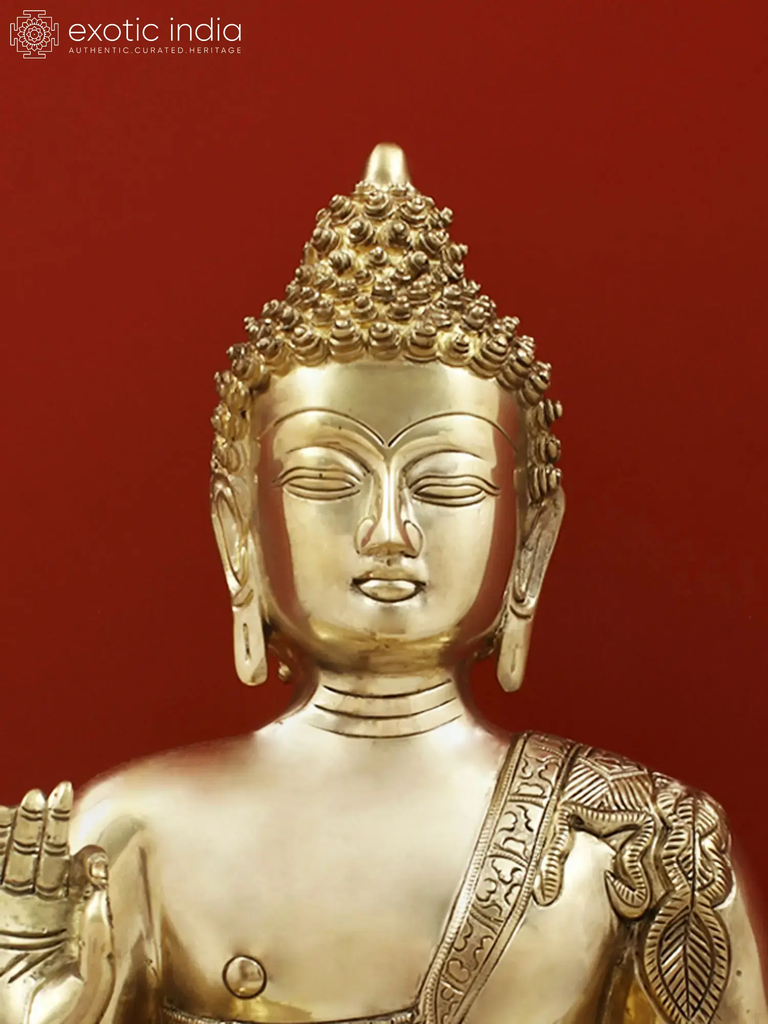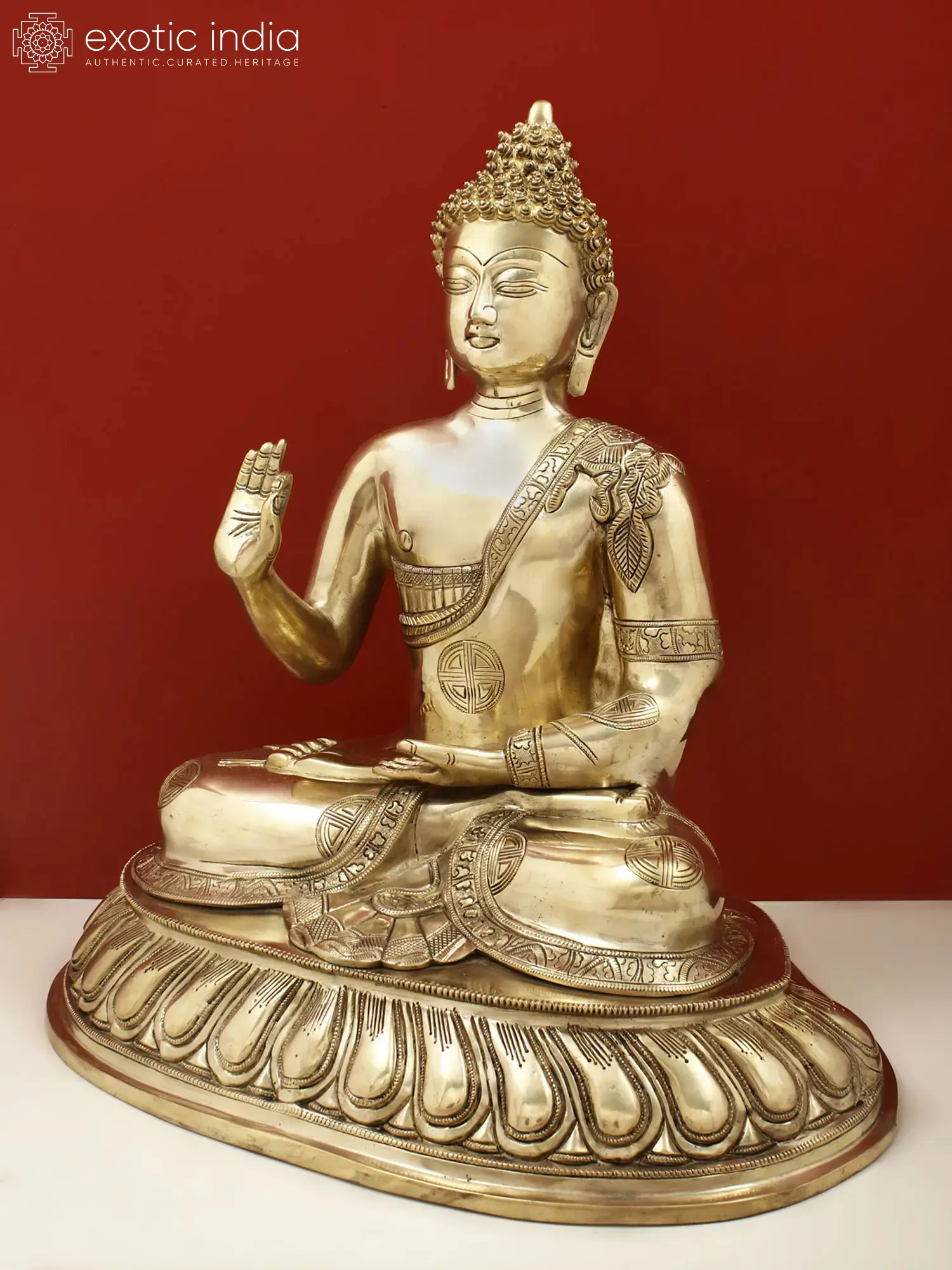 21" Blessing Buddha Seated on Lotus Throne with Sacred Symbols on His Robe In Brass | Handmade | Made In India