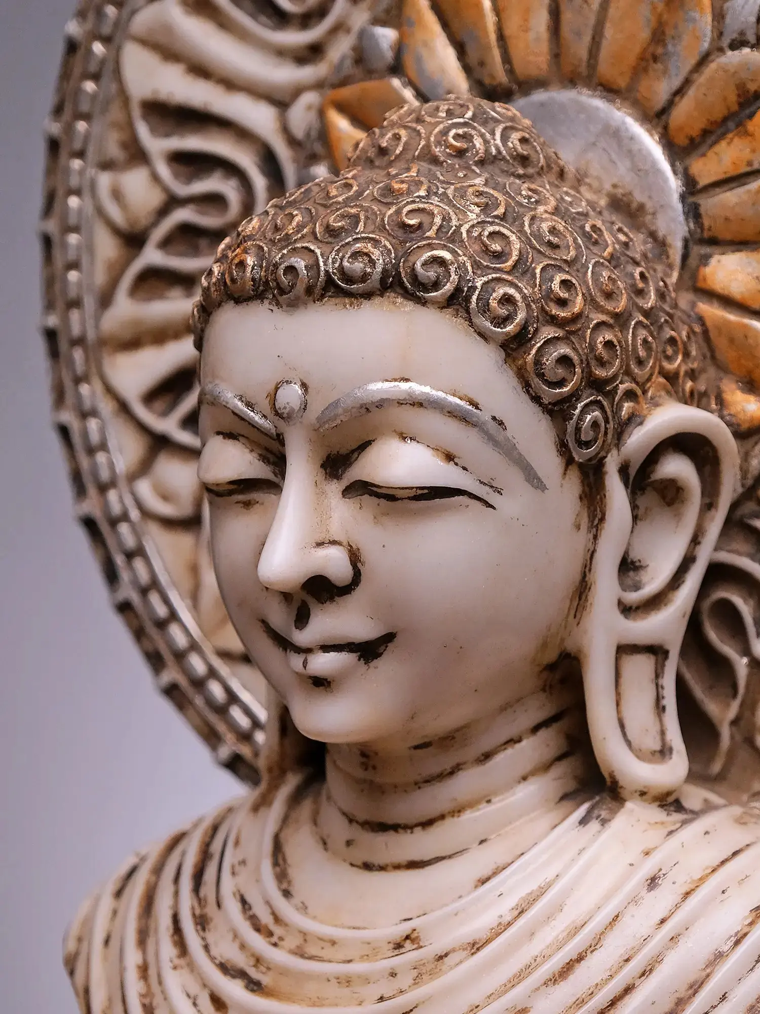 The white marble itself carries a rich cultural significance. In many traditions, marble is revered for its purity, strength, and enduring nature, making it an ideal material for depicting deities and enlightened figures. The choice of white marble evokes the purity of the Buddha's teachings and the clarity of his path to liberation. Sculptures of Buddha have been central to Buddhist art and practice for millennia, serving as focal points for meditation, devotion, and as reminders of the potential for enlightenment within all beings. This bust, with its blend of serene artistry and symbolic depth, invites contemplation and brings a sense of peace and spiritual grounding to any space it graces. It is a testament to the enduring power of Buddhist art to inspire and uplift the human spirit, carrying forth the timeless message of compassion and wisdom from the life of the Sakyamuni Buddha.