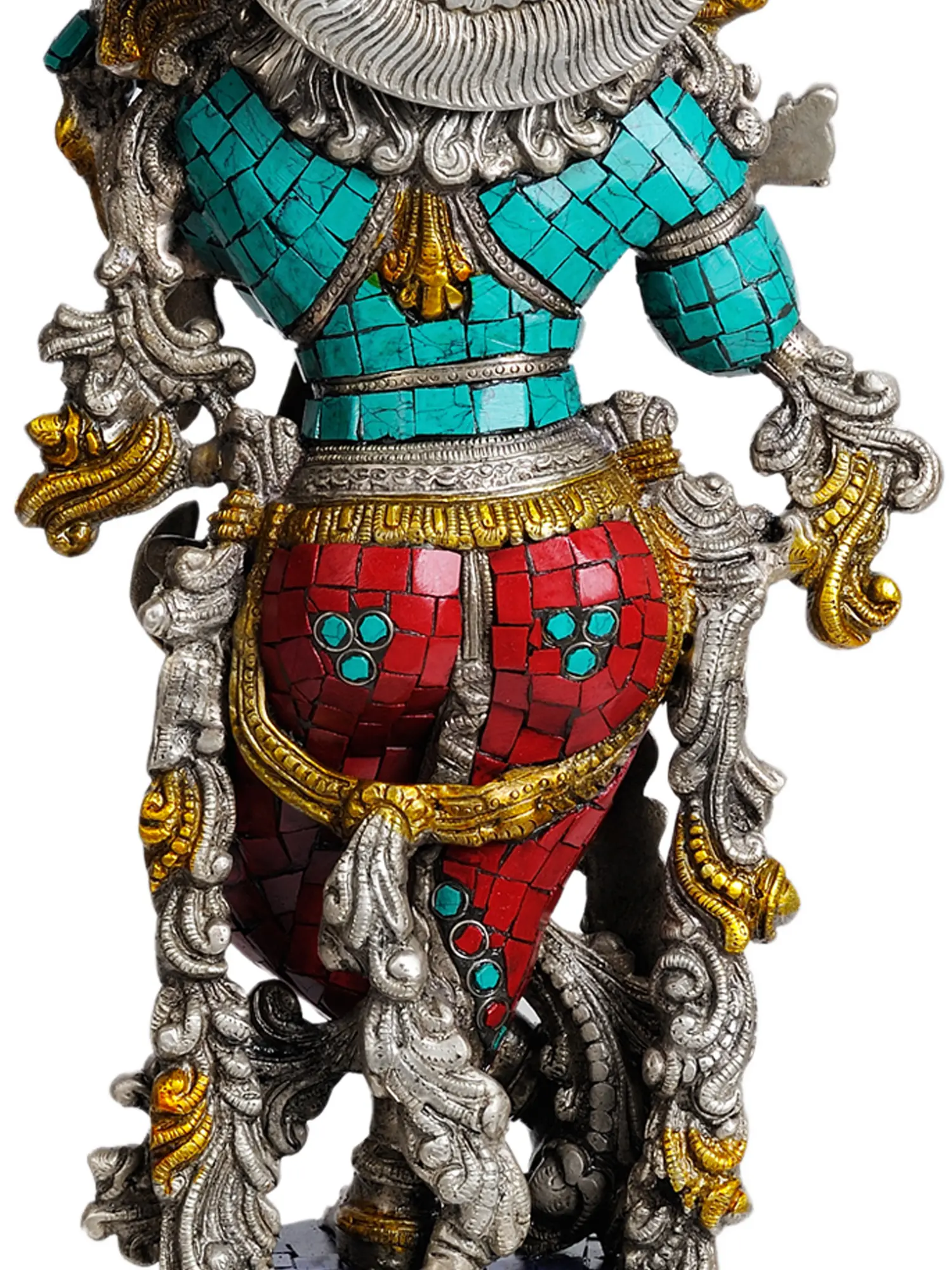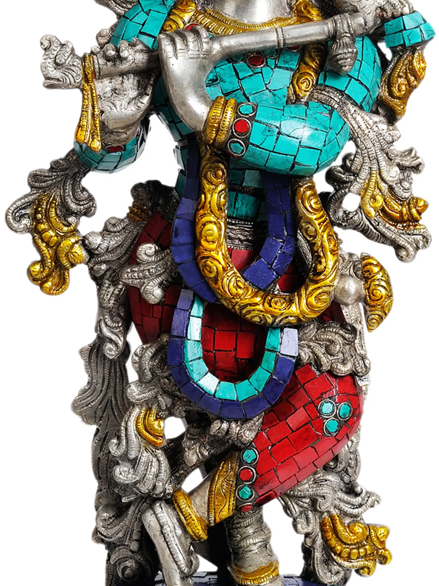 Observe the way Krishna is poised, one leg gracefully bent, as he brings the flute to his lips. This iconic pose, known as *Tribhanga*, emphasizes the fluidity and elegance of his form. The silver-toned brass casts a unique light, enhancing the intricate detailing of his clothing and jewelry, each piece thoughtfully placed. The colorful inlay adds vibrancy and life, reflecting the joyous and dynamic nature of Krishna's personality. From the elaborately styled hair to the serene expression on his face, every aspect is rendered with devotion and artistic skill. This statue serves not just as a decorative object, but as a focal point for meditation, prayer, and spiritual reflection.
