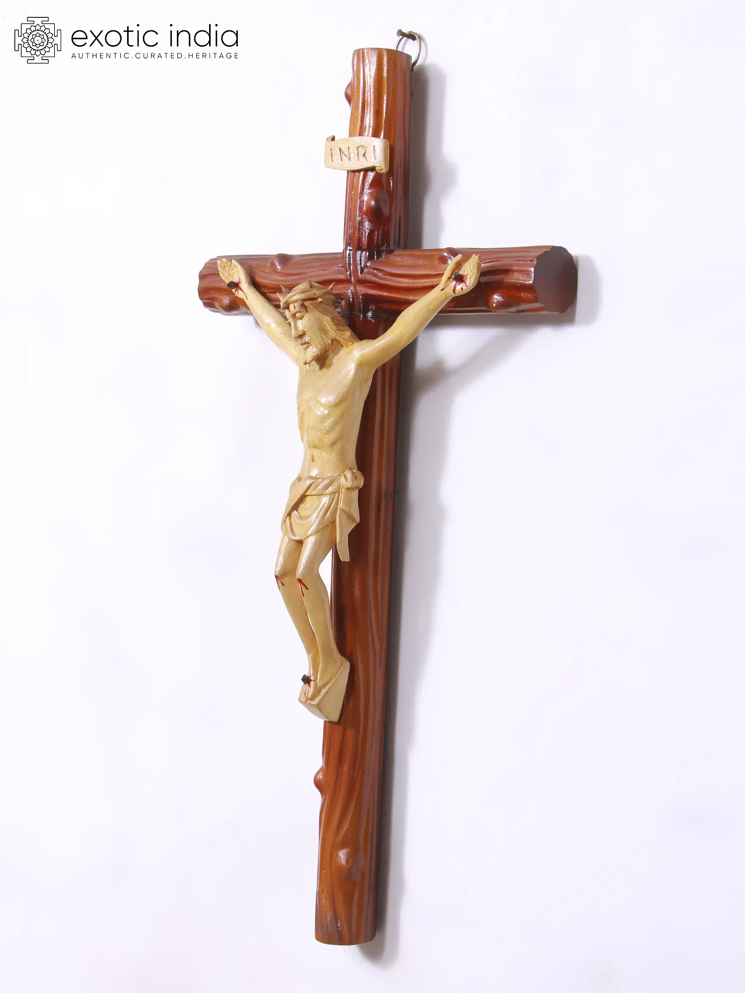 This exquisite wooden crucifix, standing at 21 inches, is a profound representation of one of history's most significant figures. Crafted with meticulous care by skilled artisans, it embodies both deep religious devotion and exceptional artistry. The natural beauty of the wood is enhanced by a rich, warm finish that brings out the grain and texture, creating a piece that is as visually appealing as it is spiritually resonant.