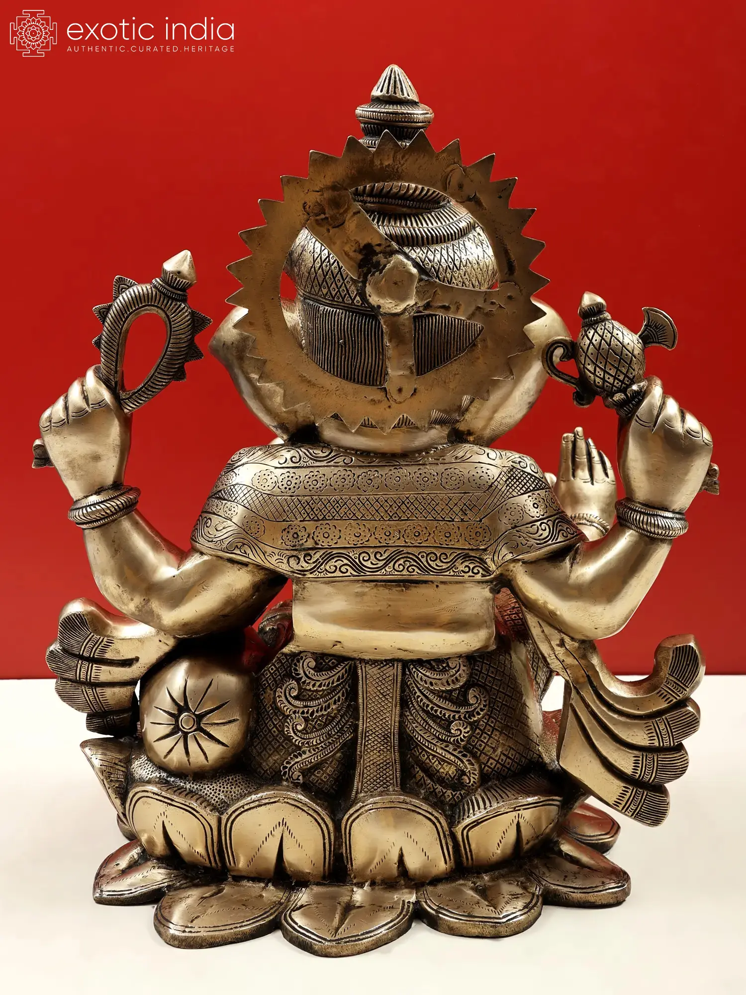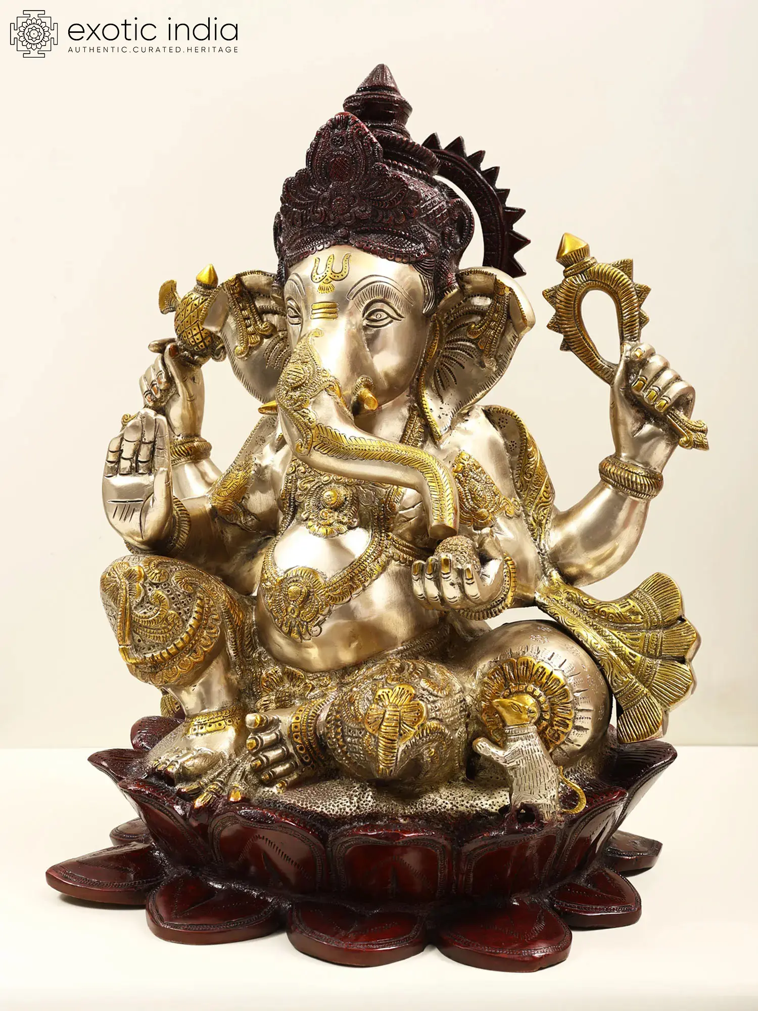 A seated Ganpati statue. Fashioned from pure brass, and sizeable to look good in your lawn or garden outdoors. A colour palette that comprises shades and tints of gold that would look great in both natural and artificial lighting. In other words, the brass Ganesha sculpture that you see on this page is a versatile composition.