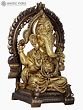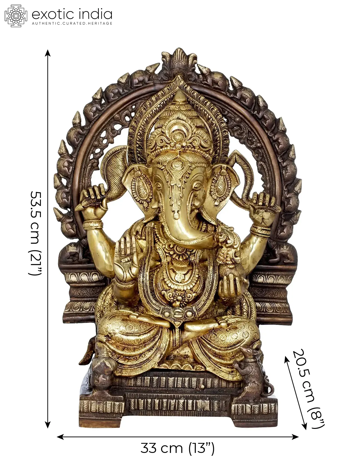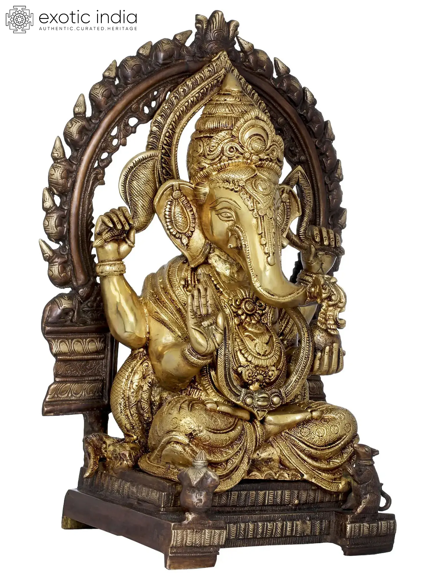 The Large-Sized Enthroned Ganesha Statue in Brass is a regal masterpiece. Lord Ganesha, in his Chaturbhuj form, sits beneath an aureole of Mushaks, signifying auspicious beginnings and overcoming obstacles. Crafted with the finest red and gold lacquer finish, this statue exudes opulence. Ganesha's blessings are embodied through his noose, elephant goad, broken tusk, and Modak, making it a majestic addition to any sacred space or decor, invoking divine presence and success.