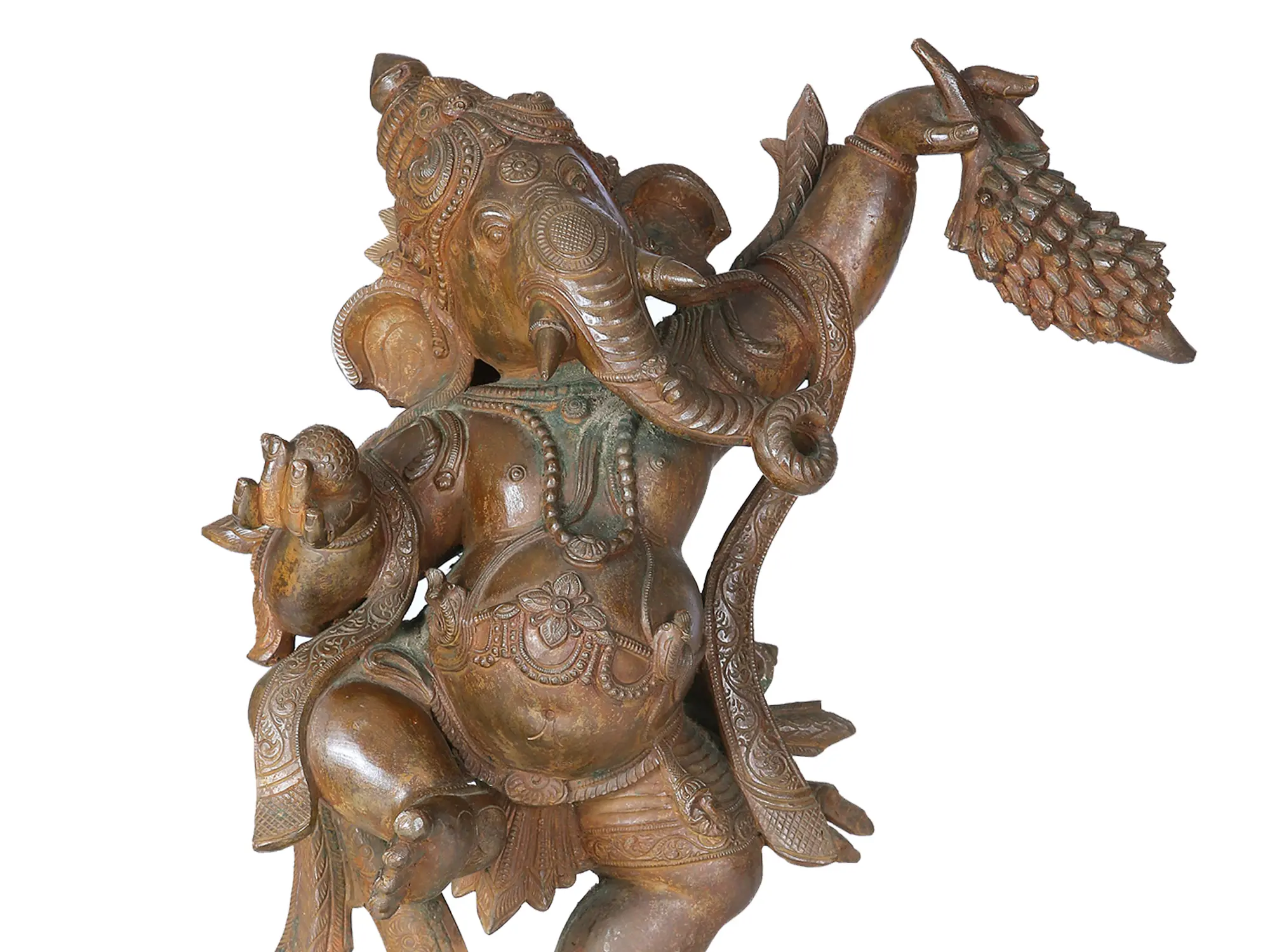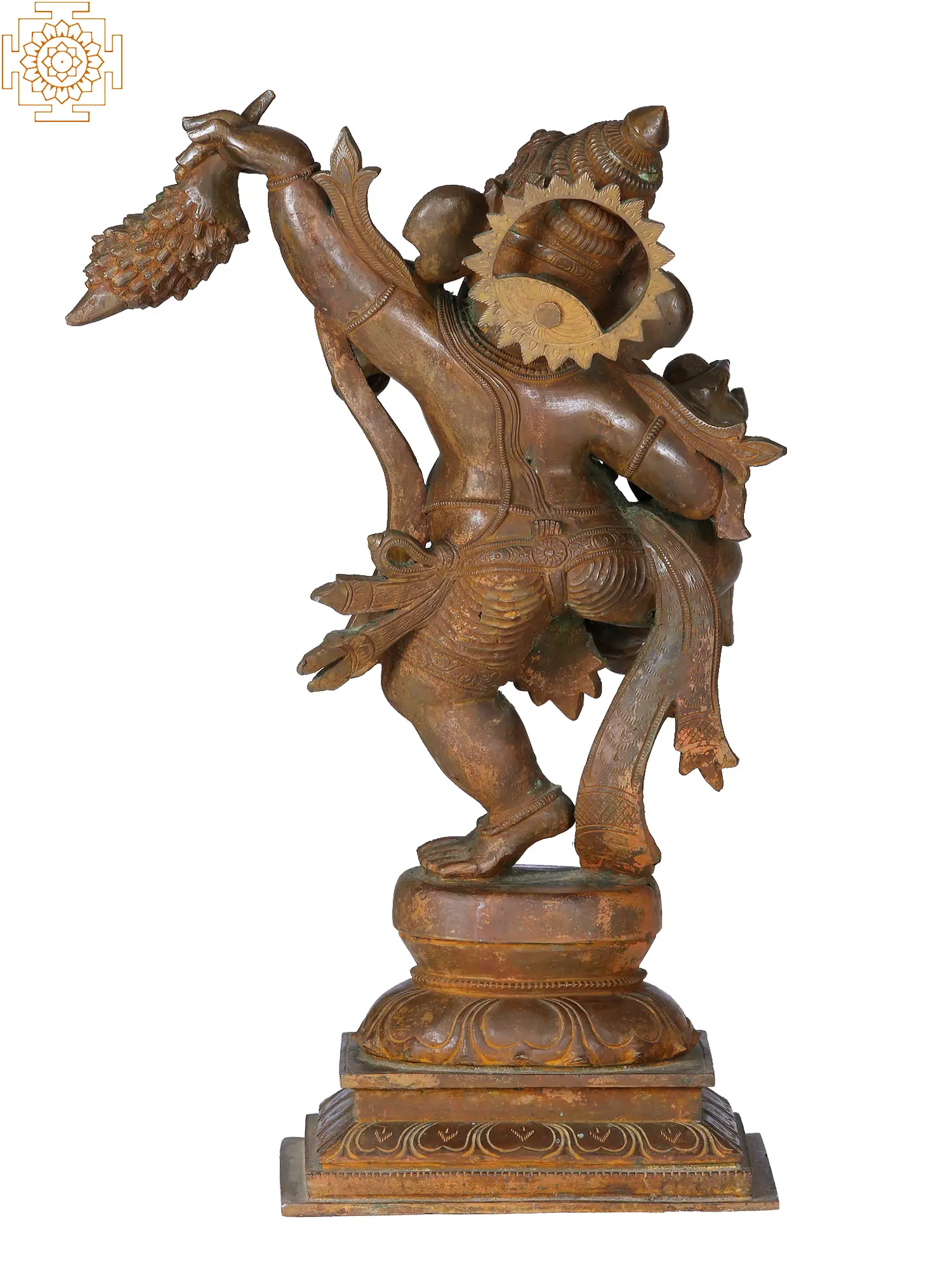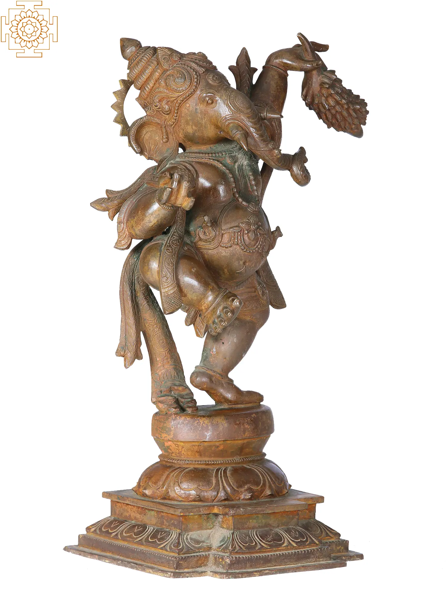 In the ethereal realm of divine grace, Lord Ganesha, the benevolent harbinger of auspicious beginnings, manifests in a mesmerising dance upon a celestial lotus pedestal. Gracefully swaying to the cosmic rhythms, His majestic form is adorned in regal attire, a celestial spectacle of divine elegance. In Hishands, He carries symbols of abundance—a bunch of bananas representing earthly sustenance, and prosperity, and Modak, the sweet embodiment of celestial wisdom. This divine dance encapsulates the essence of Lord Ganesha as the cosmic dancer, orchestrating the symphony of creation with sublime finesse.
