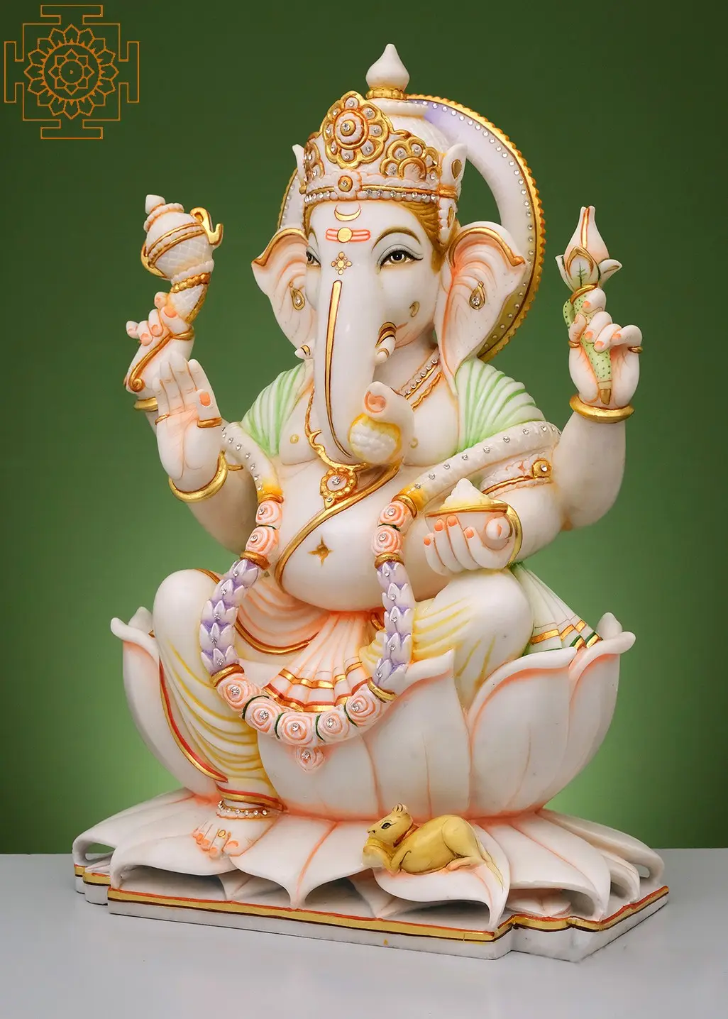 Welcome the divine presence of Lord Ganesha into your home with this exquisite handmade statue, meticulously carved from pure white marble. Lord Ganesha, the beloved elephant-headed deity, is revered as the god of wisdom, intellect, prosperity, and the remover of all obstacles. His serene countenance and graceful posture on a blooming lotus signify purity, enlightenment, and spiritual growth. This statue captures the essence of Mahaganpati, one of Ganesha's most powerful and benevolent forms, radiating an aura of peace and auspiciousness.