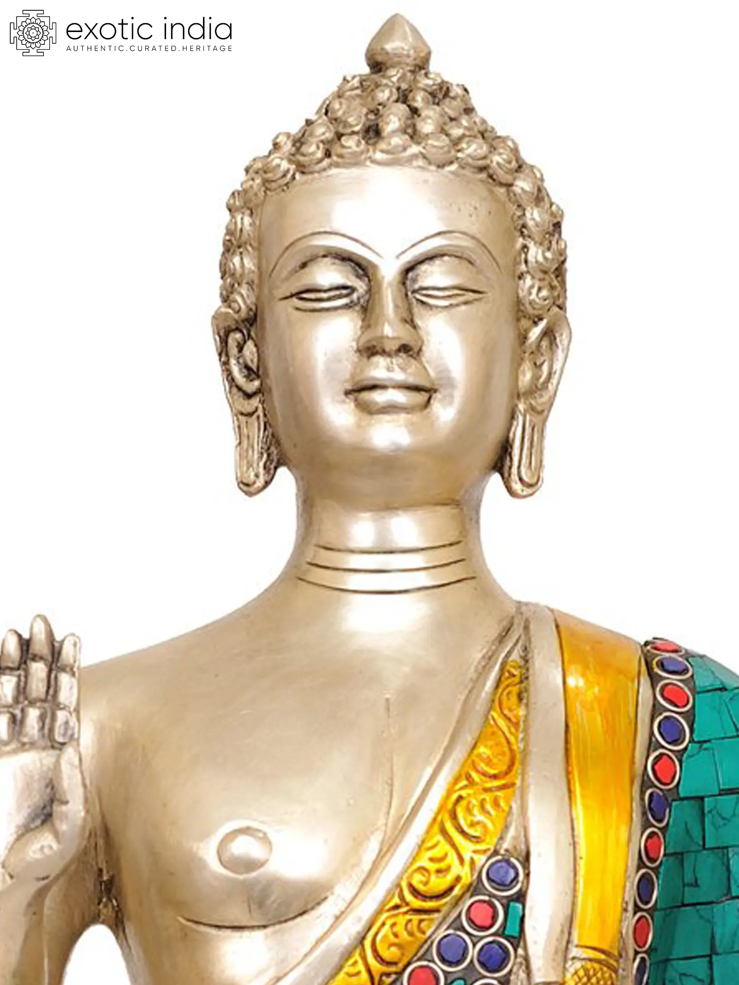 This magnificent brass statue captures the serene countenance and graceful posture of the Buddha, a figure synonymous with peace, wisdom, and compassion. Standing tall, the Buddha is depicted in a contemplative stance, his right hand raised in the Abhaya Mudra, a gesture of fearlessness and reassurance. This ancient symbol signifies protection, dispelling fear and offering solace to all beings. The gentle smile gracing his lips and the serene closure of his eyes evoke a profound sense of inner tranquility, inviting the viewer to experience a similar state of mindfulness and calm.