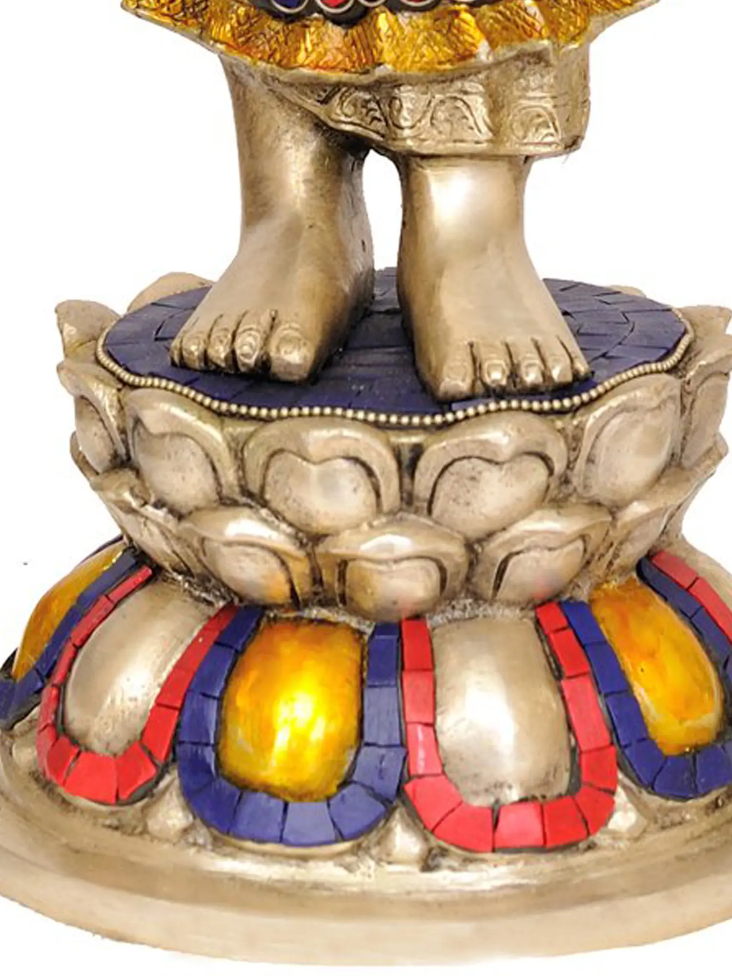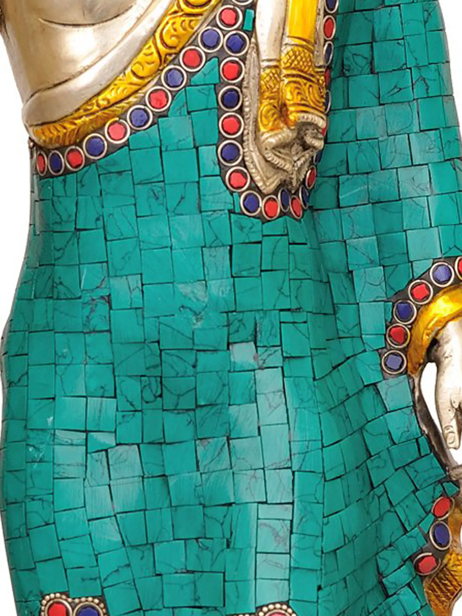 The artistry of this piece is further elevated by its remarkable inlay work. The Buddha's robe is a tapestry of vibrant teal-colored stones, meticulously arranged to form a mosaic of stunning visual appeal. These stones, reminiscent of lapis lazuli or turquoise, add a touch of celestial beauty, symbolizing the vastness of the heavens and the boundless nature of consciousness. Accents of deep blue and rich red stones, set within intricate golden borders, further enhance the regal splendor of the garment. The golden trim, fashioned with exquisite detail, suggests the richness of spiritual wealth and the preciousness of the teachings. The craftsmanship is evident in every curve and contour, from the subtle modeling of the Buddha's physique to the delicate rendering of his monastic attire.