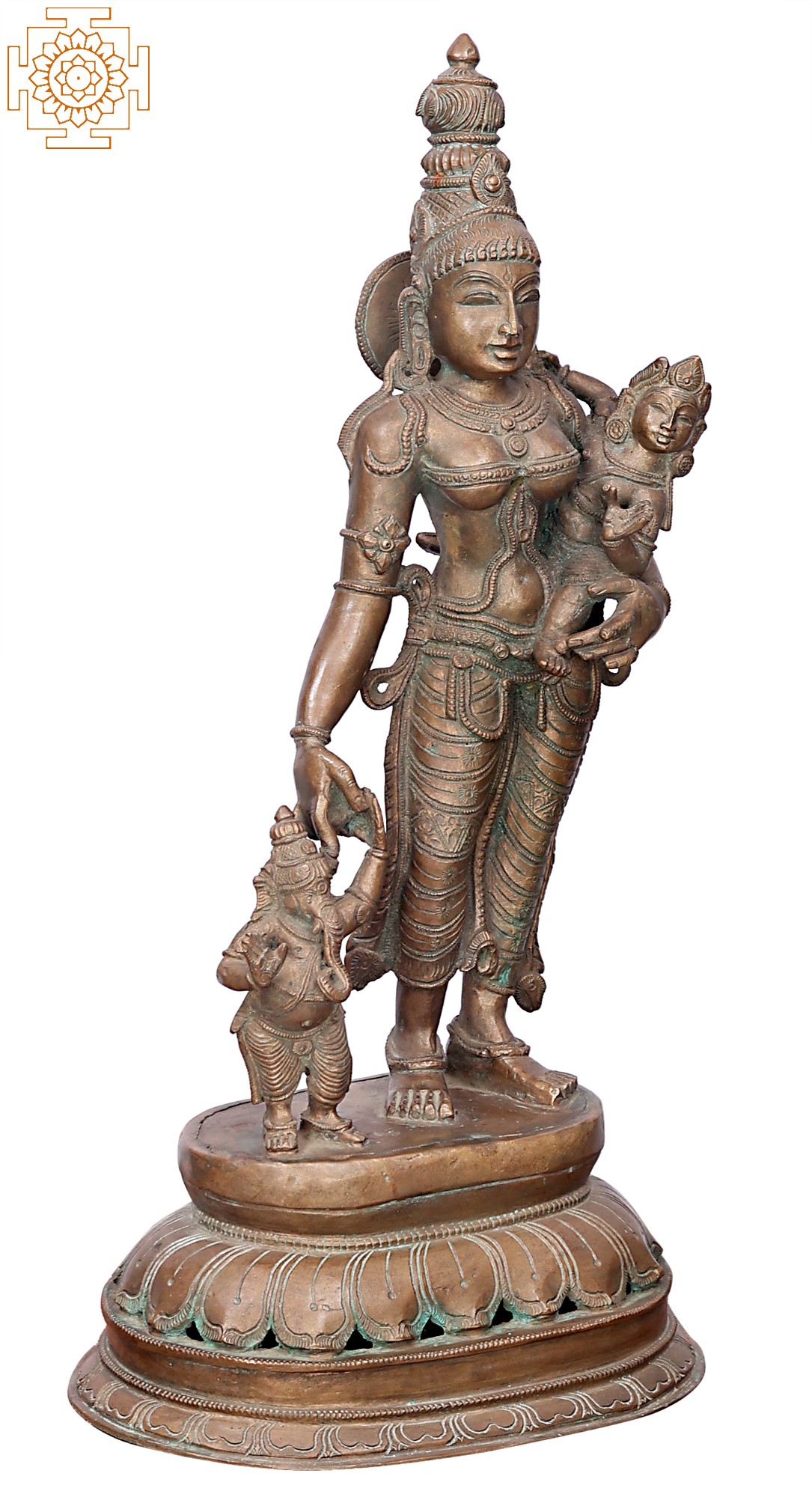 21 Standing Parvati with Baby Ganesha and Karttikeya | Handmade | Madhuchista Vidhana (Lost-Wax) | Panchaloha Bronze from Swamimalai"