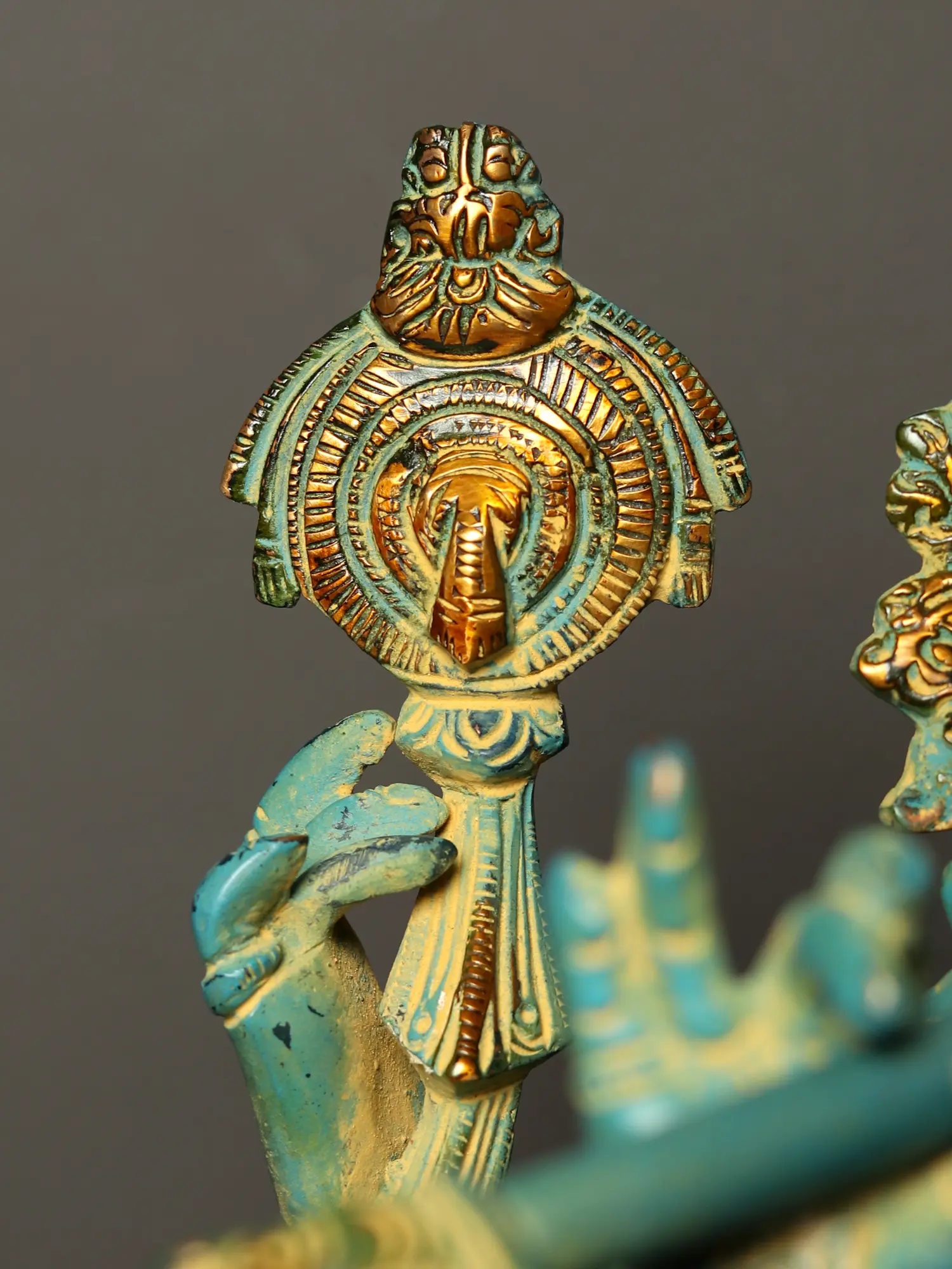 Sculpted from pure brass the colour of resplendent gold. Tall, slender silhouette; not unlike the flute pressed to His lips. Harmony and compassion writ large on the divine countenance. Framed by a Kirtimukham crown and laterally extending sprigs of vine and, of course, a halo.