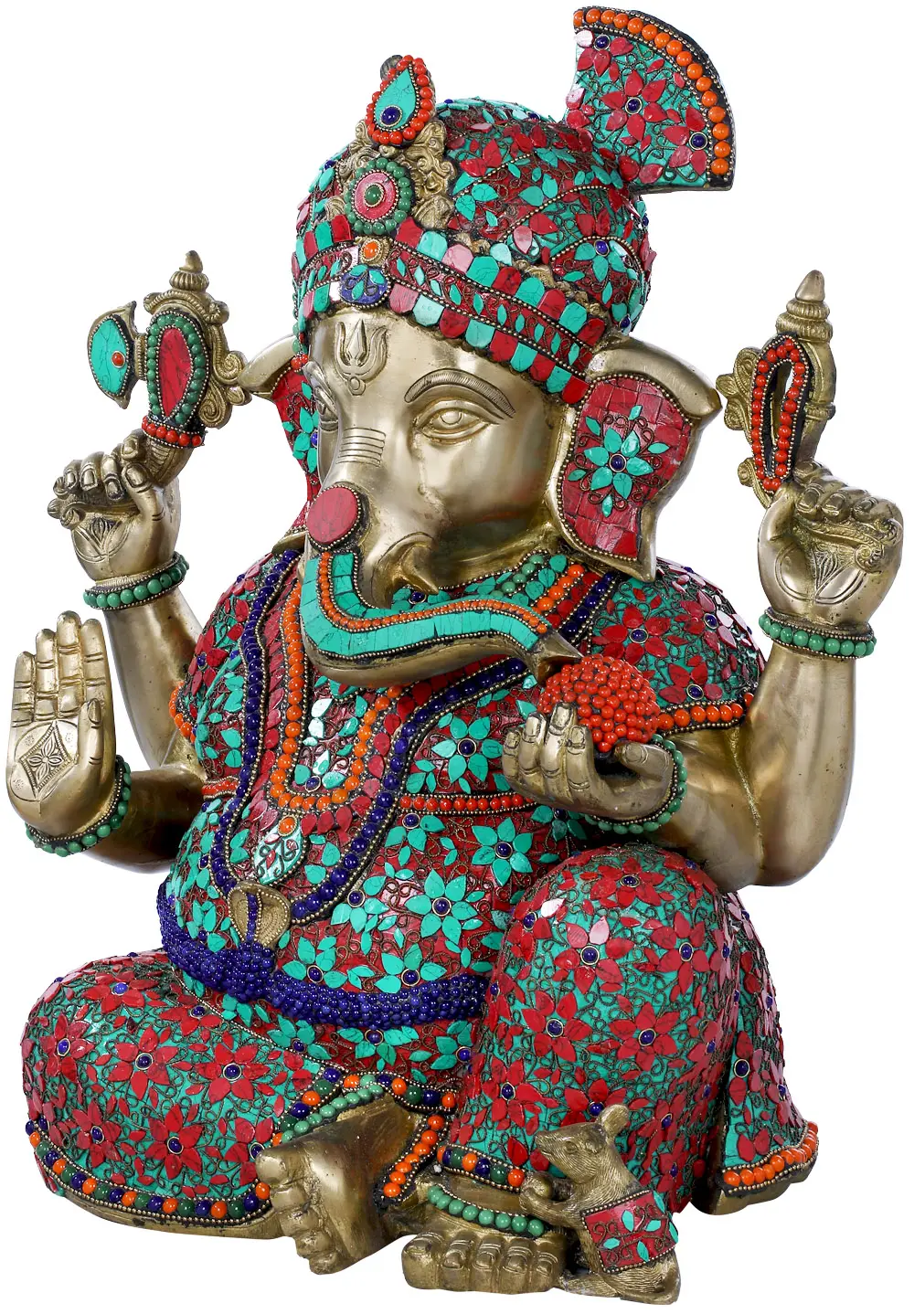 The entire form of Ganesha is richly embellished with a symphony of colored stones and intricate detailing. The teal and coral tones create a striking contrast against the warm brass, making this statue a truly captivating centerpiece. This stunning work of art is more than just an idol; it is a visual representation of divine grace and auspiciousness. Ganesha’s gentle gaze and serene posture invite contemplation and peace, while the vibrant adornments symbolize the abundance and joy he bestows upon his followers. The presence of his loyal vahana, the mouse (mushika), at his feet, represents his control over ego and his ability to navigate the smallest and most hidden paths, reminding us that with divine grace, no obstacle is too great. This handmade masterpiece, originating from India, is a fusion of spiritual devotion and artistic excellence, designed to bring blessings and beauty into your sacred space.