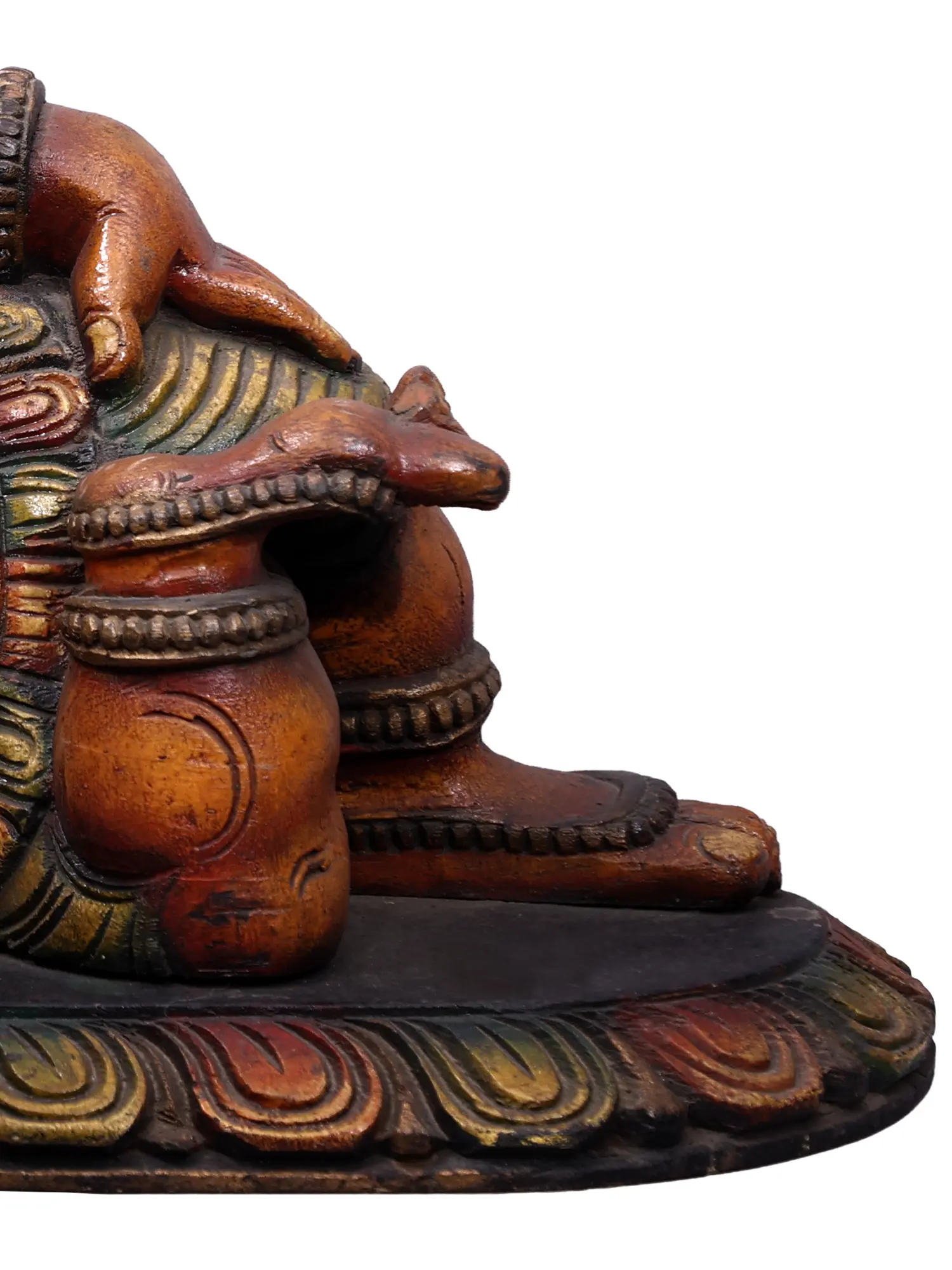 Invite divine grace and prosperity into your space with this exquisitely carved wooden representation of Lord Ganesha. Resting in a relaxed, reclining posture, this statue captures the multifaceted nature of the beloved elephant-headed deity. The rich, warm tones of the wood, enhanced by subtle hand-painted accents, lend an air of antiquity and reverence. Each detail, from the gentle curve of his trunk to the serene expression on his face, speaks of the artistic mastery involved in its creation.