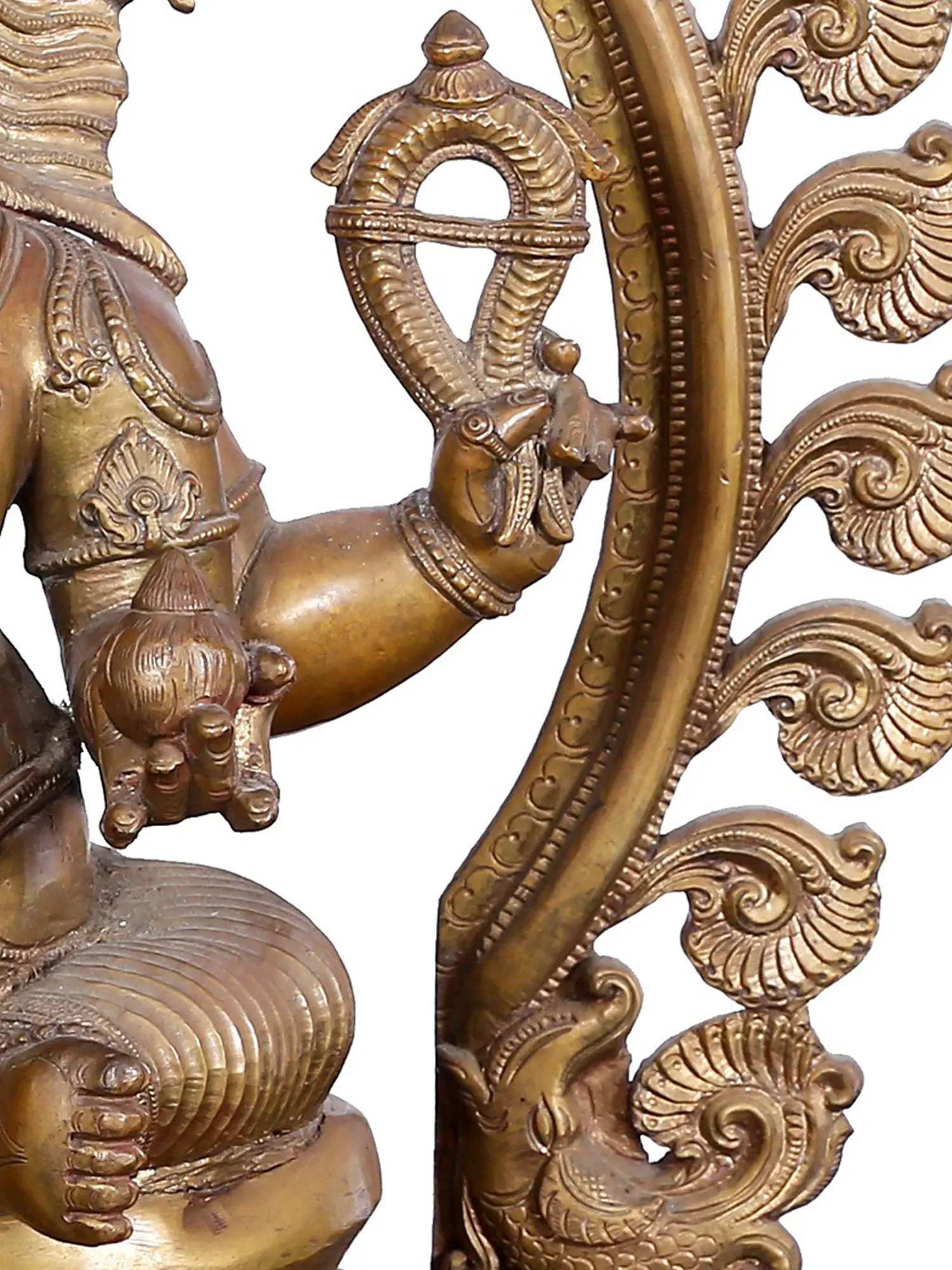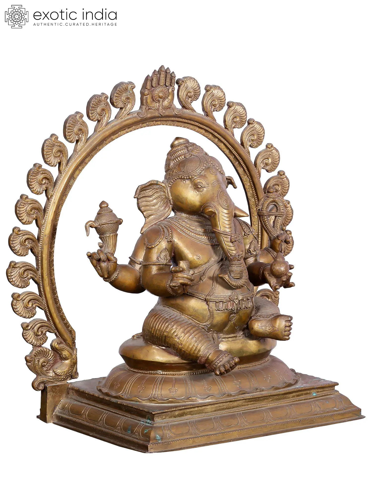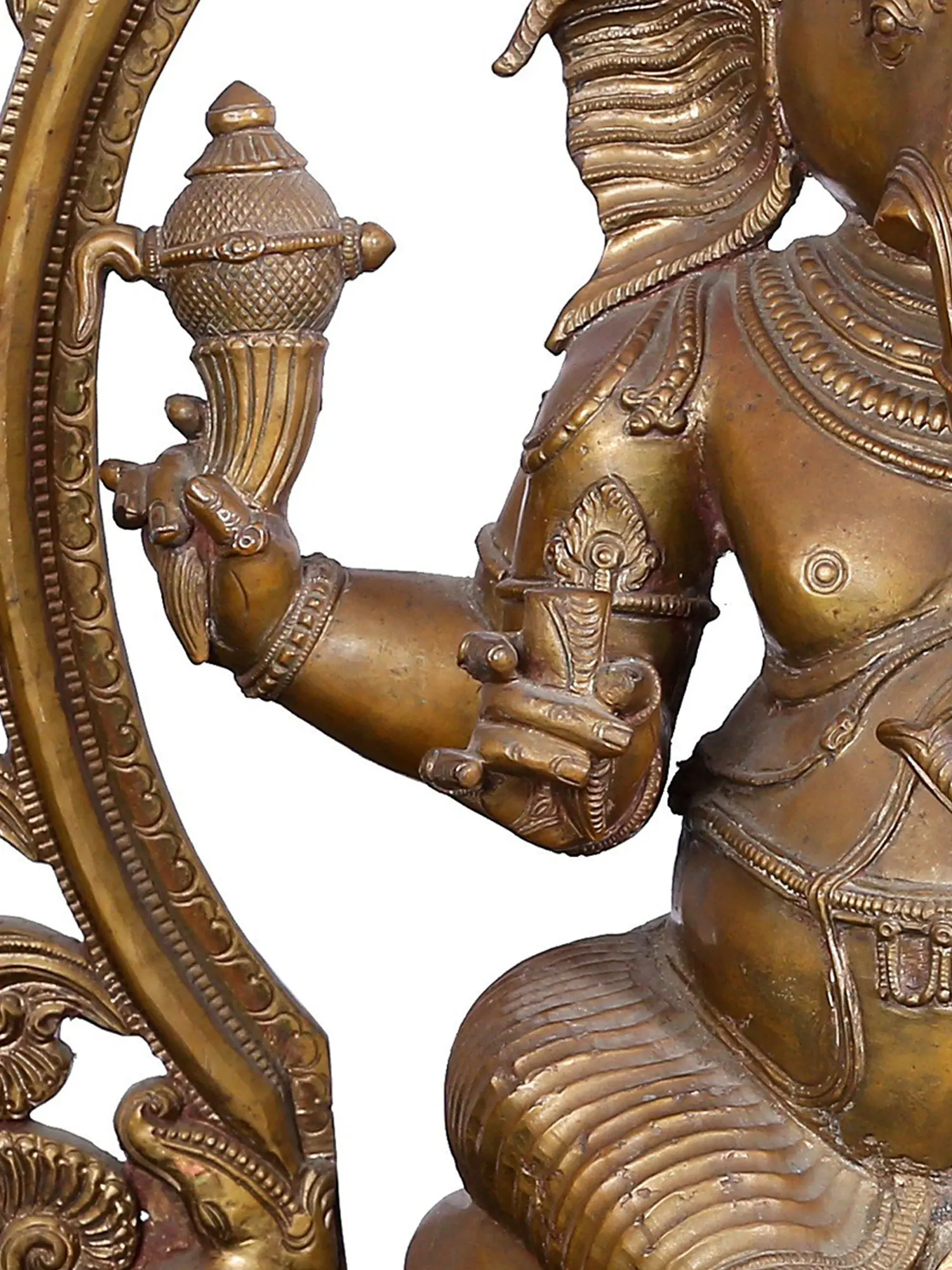 Seated on a meticulously detailed throne, surrounded by an aura of divine splendor, Lord Ganesha in this Panchaloha murti embodies all exquisiteness and auspiciousness of the three realms. His presence is marked by an imposing aureole attached to his inverted lotus seat, intricately embellished with fine incised lines.