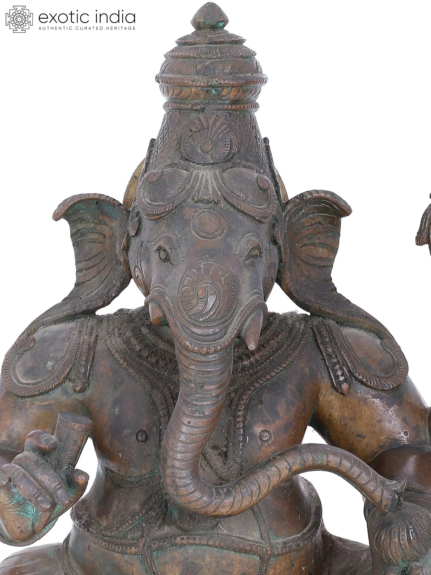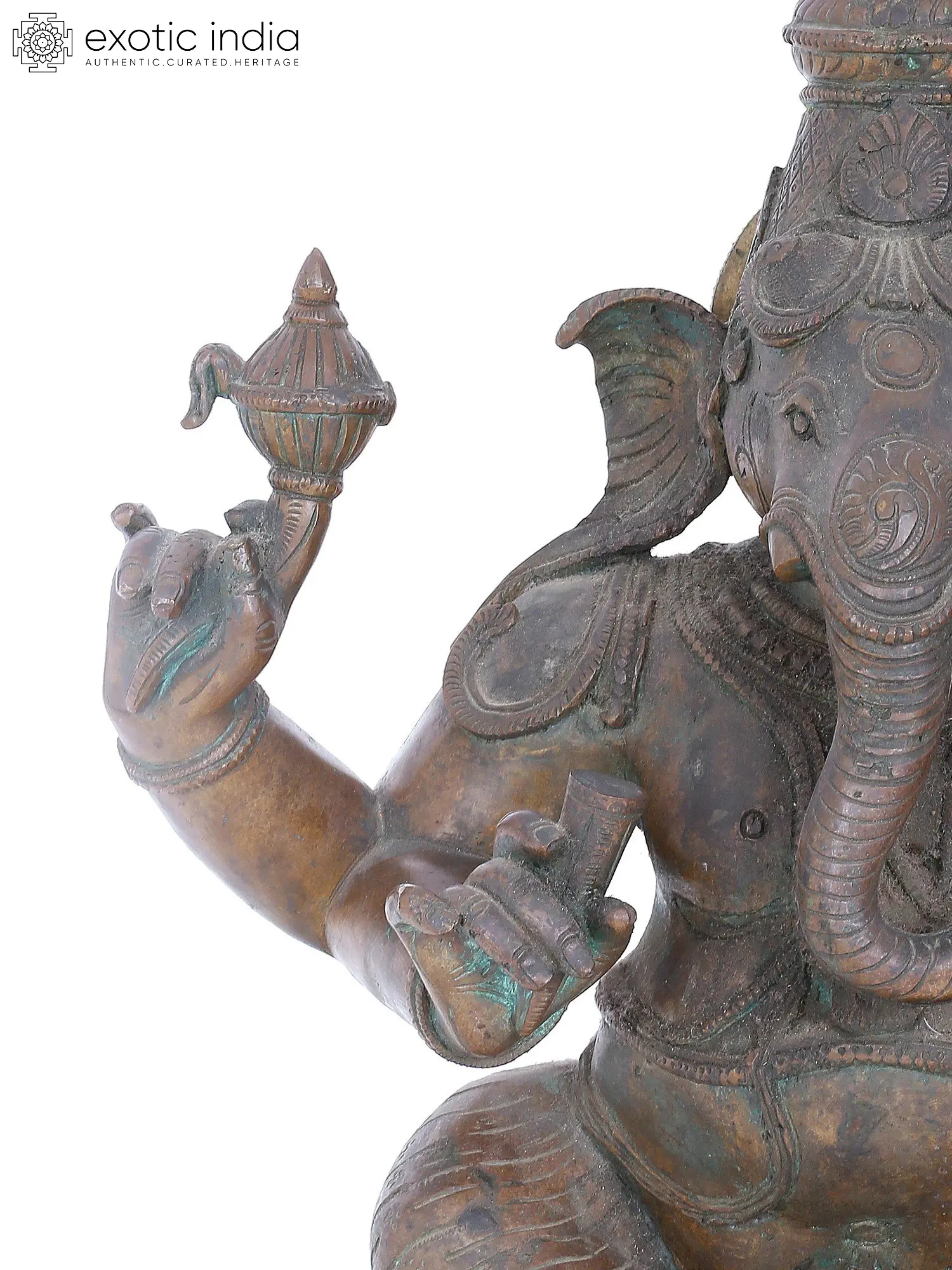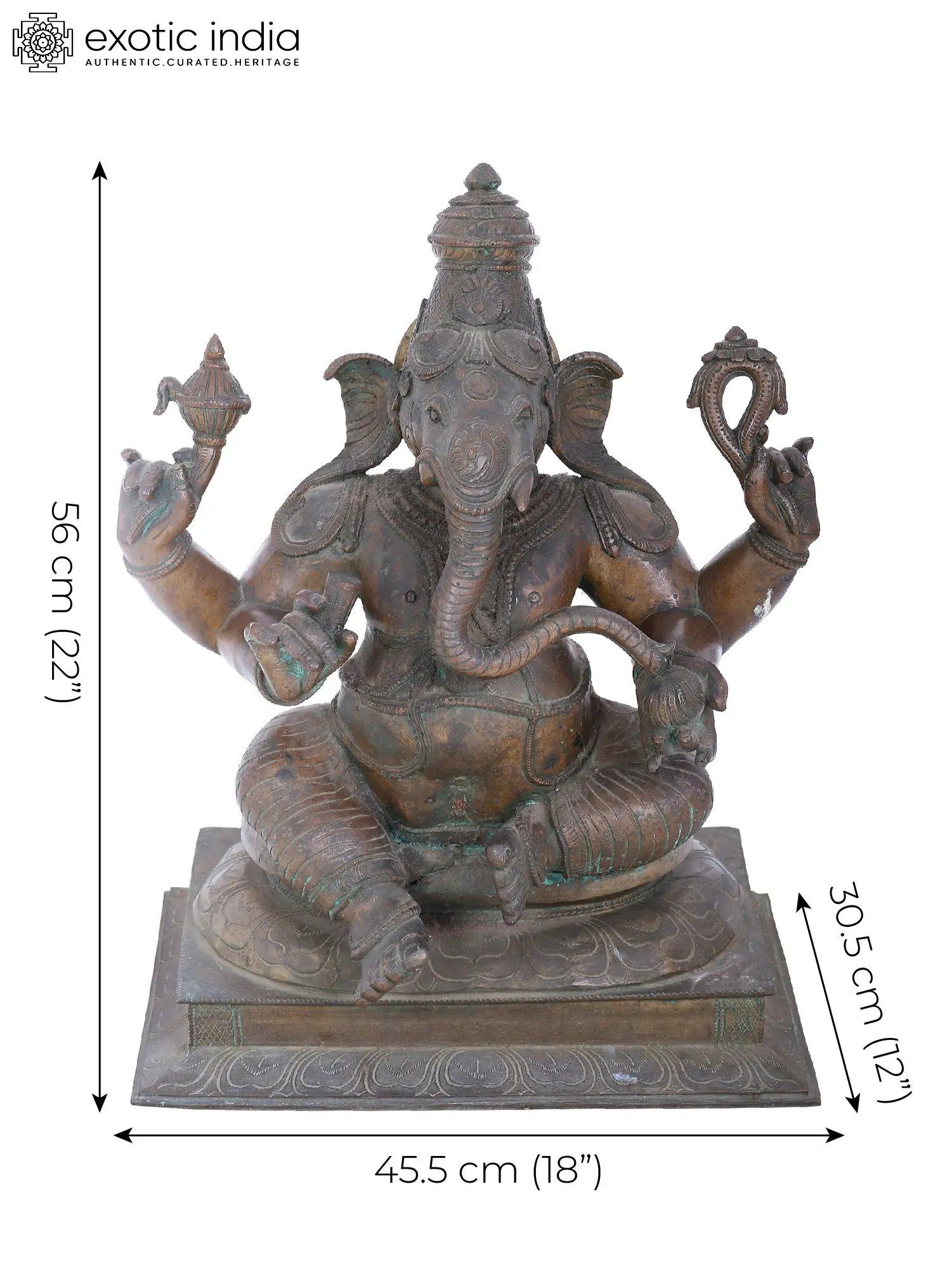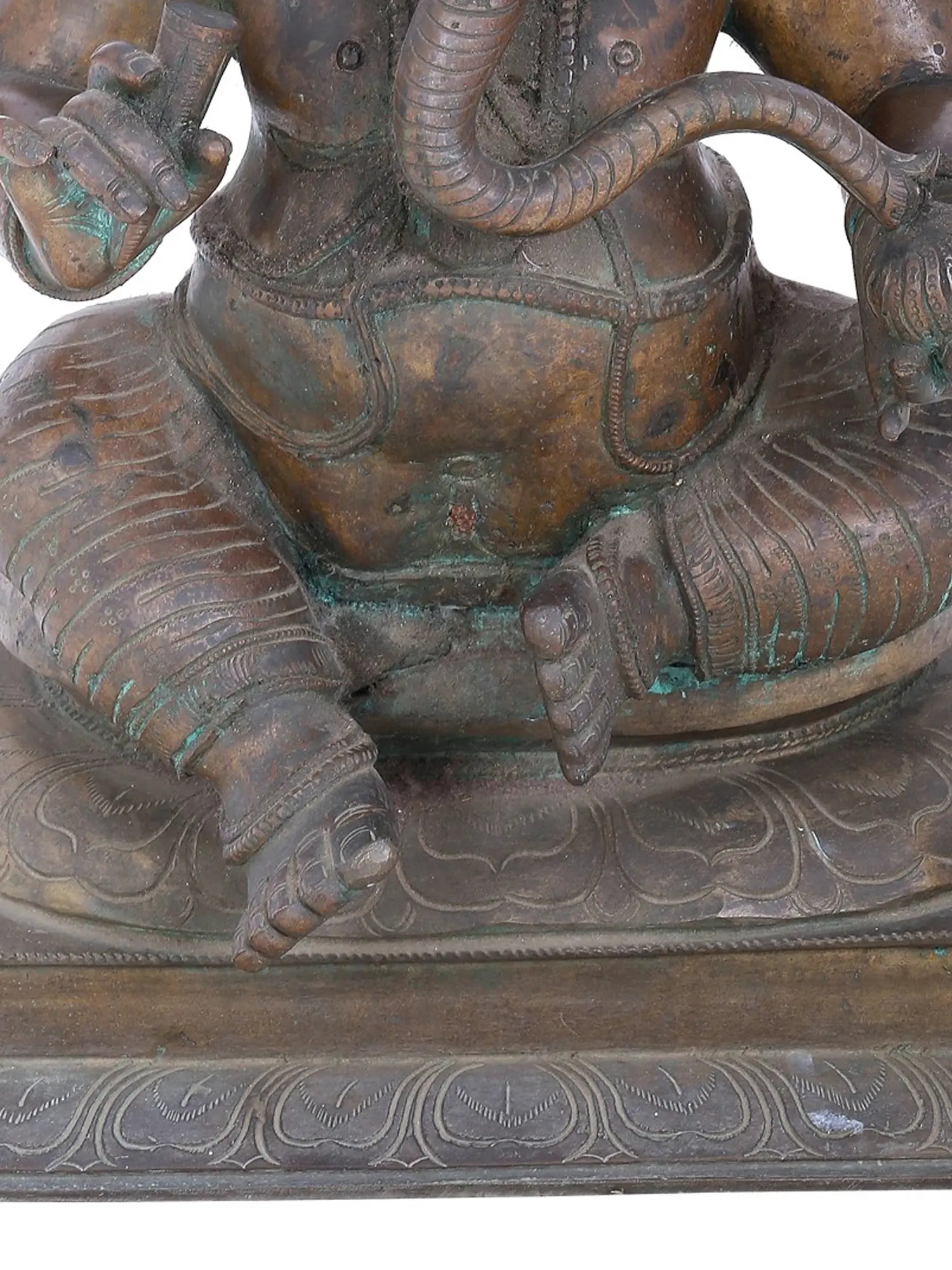Lord Ganesha, the embodiment of joy and light for his devotees, sits in a composed yet playful manner. With a conch in one hand and a noose in the other, he reaches for his favorite sweet, the modak, with his trunk. His abundant belly, said to contain the entire universe, is on full display.